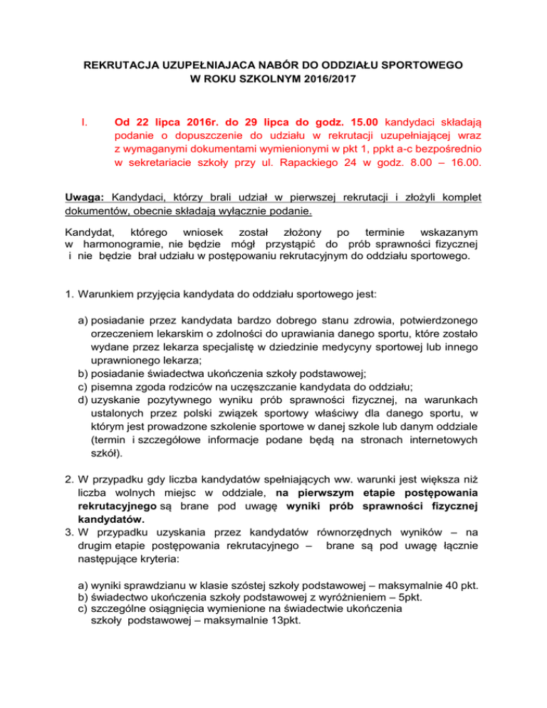 REKRUTACJA UZUPEŁNIAJACA NABÓR DO ODDZIAŁU SPORTOWEGO W ROKU SZKOLNYM 2016/2017 I. Od 22 lipca 2016r. do 29 lipca do godz. 15.00 kandydaci składają podanie o dopuszczenie do udziału w rekrutacji uzupełniającej wraz z wymaganymi dokumentami wymienionymi w pkt 1, ppkt a-c bezpośrednio w sekretariacie szkoły przy ul. Rapackiego 24 w godz. 8.00 – 16.00. Uwaga: Kandydaci, którzy brali udział w pierwszej rekrutacji i złożyli komplet dokumentów, obecnie składają wyłącznie podanie. Kandydat, którego wniosek został złożony po terminie wskazanym w harmonogramie, nie będzie mógł przystąpić do prób sprawności fizycznej i nie będzie brał udziału w postępowaniu rekrutacyjnym do oddziału sportowego. 1. Warunkiem przyjęcia kandydata do oddziału sportowego jest: a) posiadanie przez kandydata bardzo dobrego stanu zdrowia, potwierdzonego orzeczeniem lekarskim o zdolności do uprawiania danego sportu, które zostało wydane przez lekarza specjalistę w dziedzinie medycyny sportowej lub innego uprawnionego lekarza; b) posiadanie świadectwa ukończenia szkoły podstawowej; c) pisemna zgoda rodziców na uczęszczanie kandydata do oddziału; d) uzyskanie pozytywnego wyniku prób sprawności fizycznej, na warunkach ustalonych przez polski związek sportowy właściwy dla danego sportu, w którym jest prowadzone szkolenie sportowe w danej szkole lub danym oddziale (termin i szczegółowe informacje podane będą na stronach internetowych szkół). 2. W przypadku gdy liczba kandydatów spełniających ww. warunki jest większa niż liczba wolnych miejsc w oddziale, na pierwszym etapie postępowania rekrutacyjnego są brane pod uwagę wyniki prób sprawności fizycznej kandydatów. 3. W przypadku uzyskania przez kandydatów równorzędnych wyników – na drugim etapie postępowania rekrutacyjnego – brane są pod uwagę łącznie następujące kryteria: a) wyniki sprawdzianu w klasie szóstej szkoły podstawowej – maksymalnie 40 pkt. b) świadectwo ukończenia szkoły podstawowej z wyróżnieniem – 5pkt. c) szczególne osiągnięcia wymienione na świadectwie ukończenia szkoły podstawowej – maksymalnie 13pkt. Maksymalną liczbę punktów, za powyższe kryteria określa Rozporządzenie Ministra Edukacji Narodowej z dnia 2 listopada 2015 r. w sprawie sposobu przeliczania na punkty poszczególnych kryteriów uwzględnianych w postępowaniu rekrutacyjnym, składu i szczegółowych zadań komisji rekrutacyjnej, szczegółowego trybu i terminów przeprowadzania postępowania rekrutacyjnego oraz postępowania uzupełniającego (Dz. U. z 2015 r. poz. 1942) 1. W przypadku równorzędnych wyników uzyskanych na drugim etapie postępowania rekrutacyjnego, na trzecim etapie postępowania rekrutacyjnego są brane pod uwagę łącznie kryteria, o których mowa w art. 20c ust. 2: a) wielodzietność rodziny kandydata; niepełnosprawność kandydata; niepełnosprawność jednego z rodziców kandydata; niepełnosprawność obojga rodziców kandydata; niepełnosprawność rodzeństwa kandydata; samotne wychowywanie kandydata w rodzinie; objęcie kandydata pieczą zastępczą. b) c) d) e) f) g) II. 1 sierpnia 2016r. /poniedziałek/ o godz. 9.00 w Publicznym Gimnazjum Nr 22 z Oddziałami Integracyjnymi im. K. Wojtyły w Radomiu przy ul. Rapackiego 24 odbędzie się próba sprawności fizycznej dla kandydatów ubiegających się o przyjęcie do oddziału sportowego. Przed przystąpieniem do próby kandydat powinien posiadać: 1. Strój sportowy odpowiedni do warunków pogodowych w dniu próby. 2. Obuwie sportowe przeznaczone do zajęć na hali sportowej i boisku ze sztuczną nawierzchnią. 3. PRÓBA SPRAWNOŚCI FIZYCZNEJ 1. SZYBKOŚĆ GRAFIKA Bieg sprinterski na dystansie 30 metrów. Start z pozycji stojącej. Początek po sygnale dźwiękowym. Próbę zawodnik wykonuje 2 razy. 2. TECHNIKA SPECJALNA (wahadłowe prowadzenie piłki) UWAGI Próba przeprowadzana jest dwukrotnie, do punktacji bierze się czas lepszego biegu. Stoper wyłączamy po minięciu linii mety. W przypadku możliwości technicznych używamy fotokomórek. Max. 10 pkt. GRAFIKA UWAGI Zawodnik ma za zadanie przeprowadzić piłkę dziewięć razy, jak najszybciej z linii startu (A) do linii mety (B). Zawodnik startuje na sygnał dźwiękowy. Czas jest zatrzymywany w momencie, gdy kandydat przekroczy linię mety. Próbę zawodnik wykonuje 2 razy. Wahadłowe prowadzenie piłki dziewięć razy (tam i z powrotem) na odcinku 4,57 m z linii A do linii B. Piłka musi być przetoczona przez linię B, po czym bez zatrzymania prowadzona do linii A. Prowadzenie piłki musi być wykonywane trzema sposobami, np. wewnętrzną częścią stopy, prostym podbiciem, zewnętrznym podbiciem. Max. 10 pkt. GRAFIKA 3. GRA Składy 5 (1+4) osobowe, gra 5/5. Czas gry to 10 minut. Ilość gier maksimum 4, minimum 2. Przerwa pomiędzy meczami 5 minut. UWAGI Boisko do piłki ręcznej lub boisko piłkarskie (18-25 m x 36-50m). Bramki do piłki ręcznej (2x3m). Oceniane elementy: - technika - taktyka - mobilność - mentalność. Max. 40 pkt. 4. KRYTERIA NABORU Egzamin PUNKTY Ocena kandydata Sprawność Ogólna i Specjalna 1. SZYBKOŚĆ. Bieg sprinterski na dystansie 30 metrów. Start z pozycji stojącej. Początek po sygnale dźwiękowym. MIARA JAKOŚCI 4,8 sek. 10 4,9 – 5,0 sek. 8 5,1 – 5,2 sek. 6 5,3 – 5,4 sek. 4 2. TECHNIKA SPECJALNA 5,5 – 5,6 sek. 2 5,7 – 5,8 sek. 1 19,0 i mniej sek. 10 19,1-23,9 sek. 8 24,0-27,9 sek. 6 28,0-29,9 sek. 4 30,0-31,0 sek. 2 31,1 i więcej sek. 1 (wahadłowe prowadzenie piłki) Zawodnik ma za zadanie przeprowadzić piłkę dziewięć razy, jak najszybciej z linii startu (A) do linii mety (B). Zawodnik startuje na sygnał dźwiękowy. Czas jest zatrzymywany w momencie, gdy kandydat przekroczy linię mety. Próbę zawodnik wykonuje 2 razy. 3. GRA 5x5. Boisko do piłki ręcznej lub boisko piłkarskie (1825 m x 36-50m). Bramki do piłki ręcznej (2x3m). Oceniane elementy: Nauczyciele oceniają zawodników w skali 