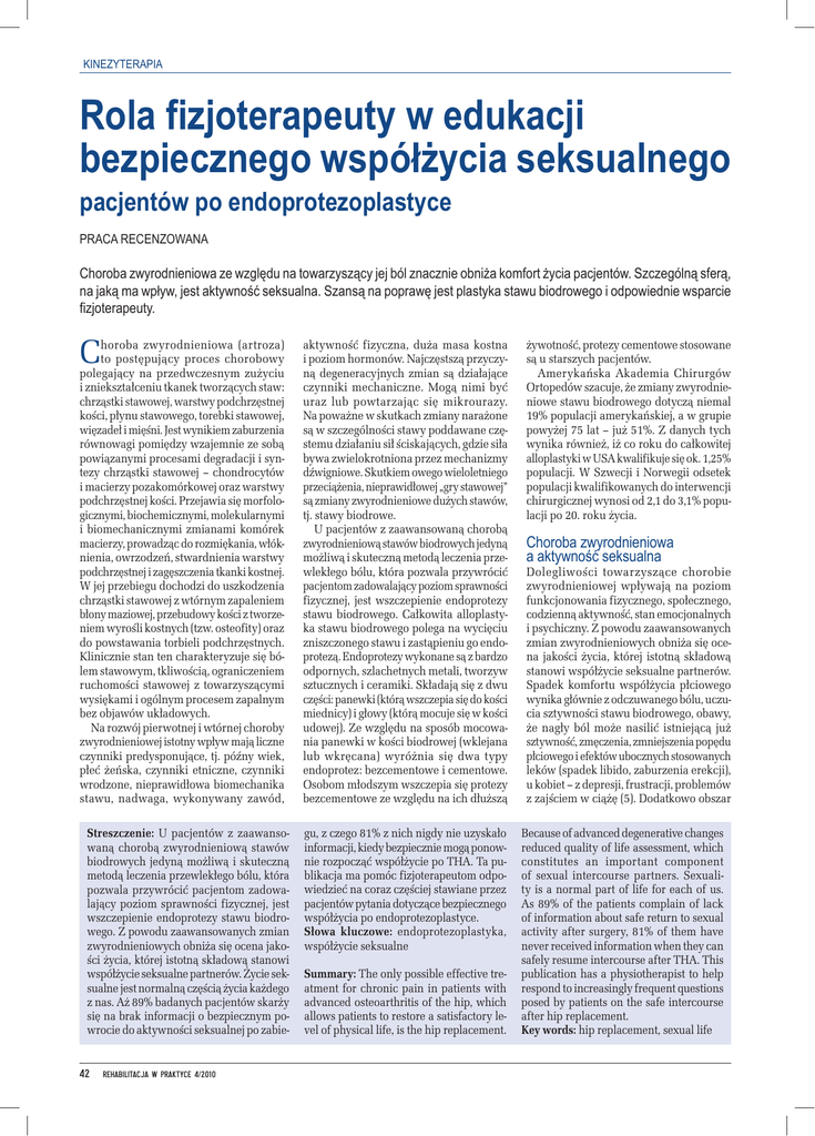 KINEZYTERAPIA Rola fizjoterapeuty w edukacji bezpiecznego współżycia seksualnego pacjentów po endoprotezoplastyce PRACA RECENZOWANA Choroba zwyrodnieniowa ze względu na towarzyszący jej ból znacznie obniża komfort życia pacjentów. Szczególną sferą, na jaką ma wpływ, jest aktywność seksualna. Szansą na poprawę jest plastyka stawu biodrowego i odpowiednie wsparcie fizjoterapeuty. C horoba zwyrodnieniowa (artroza) to postępujący proces chorobowy polegający na przedwczesnym zużyciu i zniekształceniu tkanek tworzących staw: chrząstki stawowej, warstwy podchrzęstnej kości, płynu stawowego, torebki stawowej, więzadeł i mięśni. Jest wynikiem zaburzenia równowagi pomiędzy wzajemnie ze sobą powiązanymi procesami degradacji i syntezy chrząstki stawowej – chondrocytów i macierzy pozakomórkowej oraz warstwy podchrzęstnej kości. Przejawia się morfologicznymi, biochemicznymi, molekularnymi i biomechanicznymi zmianami komórek macierzy, prowadząc do rozmiękania, włóknienia, owrzodzeń, stwardnienia warstwy podchrzęstnej i zagęszczenia tkanki kostnej. W jej przebiegu dochodzi do uszkodzenia chrząstki stawowej z wtórnym zapaleniem błony maziowej, przebudowy kości z tworzeniem wyrośli kostnych (tzw. osteofity) oraz do powstawania torbieli podchrzęstnych. Klinicznie stan ten charakteryzuje się bólem stawowym, tkliwością, ograniczeniem ruchomości stawowej z towarzyszącymi wysiękami i ogólnym procesem zapalnym bez objawów układowych. Na rozwój pierwotnej i wtórnej choroby zwyrodnieniowej istotny wpływ mają liczne czynniki predysponujące, tj. późny wiek, płeć żeńska, czynniki etniczne, czynniki wrodzone, nieprawidłowa biomechanika stawu, nadwaga, wykonywany zawód, Streszczenie: U pacjentów z zaawansowaną chorobą zwyrodnieniową stawów biodrowych jedyną możliwą i skuteczną metodą leczenia przewlekłego bólu, która pozwala przywrócić pacjentom zadowalający poziom sprawności fizycznej, jest wszczepienie endoprotezy stawu biodrowego. Z powodu zaawansowanych zmian zwyrodnieniowych obniża się ocena jakości życia, której istotną składową stanowi współżycie seksualne partnerów. Życie seksualne jest normalną częścią życia każdego z nas. Aż 89% badanych pacjentów skarży się na brak informacji o bezpiecznym powrocie do aktywności seksualnej po zabie- 42 REHABILITACJA W PRAKTYCE 4/2010 aktywność fizyczna, duża masa kostna i poziom hormonów. Najczęstszą przyczyną degeneracyjnych zmian są działające czynniki mechaniczne. Mogą nimi być uraz lub powtarzając się mikrourazy. Na poważne w skutkach zmiany narażone są w szczególności stawy poddawane częstemu działaniu sił ściskających, gdzie siła bywa zwielokrotniona przez mechanizmy dźwigniowe. Skutkiem owego wieloletniego przeciążenia, nieprawidłowej „gry stawowej” są zmiany zwyrodnieniowe dużych stawów, tj. stawy biodrowe. U pacjentów z zaawansowaną chorobą zwyrodnieniową stawów biodrowych jedyną możliwą i skuteczną metodą leczenia przewlekłego bólu, która pozwala przywrócić pacjentom zadowalający poziom sprawności fizycznej, jest wszczepienie endoprotezy stawu biodrowego. Całkowita alloplastyka stawu biodrowego polega na wycięciu zniszczonego stawu i zastąpieniu go endoprotezą. Endoprotezy wykonane są z bardzo odpornych, szlachetnych metali, tworzyw sztucznych i ceramiki. Składają się z dwu części: panewki (którą wszczepia się do kości miednicy) i głowy (którą mocuje się w kości udowej). Ze względu na sposób mocowania panewki w kości biodrowej (wklejana lub wkręcana) wyróżnia się dwa typy endoprotez: bezcementowe i cementowe. Osobom młodszym wszczepia się protezy bezcementowe ze względu na ich dłuższą gu, z czego 81% z nich nigdy nie uzyskało informacji, kiedy bezpiecznie mogą ponownie rozpocząć współżycie po THA. Ta publikacja ma pomóc fizjoterapeutom odpowiedzieć na coraz częściej stawiane przez pacjentów pytania dotyczące bezpiecznego współżycia po endoprotezoplastyce. Słowa kluczowe: endoprotezoplastyka, współżycie seksualne Summary: The only possible effective treatment for chronic pain in patients with advanced osteoarthritis of the hip, which allows patients to restore a satisfactory level of physical life, is the hip replacement. żywotność, protezy cementowe stosowane są u starszych pacjentów. Amerykańska Akademia Chirurgów Ortopedów szacuje, że zmiany zwyrodnieniowe stawu biodrowego dotyczą niemal 19% populacji amerykańskiej, a w grupie powyżej 75 lat – już 51%. Z danych tych wynika również, iż co roku do całkowitej alloplastyki w USA kwalifikuje się ok. 1,25% populacji. W Szwecji i Norwegii odsetek populacji kwalifikowanych do interwencji chirurgicznej wynosi od 2,1 do 3,1% populacji po 20. roku życia. Choroba zwyrodnieniowa a aktywność seksualna Dolegliwości towarzyszące chorobie zwyrodnieniowej wpływają na poziom funkcjonowania fizycznego, społecznego, codzienną aktywność, stan emocjonalnych i psychiczny. Z powodu zaawansowanych zmian zwyrodnieniowych obniża się ocena jakości życia, której istotną składową stanowi współżycie seksualne partnerów. Spadek komfortu współżycia płciowego wynika głównie z odczuwanego bólu, uczucia sztywności stawu biodrowego, obawy, że nagły ból może nasilić istniejącą już sztywność, zmęczenia, zmniejszenia popędu płciowego i efektów ubocznych stosowanych leków (spadek libido, zaburzenia erekcji), u kobiet – z depresji, frustracji, problemów z zajściem w ciążę (5). Dodatkowo obszar Because of advanced degenerative changes reduced quality of life assessment, which constitutes an important component of sexual intercourse partners. Sexuality is a normal part of life for each of us. As 89% of the patients complain of lack of information about safe return to sexual activity after surgery, 81% of them have never received information when they can safely