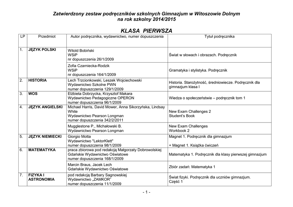 Zatwierdzony zestaw podręczników szkolnych Gimnazjum w Witoszowie Dolnym na rok szkolny 2014/2015 KLASA PIERWSZA LP 1. Przedmiot JĘZYK POLSKI 2. HISTORIA 3. WOS 4. JĘZYK ANGIELSKI 5. JĘZYK NIEMIECKI 6. MATEMATYKA 7. FIZYKA I ASTRONOMIA Autor podręcznika, wydawnictwo, numer dopuszczenia Witold Bobiński WSiP nr dopuszczenia 26/1/2009 Tytuł podręcznika Świat w słowach i obrazach. Podręcznik Zofia Czarniecka-Rodzik WSiP nr dopuszczenia 164/1/2009 Lech Trzcionkowski, Leszek Wojciechowski Wydawnictwo Szkolne PWN numer dopuszczenia 129/1/2009 Elżbieta Dobrzycka, Krzysztof Makara Wydawnictwo Pedagogiczne OPERON numer dopuszczenia 96/1/2009 Michael Harris, David Mower, Anna Sikorzyńska, Lindsay White Wydawnictwo Pearson Longman numer dopuszczenia 342/2/2011 Gramatyka i stylistyka. Podręcznik Historia. Starożytność, średniowiecze. Podręcznik dla gimnazjum klasa I Wiedza o społeczeństwie – podręcznik tom 1 New Exam Challenges 2 Student’s Book Mugglestone P., Michałowski B. Wydawnictwo Pearson Longman New Exam Challenges Workbook 2 Giorgio Motta Wydawnictwo "LektorKlett" numer dopuszczenia 98/1/2009 praca zbiorowa pod redakcją Małgorzaty Dobrowolskiej Gdańskie Wydawnictwo Oświatowe numer dopuszczenia 168/1/2009 Magnet 1. Podręcznik dla gimnazjum Marcin Braus, Jacek Lech Gdańskie Wydawnictwo Oświatowe Zbiór zadań: Matematyka 1 pod redakcją Barbary Sagnowskiej Wydawnictwo „ZAMKOR” numer dopuszczenia 11/1/2009 Świat fizyki. Podręcznik dla uczniów gimnazjum. Część 1 -1- + Magnet 1. Książka ćwiczeń Matematyka 1. Podręcznik dla klasy pierwszej gimnazjum 8. CHEMIA 9. BIOLOGIA 10. GEOGRAFIA Hanna Gulińska, Janina Smolińska WSiP numer dopuszczenia 40/1/2009 Małgorzata Jefimow, Marian Sęktas Wydawnictwo NOWA ERA numer dopuszczenia 58/1/2009 Roman Malarz Wydawnictwo NOWA ERA numer dopuszczenia 7/1/2009 Ciekawa chemia. Część 1. Podręcznik gimnazjalisty. Puls Życia 1. Podręcznik do biologii dla gimnazjum Planeta Nowa. Podręcznik do geografii dla klasy pierwszej gimnazjum. Część 1 Ewa Cwiklińska, J. Knopik Wydawnictwo NOWA ERA 11. INFORMATYKA 12. WYCHOWANIE DO ŻYCIA W RODZINIE Planeta Nowa 1. Zeszyt ćwiczeń do geografii dla klasy pierwszej gimnazjum. Informację o podręczniku nauczyciele uczący przekażą we wrześniu Wędrując ku dorosłości. Wychowanie do życia w rodzinie dla uczniów klas I-III Gimnazjum pod redakcją Teresy Król Wydawnictwo RUBIKON numer dopuszczenia 205/2011/z1 Podręcznik obowiązuje przez trzy lata Wychowanie do życia w rodzinie dla uczniów klas I Gimnazjum. Ćwiczenia – Wędrując ku dorosłości pod redakcją Teresy Król Wydawnictwo RUBIKON 13. RELIGIA pod redakcją ks. prof. J. Szpet, D. Jackowiak Wydawnictwo Święty Wojciech numer dopuszczenia AZ-31-01/10-PO-1/11 „Spotkanie ze Słowem” -2-