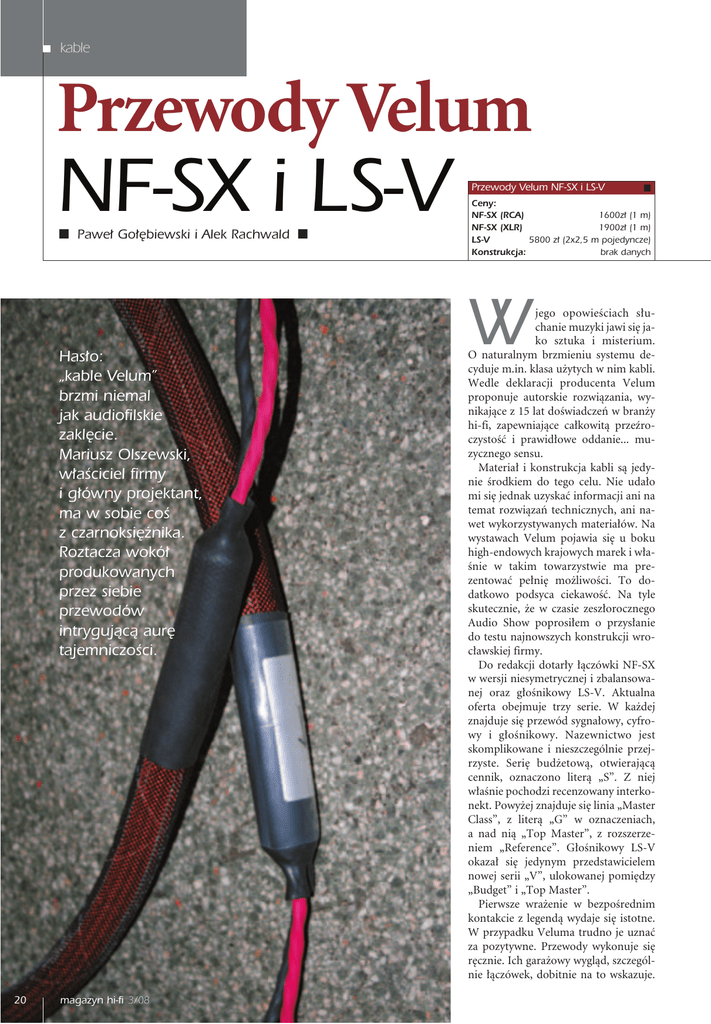 kable Przewody Velum NF-SX i LS-V ■ƒPawe∏ Go∏´biewski i Alek Rachwaldƒ■ Has∏o: „kable Velum” brzmi niemal jak audiofilskie zakl´cie. Mariusz Olszewski, w∏aÊciciel firmy i g∏ówny projektant, ma w sobie coÊ z czarnoksi´˝nika. Roztacza wokó∏ produkowanych przez siebie przewodów intrygujàcà aur´ tajemniczoÊci. 20 magazyn hi-fi 3/08 Przewody Velum NF-SX i LS-V Ceny: NF-SX (RCA) 1600z∏ (1 m) NF-SX (XLR) 1900z∏ (1 m) LS-V 5800 z∏ (2x2,5 m pojedyncze) Konstrukcja: brak danych W jego opowieÊciach s∏uchanie muzyki jawi si´ jako sztuka i misterium. O naturalnym brzmieniu systemu decyduje m.in. klasa u˝ytych w nim kabli. Wedle deklaracji producenta Velum proponuje autorskie rozwiàzania, wynikajàce z 15 lat doÊwiadczeƒ w bran˝y hi-fi, zapewniajàce ca∏kowità przeêroczystoÊç i prawid∏owe oddanie... muzycznego sensu. Materia∏ i konstrukcja kabli sà jedynie Êrodkiem do tego celu. Nie uda∏o mi si´ jednak uzyskaç informacji ani na temat rozwiàzaƒ technicznych, ani nawet wykorzystywanych materia∏ów. Na wystawach Velum pojawia si´ u boku high-endowych krajowych marek i w∏aÊnie w takim towarzystwie ma prezentowaç pe∏ni´ mo˝liwoÊci. To dodatkowo podsyca ciekawoÊç. Na tyle skutecznie, ˝e w czasie zesz∏orocznego Audio Show poprosi∏em o przys∏anie do testu najnowszych konstrukcji wroc∏awskiej firmy. Do redakcji dotar∏y ∏àczówki NF-SX w wersji niesymetrycznej i zbalansowanej oraz g∏oÊnikowy LS-V. Aktualna oferta obejmuje trzy serie. W ka˝dej znajduje si´ przewód sygna∏owy, cyfrowy i g∏oÊnikowy. Nazewnictwo jest skomplikowane i nieszczególnie przejrzyste. Seri´ bud˝etowà, otwierajàcà cennik, oznaczono literà „S”. Z niej w∏aÊnie pochodzi recenzowany interkonekt. Powy˝ej znajduje si´ linia „Master Class”, z literà „G” w oznaczeniach, a nad nià „Top Master”, z rozszerzeniem „Reference”. G∏oÊnikowy LS-V okaza∏ si´ jedynym przedstawicielem nowej serii „V”, ulokowanej pomi´dzy „Budget” i „Top Master”. Pierwsze wra˝enie w bezpoÊrednim kontakcie z legendà wydaje si´ istotne. W przypadku Veluma trudno je uznaç za pozytywne. Przewody wykonuje si´ r´cznie. Ich gara˝owy wyglàd, szczególnie ∏àczówek, dobitnie na to wskazuje. kable Pod zewn´trznym oplotem z czarnego tworzywa widaç pomaraƒczowà foli´, pokrywajàcà przewodniki o nieokreÊlonej proweniencji. PrzeÊwitywanie koloru skutkuje z∏oto-bràzowym zabarwieniem zewn´trznej pow∏oki. Przez szeleszczàcà koszulk´ wyczuwa si´ jakby w´ze∏ki – prawdopodobnie miejsca splecenia ˝y∏. Wtyki RCA i XLR (Neutrik) osadzono w sztywnych tulejach z tworzywa, dzi´ki czemu skrajne odcinki ∏àczówek sà odporne na za∏amania, ale te˝ wymagajà minimum 15 cm wolnego miejsca z ty∏u urzàdzenia. W po∏owie d∏ugoÊci ∏àczówek umieszczono dodatkowe tuleje o tajemniczym przeznaczeniu; nie wykluczam, ˝e s∏u˝à jedynie jako miejsce naniesienia nazwy modelu. G∏oÊnikowy LS-V wyglàda znacznie lepiej. Przewodniki umieszczono w os∏onie o kszta∏cie i elastycznoÊci grubego w´˝a. Z jej koƒców wystajà przewody zakoƒczone wide∏kami. Sà mi´kkie, podatne na odkszta∏cenia, ale ∏atwo si´ dopasowujà do gniazd g∏oÊnikowych. Oplot zewn´trzny utrzymano w identycznej z∏oto-bràzowej kolorystyce. Porównanie efektu r´kodzie∏a z produktami innych polskich manufaktur (Argentum, Albedo) wypada na niekorzyÊç Veluma. Jednak zwolennicy marki stwierdzà zapewne, ˝e nie wyglàd Êwiadczy o wartoÊci kabla. Przekonamy si´ ju˝ za chwil´. Pawe∏ Go∏´biewski Opinia 1 System Odtwarzacz CD: SoundArt Sarah Gramofon: Garrard 401/OL Silver/ Denon DL-110 Przedwzmacniacz korekcyjny: GSP Revelation Wzmacniacz zintegrowany: SoundArt Jazz Kolumny: ATC SCM-35 Listwa sieciowa: Fadel Hotline Coherence Stoliki: StandArt STO i SSP O ds∏uchy rozpoczà∏em od ∏àczówki. Niestety, wersja XLR okaza∏a si´ uszkodzona (jeden kana∏ gra∏ ciszej), dlatego zbalansowanego Fadela Aeroflex Plus zastàpi∏ Velum NF-SX w wersji RCA. Mog∏o to wp∏ynàç na wyniki. Trudno nie doceniç efektów zmiany przewodów. Zaznaczam jednak, ˝e opisywane ró˝nice nie sà tak du˝e, jak strumenty strunowe wybrzmiewa∏y bezpoÊrednio, bez zawoalowania, chocia˝ na scenie zosta∏y zlokalizowane pó∏ kroku za linià g∏oÊników. Wszystko to przy zastosowaniu najtaƒszej ∏àczówki w ofercie. Efekty pod∏àczenia g∏oÊnikowych LS-V potwierdzi∏y ich wysokà klas´. Velumy nie modelujà brzmienia w odczuwalny sposób ani nie podkreÊlajà mo˝e to wynikaç z próby precyzyjnego opisu. W tym przypadku zmiany dotyczy∏y g∏ównie oddania przestrzeni i rozdzielczoÊci. Velum wniós∏ wi´kszà spójnoÊç zakresów, bez utraty szczegó∏ów, ale z pewnym uproszczeniem wielowymiarowoÊci sceny. Zabrzmia∏ elegancko i dostojnie; dêwi´k by∏ minimalnie mniej noÊny ni˝ w po∏àczeniu zbalansowanym (Vivaldi „Cztery pory roku”, Carmignola, FIM). Mimo to na pochwa∏´ zas∏uguje czytelnoÊç reprodukcji dalszych planów oraz spektakularna dynamika orkiestry symfonicznej (Holst „Planety”, XRCD2). G∏osy ludzkie („Best Audiophile Voices” XRCD2) wypad∏y bardzo naturalnie, a odg∏osy oddechów, towarzyszàce Êpiewaniu do mikrofonu, pozosta∏y czytelne. Nie zauwa˝y∏em Êladów ostroÊci czy podkreÊlania sybilantów. Efekt ten osiàgni´to bez pogrubiania brzmienia – jestem na to uwra˝liwiony, ale mimo to nie odnotowa∏em prób docià˝ania zakresu Êrednich tonów. Wokale i in- wybranych fragmentów pasma. Zamiast tego pozwalajà muzyce p∏ynàç szerokim, czystym strumieniem. Dêwi´k instrumentów jest prawdziwy, a wspó∏tworzàce ten efekt mikrodynamika i barwa nie budzà zastrze˝eƒ. Niskie tony dajà mocny fundament; sà odwa˝ne, wyraêne oraz – co najwa˝niejsze – czytelne i zró˝nicowane. PodkreÊlam znaczenie basu, lecz nie wynika to z jego dominacji, al