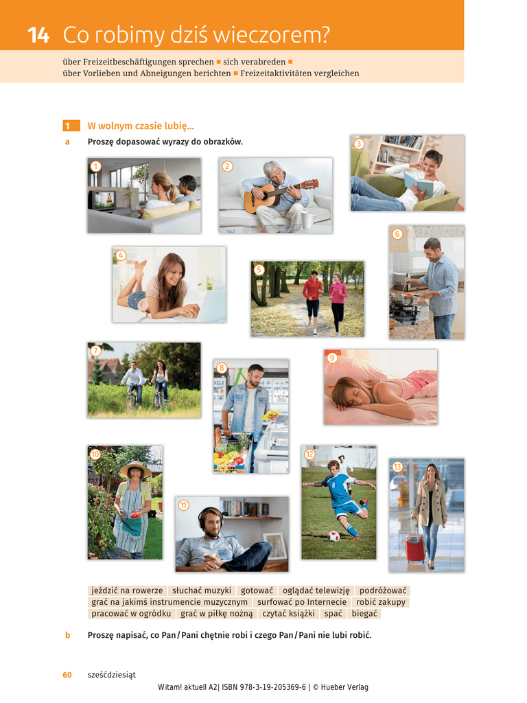 14 &RURELP\G]LķZLHF]RUHP" über Freizeitbeschäftigungen sprechen ࡇ sich verabreden ࡇ über Vorlieben und Abneigungen berichten ࡇ Freizeitaktivitäten vergleichen 1 W wolnym czasie lubię... a Proszę dopasować wyrazy do obrazków. 1 3 2 6 4 5 7 9 8 10 12 13 11 jeździć na rowerze | słuchać muzyki | gotować | oglądać telewizję | podróżować grać na jakimś instrumencie muzycznym | surfować po Internecie | robić zakupy pracować w ogródku | grać w piłkę nożną | czytać książki | spać | biegać b 60 Proszę napisać, co Pan / Pani chętnie robi i czego Pan / Pani nie lubi robić. sześćdziesiąt Witam! aktuell A2| ISBN 978-3-19-205369-6 | © Hueber Verlag 14 c Proszę znaleźć kogoś w grupie, kto… • • • • • • • interesuje się muzyką rozrywkową gra na pianinie umie jeździć na łyżworolkach uprawia sport, np. koszykówkę, aerobik, tenis chodzi na koncerty na wolnym powietrzu gra w szachy wędruje po górach • • • • • • ... chętnie gotuje gra na gitarze często chodzi do kina interesuje się muzyką poważną lubi chodzić z psem na spacer chętnie uczy się języków obcych §a Umie Pan / Pani grać na pianinie? §b ... 1–3 → JUDÉna + Lok. JUDÉw + Akk. JUDÉz + Instr. 2 Jak Polacy spędzają wolny czas? a Proszę przeczytać tekst. „Aktywności pozazawodowe Polaków” Według najnowszych badań prawie wszyscy Polacy spędzają wolny czas w sposób tradycyjny, z rodziną albo przed telewizorem. Młodzież interesuje się muzyką, chętnie chodzi do kina, do dyskoteki albo na koncerty. Niektórzy uprawiają sport. Najpopularniejszą dyscypliną sportową jest piłka nożna. Nowe rodzaje sportów, takie jak na przykład jazda na łyżworolkach czy kolarstwo górskie, znajdują coraz więcej zwolenników. Bardzo popularne, szczególnie wśród młodzieży, są koncerty na wolnym powietrzu oraz przeróżne jarmarki i rycerskie turnieje organizowane w pięknych, nastrojowych plenerach. Coraz więcej Polaków lubi podróżować po świecie i dlatego kursy języków obcych cieszą się dużym zainteresowaniem. 4, 5 → b 6→ Proszę zaznaczyć prawidłowe stwierdzenia. 1. Polacy lubią oglądać telewizję. 2. Polacy nie uprawiają żadnego sportu. 3. Najpopularniejszą dyscypliną sportową w Polsce jest tenis. 4. Wszystkie dzieci uczą się języków obcych. 5. Polacy lubią podróżować. 6. W Polsce nikt nie jeździ na rolkach. 7. Koncerty muzyki poważnej cieszą się coraz większą popularnością. TAK [] [] NIE [] [] BRAK INFORMACJI [] [] [] [] [] [] [] [] [] [] [] [] [] [] [] [] [] wszyscy Polacy wszystkie dzieci wszystko sześćdziesiąt jeden Witam! aktuell A2| ISBN 978-3-19-205369-6 | © Hueber Verlag 61 14 c Wszyscy, wszystkie albo wszystko? Proszę uzupełnić tekst. Alicja interesuje się polską muzyką rockową. Tak jak koleżanki i jej koledzy, Ala zna piosenki ulubionych zespołów rockowych na pamięć. Chodzi też, jeżeli to możliwe, na koncerty muzyki rockowej. Właśnie wczoraj była na koncercie na wolnym powietrzu. było wspaniałe, muzyka i atmosfera, ale najbardziej podobało jej się to, że śpiewali i tańczyli razem w takt muzyki. d „Czy jesteś aktywny?“ Proszę przeczytać tekst. „Czy jesteś aktywny?“ Marian Sowa, 25 lat, student Florian Czekała, 74 lata, rencista Hanna Ziomek, 41 lat, nauczycielka Oczywiście, że staram się być aktywny. Codziennie rano biegam pół godziny. Poza tym raz w tygodniu chodzę na trening siatkówki. Sport jest dla mnie bardzo ważny, ale nie mam czasu na inne zajęcia. Nie interesuję się na przykład żadną muzyką i nie czytam żadnych książek. Na sport jestem chyba już za stary, a szkoda. Nie znam nikogo w moim wieku, kto uprawia aktywnie jakiś sport. Za to chodzę regularnie do teatru, mam nawet abonament. Właściwie z nikim nie mam bliskich kontaktów i oprócz teatru niczym się nie interesuję. Ach, oczywiście codziennie chodzę na spacery z moim pieskiem Reksem i poza tym lubię jeszcze rozwiązywać krzyżówki. Niestety nie uprawiam żadnego sportu, bo po prostu nie mam na to czasu. Pracuję zawodowo i mam troje dzieci. Nawet nie interesuję się żadnym sportem, wolę iść do kina na dobry film albo do filharmonii na koncert. Proszę porównać wypowiedzi. §a Marian nic nie czyta, ale... §b ... 7–10 → 62 ľDGHQVSRUW ľDGQa rodzina ľDGQe dziecko Nom. nikt nic Gen. nikogo niczego Dat. nikomu niczemu Akk. nikogo nic Instr. nikim niczym sześćdziesiąt dwa Witam! aktuell A2| ISBN 978-3-19-205369-6 | © Hueber Verlag 14 e Jak spędzają wolny czas Polacy, a jak Niemcy? Proszę porozmawiać na ten temat. §a §a §a §a 3 Niemcy spędzają więcej / mniej czasu... Polacy chyba częściej... Niemcy więcej... Najbardziej popularnym sportem w... §b Chyba Pan / Pani ma rację, ale... §b Zgadzam się... §b Nie, Pan / Pani nie ma racji. Ja myślę, że... Idziemy do opery STR ASZNY DWÓR 17. 02. 2016 godz.rozp. 19:00 %$/.21, ORŕD'P FHQD]ğQRUPDOQ\ NS – 56998 > <NB – 150578 20 a Proszę wysłuchać scenki i odpowiedzieć na pytania. 1. 2. 3. 4. 11–13 → b Do kogo zadzwonił Wiesiek? Czy Wieśkowi podoba się wieczorowa suknia Edyty? Na jaką operę Wiesiek ma bilety? Dlaczego Tomek nie może iść do teatru? Vokativ Edytka Edytko! Wiesiek :LHĝNu! Co ona ma zrobić? Proszę utworzyć zdania. Ona ma kupić 14 → PLHÉ,QȴQLWLY 0DPNXSLÉFKOHE" PLHÉ$NNXVDWLY 0DV]FKOHE" sześćdziesiąt trzy Witam! aktuell A2| ISBN 978-3-19-205369-6 | © Hueber Verlag 63 14 c Pan / Pani ma niespodziankę dla kolegi / koleżanki z kursu. Proszę przeczytać i potem odegrać scenkę zmieniając przy tym zaznaczone elementy. §a Wiesz Astrid, mam na dzisiaj dwa bilety na operetkę. Masz ochotę? §b Chętnie, ale jaka to operetka i o której godzinie? §a „Wesoła wdówka“ Lehara w Teatrze Nowym o... §f jutro | §f niedzielę | §f wtorek wieczorem | §f ... §f do kina | §f do teatru | §f do cyrku | §f na balet | §f na koncert | §