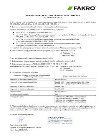 KRAJOWA DEKLARACJA WŁAŚCIWOŚCI UŻYTKOWYCH Nr KDWU01/9318/17 1. i 2. Nazwa i nazwa handlowa wyrobu budowlanego, oznaczenie typu wyrobu budowlanego: świetliki rurowe SR_(Z,H,S,L,F); SR_(Z,H,S,L)-L; SF_(Z,H,S,L,F); SF_(Z,H,S,L)-L 3. Zamierzone zastosowanie: do doświetlania pomieszczeń światłem naturalnym. Świetliki rurowe mogą być wbudowywane w połacie dachów o pochyleniu: od 0° do 15° – w przypadku świetlików SFF i SRF, od 15° do 60°, pokrytych płaskim materiałem pokryciowym o grubości do 10 mm – w przypadku świetlików SFS, SFS-L, SRS, SRS-L, SFL, SFL-L, SRL i SRL-L, od 15° do 60°, pokrytych profilowanym materiałem pokryciowym o grubości do 45 mm – w przypadku świetlików SFZ, SFZ-L, SRZ i SRZ-L, od 15° do 60°, pokrytych profilowanym materiałem pokryciowym o grubości do 120 mm – w przypadku świetlików SFH, SFH-L, SRH i SRH-L, w budynkach mieszkalnych jedno- i wielorodzinnych, użyteczności publicznej oraz przemysłowych. 4. Nazwa i adres siedziby producenta oraz miejsce produkcji wyrobu: FAKRO PP Sp. z o.o. ul. Węgierska 144 a 33-300 Nowy Sącz 5. Nazwa i adres siedziby upoważnionego przedstawiciela: 6. Krajowy system zastosowany do oceny i weryfikacji stałości właściwości użytkowych: 3 7. Krajowa ocena techniczna: APROBATA TECHNICZNA ITB AT-15-9318/2014 Jednostka oceny technicznej/ Krajowa jednostka oceny technicznej: Instytut Techniki Budowlanej ul. Filtrowa 1 00-611 Warszawa 8. Deklarowane właściwości użytkowe: Zasadnicze charakterystyki wyrobu budowlanego dla zamierzonego zastosowania Deklarowane właściwości użytkowe Odporność na uderzenie ciałem twardym Wynik pozytywny Odporność na uderzenie ciałem miękkim klasa SB 1200 – w przypadku świetlików SFF i SRF, klasa SB 800 – w przypadku pozostałych świetlików. Odporność na obciążenie dociskające klasa DL 2500 Odporność na obciążenie odrywające klasa UL 3000 Wodoszczelność Wynik pozytywny Przepuszczalność powietrza Klasa 3 Izolacyjność cieplna ≤ 1,8 W/(m2·K) - SRF i SFF, o średnicy 850 mm ≤ 1,9 W/(m2·K) -świetliki o średnicy 550 mm, ≤ 2,0 W/(m2·K) - świetlików o średnicy 350 mm, ≤ 2,1 W/(m2·K) - świetlików o średnicy 250 mm. 9. Właściwości użytkowe określonego powyżej wyrobu są zgodne z wszystkimi wymienionymi w pkt 8 deklarowanymi właściwościami użytkowymi. Niniejsza krajowa deklaracja właściwości użytkowych wydana zostaje zgodnie z ustawą z dnia 16 kwietnia z 2004 r. o wyrobach budowlanych, na wyłączną odpowiedzialność producenta. W imieniu producenta podpisała: Ewa Łukaszczyk-Haslik Dyrektor ds. Certyfikacji i Kontroli Jakości Nowy Sącz, 02.01.2017 r.