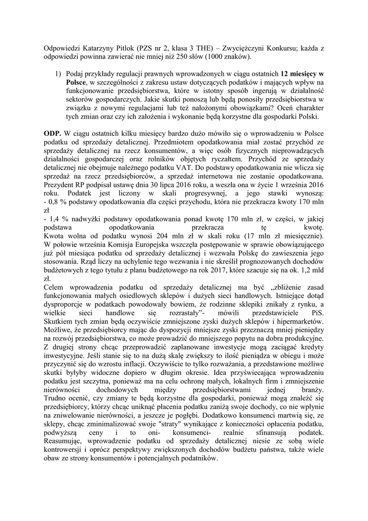Odpowiedzi Katarzyny Pitlok (PZS nr 2, klasa 3 THE) – Zwyciężczyni Konkursu; każda z odpowiedzi powinna zawierać nie mniej niż 250 słów (1000 znaków). 1) Podaj przykłady regulacji prawnych wprowadzonych w ciągu ostatnich 12 miesięcy w Polsce, w szczególności z zakresu ustaw dotyczących podatków i mających wpływ na funkcjonowanie przedsiębiorstwa, które w istotny sposób ingerują w działalność sektorów gospodarczych. Jakie skutki ponoszą lub będą ponosiły przedsiębiorstwa w związku z nowymi regulacjami lub też nałożonymi obowiązkami? Oceń charakter tych zmian oraz czy ich założenia i wykonanie będą korzystne dla gospodarki Polski. ODP. W ciągu ostatnich kilku miesięcy bardzo dużo mówiło się o wprowadzeniu w Polsce podatku od sprzedaży detalicznej. Przedmiotem opodatkowania miał zostać przychód ze sprzedaży detalicznej na rzecz konsumentów, a więc osób fizycznych nieprowadzących działalności gospodarczej oraz rolników objętych ryczałtem. Przychód ze sprzedaży detalicznej nie obejmuje należnego podatku VAT. Do podstawy opodatkowania nie wlicza się sprzedaż na rzecz przedsiębiorców, a sprzedaż internetowa nie zostanie opodatkowana. Prezydent RP podpisał ustawę dnia 30 lipca 2016 roku, a weszła ona w życie 1 września 2016 roku. Podatek jest liczony w skali progresywnej, a jego stawki wynoszą: - 0,8 % podstawy opodatkowania dla części przychodu, która nie przekracza kwoty 170 mln zł - 1,4 % nadwyżki podstawy opodatkowania ponad kwotę 170 mln zł, w części, w jakiej podstawa opodatkowania przekracza tę kwotę. Kwota wolna od podatku wynosi 204 mln zł w skali roku (17 mln zł miesięcznie). W połowie września Komisja Europejska wszczęła postępowanie w sprawie obowiązującego już pół miesiąca podatku od sprzedaży detalicznej i wezwała Polskę do zawieszenia jego stosowania. Rząd liczy na uchylenie tego wezwania i nie skreślił prognozowanych dochodów budżetowych z tego tytułu z planu budżetowego na rok 2017, które szacuje się na ok. 1,2 mld zł. Celem wprowadzenia podatku od sprzedaży detalicznej ma być „zbliżenie zasad funkcjonowania małych osiedlowych sklepów i dużych sieci handlowych. Istniejące dotąd dysproporcje w podatkach powodowały bowiem, że rodzinne sklepiki znikały z rynku, a wielkie sieci handlowe się rozrastały”mówili przedstawiciele PiS. Skutkiem tych zmian będą oczywiście zmniejszone zyski dużych sklepów i hipermarketów. Możliwe, że przedsiębiorcy mając do dyspozycji mniejsze zyski przeznaczą mniej pieniędzy na rozwój przedsiębiorstwa, co może prowadzić do mniejszego popytu na dobra produkcyjne. Z drugiej strony chcąc przeprowadzić zaplanowane inwestycje mogą zaciągać kredyty inwestycyjne. Jeśli stanie się to na dużą skalę zwiększy to ilość pieniądza w obiegu i może przyczynić się do wzrostu inflacji. Oczywiście to tylko rozważania, a przedstawione możliwe skutki byłyby widoczne dopiero w długim okresie. Idea przyświecająca wprowadzeniu podatku jest szczytna, ponieważ ma na celu ochronę małych, lokalnych firm i zmniejszenie nierówności dochodowych między przedsiębiorstwami jednej branży. Trudno ocenić, czy zmiany te będą korzystne dla gospodarki, ponieważ mogą znaleźć się przedsiębiorcy, którzy chcąc uniknąć płacenia podatku zaniżą swoje dochody, co nie wpłynie na zniwelowanie nierówności, a jeszcze je pogłębi. Dodatkowo konsumenci martwią się, ze sklepy, chcąc zminimalizować swoje "straty" wynikające z konieczności opłacenia podatku, podwyższą ceny i to onikonsumencirealnie sfinansują podatek. Reasumując, wprowadzenie podatku od sprzedaży detalicznej niesie ze sobą wiele kontrowersji i oprócz perspektywy zwiększonych dochodów budżetu państwa, także wiele obaw ze strony konsumentów i potencjalnych podatników. 2) Współczesne trendy rewolucji technologicznej w zdecydowany sposób wspomagają rozwój przedsiębiorstwa. Największy potencjał jest widoczny w branżach prowadzonych przez Internet. Firmy bazują na elektronicznych kanałach komunikacji z klientami, korzystają z platform e-handlu, zarządzania portfelem usług i kontrahentów, stosują narzędzia planowania i sterowania firmą, stawiają na reklamę i marketing w sieci. Wymień przykłady elektronicznych, internetowych, cyfrowych innowacji lub też programów czy aplikacji ułatwiających działanie przedsiębiorstwa. Oceń jakie korzyści lub zagrożenia niosą ze sobą prezentowane przez Ciebie rozwiązania. ODP. Ludzie z natury lubią ułatwiać sobie życie, więc przy okazji rozwoju technologii zadbali, by zmiany te pomogły im w pracy. Obecnie na rynku dostępnych jest wiele programów, narzędzi i aplikacji, które ułatwiają działanie firmy i czynią naszą pracę łatwiejszą, przyjemniejszą i mniej czasochłonną. Prowadzenie firmy samo w sobie jest zadaniem dość skomplikowanym. Przedsiębiorca musi nie tylko dbać o efekty swej działalności, ale także kontrolować ją pod względem administracyjnym i prawnym. Prawo nakłada na niego szereg obowiązków, których spełnienie obecnie ułatwiają mu różnorodne programy komputerowe. Często kilka programów łączy się ze sobą umożliwiając import danych i sprawniejszą obsługę. Na rynku jest wiele pakietów biurowych pozwalających na przejrzyste prowadzenie ewidencji handlowej (wystawianie, korekta faktur), rozliczeń (kontrola należności i zobowiązań, raporty kasowe) czy ewidencji magazynu (kartoteki zapasów, dokumenty magazynowe). Program ustala ceny towarów czy wyrobów gotowych, pozwala na prowadzenie kartotek kontrahentów. Ogromnym ułatwieniem jest możliwość prowadzenia księgowości w programie komputerowym, zamiast ręcznego wypełniania ksiąg rachunkowych. Oprócz standardowej ewidencji operacji gospodarczych pozwala on także prowadzić ewidencję podatku VAT i środków trwałych, w tym naliczanie amortyzacji. Dekl