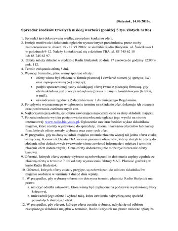 Białystok, 14.06.2016r. Sprzedaż środków trwałych niskiej wartości (poniżej 5 tys. złotych netto) 1. Sprzedaż jest dokonywana według procedury konkursu ofert, 2. Istnieje możliwości dokonania oględzin wystawionych przedmiotów przez osoby zainteresowane w dniach 15 - 17 VI 2016r. w siedzibie Radia Białystok ul. Świerkowa 1 w godzinach 9-12. Należy kontaktować się z działem TIiA tel. 85 745 62 18 lub 85 745 62 97. 3. Oferty należy składać w siedzibie Radia Białystok do dnia 17 czerwca do godziny 12:00 w pok. 112. 4. Termin związania ofertą 5 dni. 5. Wymogi formalne, jakie winny spełniać oferty: oferty winne być złożone w formie pisemnej i zawierać numer(-y) sprzętu(-ów) oraz zaproponowaną (-e) cenę(-y), podpis upoważnionej osoby składającej ofertę (wraz z pieczęcią firmową, gdy oferta składana jest przez przedsiębiorcę) wraz z danymi kontaktowymi (telefon, e-mail), oświadczenie zgodne z Załącznikiem nr 1 do niniejszego Regulaminu. 5. Po upływie wyznaczonego w ogłoszeniu terminu na składanie ofert dokonuje ich otwarcia oraz porównania zaoferowanych cen. 6. Najkorzystniejszą ofertą jest oferta zawierająca najwyższą cenę za dany składnik majątku. 7. Po zatwierdzeniu wyniku postępowania niezwłocznie ogłasza jego wyniki na stronie internetowej: www.radio.bialystok.pl. Ogłoszenie zawierać będzie: wykaz składników majątku, które zostały wystawione do sprzedaży, imiona i nazwiska oferentów lub nazwy firm, których oferty zostały wybrane oraz ceny tych ofert. 8. W przypadku, gdy na dany składnik majątku zostanie złożona więcej niż jedna oferta z taką samą ceną, Kierownik Działu TIiA wezwie pisemnie oferentów, którzy złożyli te oferty do złożenia ofert dodatkowych (wezwanie winno zawierać informację o miejscu i terminie złożenia ofert dodatkowych). Cena oferty dodatkowej nie może być niższa niż oferty bazowej. 9. Oferenci, których oferty zostały wybrane są zobowiązani do dokonania zapłaty zgodnie ze złożoną ofertą w terminie 7 dni od daty wystawienia faktury VAT. Płatność gotówką w kasie Radia Białystok. 10. Oferenci, których oferty zostały przyjęte, są zobowiązani do odbioru składnika/ów majątku osobiście w terminie 7 dni od dnia wpłaty. 11. W przypadku, gdy wybrany oferent nie dotrzyma terminu płatności Radio Białystok ma prawo: a. naliczyć odsetki ustawowe, które winny być zapłacone na podstawie wystawionej Noty księgowej, b. unieważnić jego ofertę i wybrać taką, która zawierała najwyższą cenę spośród pozostałych złożonych ofert. 12. W przypadku, gdy oferent, którego oferta została wybrana, uchyla się od odbioru zakupionego składnika majątku w terminie, Radio Białystok ma prawo naliczać opłatę za jego przechowanie, w wysokości 1 % ceny brutto składnika majątku, za którą został on sprzedany, liczoną za każdy dodatkowy dzień przechowywania. 13. W przypadku, gdy oferent, którego oferta została wybrana, nie odbierze zakupionego środka trwałego w ciągu 14 dni, Radio Białystok ma prawo zastosować sankcję zgodnie z pkt. 11 lit. b. Załącznik nr 1 do Regulaminu sprzedaży likwidowanych składników majątku Polskiego Radia – Regionalnej Rozgłośni w Białymstoku „Radio Białystok” Spółka Akcyjna wzór oświadczenia o zapoznaniu się ze stanem technicznym likwidowanego składnika majątku Oświadczenie o zapoznaniu się ze stanem technicznym likwidowanego składnika majątku Niżej podpisany/a oświadczam, iż przed nabyciem likwidowanego składnika majątku Polskiego Radia – Regionalnej Rozgłośni w Białymstoku „Radio Białystok” Spółka Akcyjna w postaci ……………………………………………………………………………………… (opis likwidowanego składnika majątku) zapoznałem/łam się z jego stanem technicznym i nie zgłaszam w tym przedmiocie żadnych zastrzeżeń. …………………………………… (podpis) numer sprzętu Nazwa 2 Telewizor Samsung LE32A430T1 HD READY 32" 2008 3 Telewizor Samsung LE23R81B HD READY 23" 2007 4 Telewizor Samsung LE23R81B HD READY 23" 2007 5 Telewizor Samsung LE23R81B HD READY 23" 2007 6 Telewizor Samsung LE23R81B HD READY 23" 2007 7 Monitor LCD Belinea 17” 101751 2004 8 Monitor LCD Samsung 19" 940BF 2006 9 Monitor LCD Samsung 22" 2232BW 2005 10 Monitor LCD Belinea 19" 101920B 2004 11 12 13 14 15 16 17 18 Monitor LCD Samsung 17" 713N S Monitor LCD Samsung 17" 713N S Monitor LCD Samsung 17" 713N S Monitor LCD Samsung 17" 740N Monitor LCD Samsung 22" 2243NW Monitor LCD Samsung 17" 740N Monitor LCD Samsung 19" 943N Komputer DELL GX520 Rok Produkcji 2005 2005 2005 2007 2010 2007 2009 2006 19 Komputer DELL GX520 2006 20 Komputer DELL GX520 2006 21 Komputer Zetos Pro Iso Rack 2007 22 Fujitsu-Siemens LifeBook C1410 laptop 2007 Parametry Component in RLRBV; D-sub ; HDM IN x3; EURO x2; Audio Chinch IN; AUDIO CHINCH OUT; AUDIO OPTICAL IN; AV IN, S-VIDEO IN, pilot Component in RLRBV; D-sub ; HDM IN x2; EURO x2; Audio Chinch IN; AUDIO CHINCH OUT; AUDIO OPTICAL IN; AV IN, S-VIDEO IN, pilot Component in RLRBV; D-sub ; HDM IN x2; EURO x2; Audio Chinch IN; AUDIO CHINCH OUT; AUDIO OPTICAL IN; AV IN, S-VIDEO IN, pilot Component in RLRBV; D-sub ; HDM IN x2; EURO x2; Audio Chinch IN; AUDIO CHINCH OUT; AUDIO OPTICAL IN; AV IN, S-VIDEO IN, pilot Component in RLRBV; D-sub ; HDM IN x2; EURO x2; Audio Chinch IN; AUDIO CHINCH OUT; AUDIO OPTICAL IN; AV IN, S-VIDEO IN, pilot D-Sub, DVI-D, audio in, audio out, rozdzielczość maksymalna 1280 x 1024, wbudowane głośniki D-Sub, DVI-D, rozdzielczość maksymalna 1280 x 1024, w zestawie kabel zasilający i VGA D-Sub, DVI-D, rozdzielczość maksymalna 1680 x 1050, w zestawie kabel zasilający i VGA D-Sub, DVI-D, audio in, audio out, rozdzielczość maksymalna 1280 x 1024, w zestawie kabel zasilający i VGA D-Sub, rozdzielczość maksymalna 1280 x 1024, w zestawie kabel zasilający i VGA D-Sub, rozdzielczość maksymalna 1280 x 