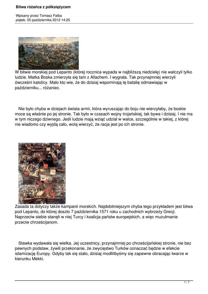 Bitwa różańca z półksiężycem Wpisany przez Tomasz Falba piątek, 05 października 2012 14:25 W bitwie morskiej pod Lepanto (której rocznica wypada w najbliższą niedzielę) nie walczyli tylko ludzie. Matka Boska zmierzyła się tam z Allachem. I wygrała. Tak przynajmniej wierzyli ówcześni katolicy. Mało kto wie, że do dzisiaj wspominają tę batalię odmawiając w październiku... różaniec. Nie było chyba w dziejach świata armii, która wyruszając do boju nie wierzyłaby, że boskie moce są właśnie po jej stronie. Tak było w czasach wojny trojańskiej, tak bywa i dzisiaj. I nie ma w tym niczego dziwnego. Jeśli ludzie mają wziąć udział w walce, szczególnie w takiej, z której nie wiadomo czy wyjdą cało, wolą wierzyć, że racja jest po ich stronie. Zasada ta dotyczy także kampanii morskich. Najdobitniejszym chyba tego przykładem jest bitwa pod Lepanto, do której doszło 7 października 1571 roku u zachodnich wybrzeży Grecji. Naprzeciw siebie stanęli w niej Turcy i koalicja państw europejskich, a więc muzułmanie przeciw chrześcijanom. Stawka wydawała się wielka. Jej uczestnicy, przynajmniej po chrześcijańskiej stronie, nie bez pewnych podstaw, żywili przekonanie, że zwycięstwo Turków oznaczać będzie w efekcie islamizację Europy. Gdyby tak się stało, dzisiaj modlilibyśmy się zapewne obracając twarze w kierunku Mekki. 1/7 Bitwa różańca z półksiężycem Wpisany przez Tomasz Falba piątek, 05 października 2012 14:25 W tej sytuacji swoje zwycięstwo chrześcijanie zinterpretowali religijnie. Rozumowanie było proste. Owszem, w batalii brali udział ludzie, ale bez nadprzyrodzonej ingerencji na najwyższym szczeblu, nie mogliby pokonać Turków. Kto im pomógł? Jak przystało na rzymskich katolików (bo to oni reprezentowali chrześcijaństwo w bitwie pod Lepanto), odpowiedź mogła być tylko jedna – oczywiście Matka Boska! W cieniu islamu Wiek XVI. Cóż to było za stulecie! Do dzisiaj uważa się je za jeden z najbardziej niezwykłych okresów w dziejach Europy. Był to bowiem czas zasadniczej zmiany w postrzeganiu wielu, uznawanych dotychczas za niepodważalne, pojęć. Znany współczesnym świat, został przewrócony do góry nogami. Po pierwsze okazało się, że nie ogranicza się on tylko do Europy, Azji i północnej Afryki. Odkrycie Ameryki przez Krzysztofa Kolumba zapoczątkowało erę wielkich odkryć geograficznych, których ukoronowaniem była pierwsza wokółziemska wyprawa morska Ferdynanda Magellana. Jego rejs udowodnił niezbicie i ostatecznie, że ziemia jest okrągła. Już to samo w sobie było rewolucyjne. Ale mało tego – Mikołaj Kopernik poszedł jeszcze dalej ogłaszając, że kula ziemska obraca się wokół słońca czyli odwrotnie niż do tej pory sądzono. W tym samym czasie renesans zaowocował zdumiewającymi dziełami odkrywającymi piękno człowieka. Humanizm stanowił istotny wyróżnik tego stulecia. Na początku wieku XVI wybuchła też niespodziewanie Reformacja, która zachwiała już nie tylko ówczesnymi sądami na temat 2/7 Bitwa różańca z półksiężycem Wpisany przez Tomasz Falba piątek, 05 października 2012 14:25 świata, ale także i Boga. Wystąpienie niemieckiego mnicha Marcina Lutra, a potem szwajcarskiego reformatora Jana Kalwina, doprowadziły do odnowy Kościoła, która zaowocowała powstaniem nowych wspólnot kwestionujących władzę papieża. Rzym zareagował własną reformą wewnętrzną, nazwaną Kontreformacją. Niestety, podziały zaowocowały wojnami religijnymi. Tymczasem nad Europą zawisła groźba Imperium Osmańskie. Rozwinęło się ono, drogą podbojów, z niewielkiego tureckiego państewka, zajmując systematycznie południowo-wschodnią część Morza Śródziemnego. Od tego momentu zagrożenie tureckie było stałym elementem polityki europejskiej właściwie aż do bitwy pod Wiedniem w 1683 roku, która definitywnie zakończyła ekspansję Turków na Starym Kontynencie. W 1570 roku Turcja zażądała od Wenecji Cypru. Kiedy ta odrzuciła dyktat, wojska osmańskie zajęły wyspę. Doszło do brutalnej rzezi jej mieszkańców, po czym papież Pius V zorganizował doraźną koalicję, tzw. Świętą Ligę, w której pierwsze skrzypce grały Wenecja i Hiszpania. Jej celem było wzięcie odwetu na Turkach. Wyprawa miała charakter krucjaty. Jej uczestnicy przekonani byli, że wyruszają do walki z bezbożnikami, którzy chcą narzucić Europie islam. Główną sprężyną ekspedycji był papież Pius V. Człowiek ten zasługuje na uwagę ze wszech miar. Kiedy wybrano go na urząd biskupa Rzymu, był już w podeszłym wieku, miał bowiem 62 lata. Trzeba podkreślić, że jak na owe czasy był to papież pobożny i uczony, na pewno zaś postać odpowiednia do prowadzenia reformy wewnętrznej Kościoła Rzymsko-Katolickiego, koniecznej w obliczu postępującej Reformacji. Pius V wywodził się z zakonu dominikańskiego. Był doktorem teologii. Słynął też, co istotne dla naszej opowieści, z nieprzeciętnego kultu, jakim otaczał Matkę Boską. 3/7 Bitwa różańca z półksiężycem Wpisany przez Tomasz Falba piątek, 05 października 2012 14:25 Różnie to przyjmowano. Pius V postulował np. usunięcie z Wiecznego Miasta prostytutek, zabronił mieszkańcom chodzenia do karczm, co pewien poseł wenecki skomentował uwagą, że papież chce zamienić Rzym w wielki klasztor. Jedną z najbardziej charakterystycznych pozostałości po nim jest biała sutanna noszona od jego czasów przez papieży. Dzisiaj czczony jest jako święty. Jedna z legend mówi, że władca Turków - sułtan Selim II, patrząc kiedyś na morze, miał skonstatować, że bardziej niż chrześcijańskich okrętów boi się modlitw Piusa V. Całkowite zwycięstwo Bitwa pod Lepanto (świetnie opisana w wydanej kilka dni temu przez Dom Wydawniczy Rebis książce Rogera Crowleya „Morskie imperia” - czytaj: Wojny galer ) uchodzi za ostatnią wielką bitwę morską rozegraną w średn