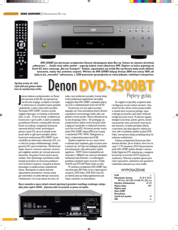 KINO DOMOWE Odtwarzacze Blu-ray DVD-2500BT jest pierwszym urządzeniem Denona odczytującym płyty Blu-ray. Celowo nie używam określenia „odtwarzacz”.... Zmylić może także symbol – sugeruje jedynie nowy odtwarzacz DVD. Dopiero na końcu pojawiają się literki BT, które oznaczają „Blu-ray Transport”. Kolejne, zapowiadane już źródła Blu-ray Denona będą nosiły zbliżone oznaczenia, należy więc zachować czujność. Wkrótce do DVD-2500BT dołączy droższy 3800 oraz tańszy 1800, ale będą to już „normalne” odtwarzacze, a 2500 pozostanie (przynajmniej na razie) jedynym, unikalnym transportem. Zgrabny, prosty, ale i dość ciężki pilot jest godnym dodatkiem do wysokiej klasy źródła. J Denon DVD-2500BT eszcze niedawno podejrzewałem, em, że Denon aprezentuje jako pierwsze źródło Blu-ray zaprezentuje i tto kkompletl t coś okrutnie drogiego, że będzie ny odtwarzacz ze wszystkimi typami gniazdek i gniazdeczek, o jakich można tylko pomyśleć. Tymczasem DVD-2500BT, chociaż z przodu wygląda imponująco, nie kosztuje wcale bardzo dużo, a z tyłu... O tym za chwilę. Urządzenie pakowane jest w spore pudło, w jakich przyjeżdżają amplitunery Denona z wyższej półki cenowej. Denon ma tradycję i umiejętności budowania naprawdę dobrych źródeł, pochodzących jeszcze z epoki CD, ale za te okazałe smoki życzył sobie na ogół spore pieniądze. Jakości konstrukcji mechanicznej DVD-2500BT nie powstydziłby się referencyjny odtwarzacz CD, a to w relacji do sprzętu wielokanałowego, choćby generacji HD, spory komplement. Obudowa jest ciężka, sztywna i wzorowo wykonana, zarówno pod względem estetyki, jak i precyzji pasowania elementów. Na grubym froncie oprócz sporej szuflady i dość dyskretnego wyświetlacza widać komplet przycisków do sterowania podstawowymi funkcjami transportu. Uzupełnia je klawisz pozwalający na szybką zmianę rozdzielczości obrazu. Rozwiązanie to ułatwia dobranie odpowiednich parametrów, również wtedy, gdy wyświetlacz nie zdoła obsłużyć narzuconej rozdzielczości i nie ma jak zajrzeć do menu, by sobie z tym problemem poradzić, chociaż dzisiaj trudno podejrzewać kogokolwiek, kto kupiłby urządzenie klasy DVD DVD-2500BT d i kl 2500BTT o posiadanie i d i plazmy l czy LCD w rozdzielczościach innych niż Full HD. Na pierwszy rzut oka ciężko zauważyć stapiający się z linią wyświetlacza istotny element wyposażenia nowoczesnego źródła, jakim jest gniazdo na karty pamięci. Denon zdecydował się na slot akceptujący lidera – SD (posługując się przejściówkami, będzie można korzystać także z będących standardem w telefonach komórkowych kart microSD). Na kartach pamięci można podać DVD-2500BT zdjęcia JPEG oraz muzykę w standardach MP3 i WMA. Obsługiwane są karty o maksymalnej pojemności 8 GB. Zupełnie wyjątkowo nie ma o czym mówić w zakresie złącz urządzenia, gdyż na tylnym panelu pojawia się, nie licząc sieci zasilającej i gniazdek komunikacyjnych, tylko jedno jedyne wyjście sygnałowe – HDMI. Denon kompatybilny jest oczywiście z 1080p/24 oraz cyfrowym dźwiękiem kodowanym jako bitstream, a umożliwiającym przesłanie wszystkich typów strumieni z Dolby TrueHD oraz DTS HD Master Audio na czele. W wachlarzu umiejętności DVD-2500BT leżą naturalnie płyty BD-Video (wraz z nagrywalnymi wersjami), DVD-Video, DVD-R(W) oraz CD, po detekcji płyty jej rodzaj sygnalizowany jest małym znaczkiem na wyświetlaczu. Rzecz niezwykła w epoce tylnych ścianek zapchanych gniazdami wszelkiego możliwego rodzaju: tylko jedno wyjście HDMI... plątaniny kabli ani pomyłek na pewno nie będzie. 20 listopad 2008 Piękny golas Ze względu na specyfikę urządzenia także i konfiguracja nie jest trudnym tematem. Ustawienie formatu obrazu można przeprowadzić w sposób łatwy za pomocą jednego, wspomnianego już przycisku (jest także możliwość konfiguracji przez menu). W zakresie regulacji dostępne są kontrast, jasność, gamma, ostrość oraz parametr color, pod którym kryje się nie tyle nasycenie, co balans pomiędzy zielenią a czerwienią. Jest także algorytm redukcji szumów. Jeśli w szufladzie znajdzie się płyta DVDVideo, wewnętrzne układy przeskalują obraz do wybranej rozdzielczości. Ciekawą umiejętnością Denona jest dekodowanie dźwięku. Jak to możliwe, skoro nie ma wyjść 7.1? W ustawieniu LPCM dla parametrów audio DVD-2500BT pobiera dźwięk z warstwy Dolby Digital lub DTS, dekoduje go, a następnie konwertuje na strumień LPCM wysyłany do amplitunera. Wówczas wszystkie typowe parametry czyli poziom, opóźnienia oraz typ kolumn (małe/duże) ustawiane są z menu źródła. WYPOSAŻENIE Profil 1.1 Odczytywane formaty BD, BD-R, BD-RE, DVD-Video, DVD-R/RW, CD-R/RW, MP3, JPEG, Divx Dekodery wielokanałowe DD, DTS Wyjścia wideo HDMI Wyjścia audio Złącze SCART Komunikacja Czytnik kart pamięci SD USB nie DŹWIĘK i OBRAZ Aby nie zostać od razu porażony umiejętnościami Denona, rozpocząłem od kilku „spokojnych” fragmentów z płyt DVD-Video. Oczywiście stary, zgrzybiały format nie jest w stanie dorównać następcy, ale Denon wyciąga z niego, ile się tylko da. To zaskakujące, jak pomoc elektroniki i obróbki sygnału może poprawić oryginalny zapis. Twierdzenie, że upskalowanie sygnału natywnego o niższej rozdzielczości do 1080p nie może zostać uznane za sposób na osiągnięcie full HD, ma może oparcie w teorii, ale nie w praktyce. Fantastyczna, rześka, rzetelna kolorystyka, śmiałe barwy i czysta biel. Bardzo dobrą pracę wykonano w zakresie reprodukcji ostrych krawędzi, odcinających płaszczyzny o zmiennym charakterze, linie są płynne, stabilne i bardzo wyraźnie nakreślone, ta sztuka wcale nie każdemu się udaje. Mimo to jest oczywiste, że przejście na płytę Blu-ray przyniesie dalszy skok jakościowy, choć fantastyczna kondycja Denona w ramach DVD ustawiła ppoprzeczkę p bardzo wysoko. y Denon ze