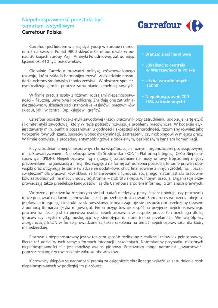 Niepe∏nosprawnoÊç przesta∏a byç tematem wstydliwym Carrefour Polska Carrefour jest liderem wielkiej dystrybucji w Europie i numerem 2 na Êwiecie. Ponad 9800 sklepów Carrefour dzia∏a w ponad 30 krajach Europy, Azji i Ameryki Po∏udniowej, zatrudniajàc ∏àcznie ok. 410 tys. pracowników. Globalnie Carrefour prowadzi polityk´ zrównowa˝onego rozwoju, która zak∏ada harmonijny rozwój w dziedzinie gospodarki, ochrony Êrodowiska i spo∏eczeƒstwa. W obszarze spo∏ecznym realizuje jà m.in. poprzez zatrudnianie niepe∏nosprawnych. W firmie pracujà osoby z ró˝nymi rodzajami niepe∏nosprawnoÊci – fizycznà, umys∏owà i psychicznà. Znajdujà one zatrudnienie zarówno w sklepach sieci (stanowiska kasjerów i pracowników sklepu), jak i w centrali (np. ksi´gowi, graficy). • Bran˝a: sieci handlowe • Lokalizacja: centrala w Warszawie/ca∏a Polska • Liczba zatrudnionych: 14000 • Niepe∏nosprawni: 700 (5% zatrudnionych) Carrefour posiada kodeks etyki zawodowej (ka˝dy pracownik przy zatrudnieniu podpisuje kart´ etyki) i komitet etyki zawodowej, który w razie potrzeby rozwiàzuje problemy pracownicze. W kodeksie etyki jest zawarty m.in. punkt o poszanowaniu godnoÊci i akceptacji ró˝norodnoÊci, rozumiany równie˝ jako tworzenie równych szans, sprzeciw wobec dyskryminacji, zastraszeniu czy mobbingowi w miejscu pracy. W firmie obowiàzujà procedury antymobbingowe z oddzielnym, bezpiecznym kana∏em komunikacji. Przy zatrudnianiu niepe∏nosprawnych firma wspó∏pracuje z ró˝nymi organizacjami pozarzàdowymi, m.in. Stowarzyszeniem „Niepe∏nosprawni dla Ârodowiska EKON” i Platformà Integracji Osób Niepe∏nosprawnych (PION). Niepe∏nosprawni sà najcz´Êciej zatrudniani na mocy umowy trójstronnej mi´dzy pracownikiem, organizacjà a firmà. Bez wzgl´du na form´ zatrudnienia posiadajà te same prawa i obowiàzki oraz otrzymujà te same Êwiadczenia dodatkowe, choç finansowane z innych êróde∏, np. „paczki Êwiàteczne” dla pracowników sklepu sà finansowane z funduszu socjalnego, natomiast dla pracowników zatrudnionych na mocy umowy trójstronnej – z obrotu sklepu, w którym pracujà. Organizacje przeprowadzajà tak˝e preselekcj´ kandydatów i sà dla Carrefoura êród∏em informacji o zmianach prawnych. Wdro˝enie pracownika rozpoczyna si´ od badaƒ medycyny pracy. Lekarz opiniuje, czy pracownik mo˝e pracowaç na danym stanowisku i jakich potrzebuje dostosowaƒ. Sam proces wdro˝enia obejmuje g∏ównie integracj´ i instruktarz stanowiskowy, którym zajmuje si´ bezpoÊredni prze∏o˝ony (czasem z pomocà t∏umacza j´zyka migowego). Firma przygotowuje zespó∏ na przyj´cie niepe∏nosprawnego pracownika. Je˝eli jest to pierwsza osoba niepe∏nosprawna w zespole, proces ten przebiega d∏u˝ej (pracownicy cz´sto myÊlà, pos∏ugujàc si´ stereotypami, które trzeba prze∏amaç). We wspó∏pracy z organizacjà EKON w firmie prowadzone sà tak˝e szkolenia na temat niepe∏nosprawnoÊci dla kadry mened˝erskiej. Pracownik niepe∏nosprawny jest w ten sam sposób rozliczany z realizacji celów jak pe∏nosprawny. Bierze te˝ udzia∏ w tych samych formach integracji i szkoleniach. Natomiast w przypadku niektórych niepe∏nosprawnoÊci nie jest mo˝liwy awans pionowy. Pracownicy mogà natomiast „awansowaç” poprzez zmian´ czy rozszerzenie zakresu obowiàzków. Kierownicy sklepów sà nagradzani premià za osiàgni´cie okreÊlonego wskaênika zatrudnienia osób niepe∏nosprawnych w podleg∏ej im placówce.