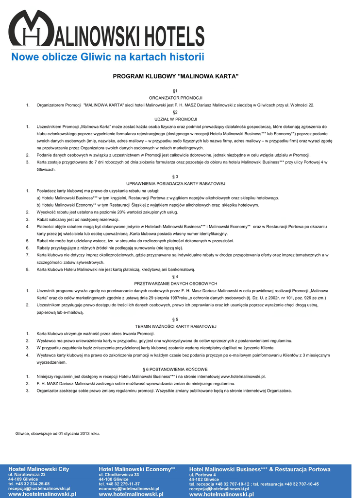PROGRAM KLUBOWY "MALINOWA KARTA" §1 ORGANIZATOR PROMOCJI 1. Organizatorem Promocji "MALINOWA KARTA" sieci hoteli Malinowski jest F. H. MASZ Dariusz Malinowski z siedzibą w Gliwicach przy ul. Wolności 22. §2 UDZIAŁ W PROMOCJI 1. Uczestnikiem Promocji „Malinowa Karta” może zostać każda osoba fizyczna oraz podmiot prowadzący działalność gospodarczą, które dokonają zgłoszenia do klubu członkowskiego poprzez wypełnienie formularza rejestracyjnego (dostępnego w recepcji Hotelu Malinowski Business*** lub Economy**) poprzez podanie swoich danych osobowych (imię, nazwisko, adres mailowy – w przypadku osób fizycznych lub nazwa firmy, adres mailowy – w przypadku firm) oraz wyrazi zgodę na przetwarzanie przez Organizatora swoich danych osobowych w celach marketingowych. 2. Podanie danych osobowych w związku z uczestnictwem w Promocji jest całkowicie dobrowolne, jednak niezbędne w celu wzięcia udziału w Promocji. 3. Karta zostaje przygotowana do 7 dni roboczych od dnia złożenia formularza oraz pozostaje do obioru na hotelu Malinowski Business*** przy ulicy Portowej 4 w Gliwicach. §3 UPRAWNIENIA POSIADACZA KARTY RABATOWEJ 1. Posiadacz karty klubowej ma prawo do uzyskania rabatu na usługi: a) Hotelu Malinowski Business*** w tym kręgielni, Restauracji Portowa z wyjątkiem napojów alkoholowych oraz sklepiku hotelowego. b) Hotelu Malinowski Economy** w tym Restauracji Śląskiej z wyjątkiem napojów alkoholowych oraz sklepiku hotelowym. 2. Wysokość rabatu jest ustalona na poziomie 20% wartości zakupionych usług. 3. Rabat naliczany jest od następnej rezerwacji. 4. Płatności objęte rabatem mogą być dokonywane jedynie w Hotelach Malinowski Business*** i Malinowski Economy** oraz w Restauracji Portowa po okazaniu karty przez jej właściciela lub osobę upoważnioną .Karta klubowa posiada własny numer identyfikacyjny. 5. Rabat nie może być udzielany wstecz, tzn. w stosunku do rozliczonych płatności dokonanych w przeszłości. 6. Rabaty przysługujące z różnych źródeł nie podlegają sumowaniu (nie łączą się). 7. Karta klubowa nie dotyczy imprez okolicznościowych, gdzie przyznawane są indywidualne rabaty w drodze przygotowania oferty oraz imprez tematycznych a w szczególności zabaw sylwestrowych. 8. Karta klubowa Hotelu Malinowski nie jest kartą płatniczą, kredytową ani bankomatową. §4 PRZETWARZANIE DANYCH OSOBOWYCH 1. Uczestnik programu wyraża zgodę na przetwarzanie danych osobowych przez F. H. Masz Dariusz Malinowski w celu prawidłowej realizacji Promocji „Malinowa Karta” oraz do celów marketingowych zgodnie z ustawą dnia 29 sierpnia 1997roku „o ochronie danych osobowych (tj. Dz. U. z 2002r. nr 101, poz. 926 ze zm.) 2. Uczestnikom przysługuje prawo dostępu do treści ich danych osobowych, prawo ich poprawiania oraz ich usunięcia poprzez wyrażenie chęci drogą ustną, papierową lub e-mailową. §5 TERMIN WAŻNOŚCI KARTY RABATOWEJ 1. Karta klubowa utrzymuje ważność przez okres trwania Promocji. 2. Wystawca ma prawo unieważnienia karty w przypadku, gdy jest ona wykorzystywana do celów sprzecznych z postanowieniami regulaminu. 3. W przypadku zagubienia bądź zniszczenia przydzielonej karty klubowej zostanie wydany nieodpłatny duplikat na życzenie Klienta. 4. Wystawca karty klubowej ma prawo do zakończenia promocji w każdym czasie bez podania przyczyn po e-mailowym poinformowaniu Klientów z 3 miesięcznym wyprzedzeniem. § 6 POSTANOWIENIA KOŃCOWE 1. Niniejszy regulamin jest dostępny w recepcji Hotelu Malinowski Business*** i na stronie internetowej www.hotelmalinowski.pl. 2. F. H. MASZ Dariusz Malinowski zastrzega sobie możliwość wprowadzania zmian do niniejszego regulaminu. 3. Organizator zastrzega sobie prawo zmiany regulaminu promocji. Wszystkie zmiany publikowane będą na stronie internetowej Organizatora. Gliwice, obowiązuje od 01 stycznia 2013 roku.