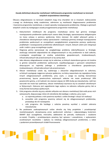 Zasady delimitacji obszarów rewitalizacji i definiowania programów rewitalizacji na terenach wiejskich województwa lubelskiego Obszary zdegradowane na terenach wiejskich mają inny charakter niż w miastach. Jednocześnie z uwagi na drobniejszą skalę osadnictwa, odmienne są możliwości diagnozowania problemów i tworzenia programów rewitalizacji, a nawet sposoby rozwiązywania problemów. Dlatego w gminach wiejskich ustala się następujące zasady przygotowania programów rewitalizacji: 1. Dokumentem źródłowym dla programu rewitalizacji winna być gminna strategia rozwiązywania problemów społecznych zwana dalej Strategią, opracowywana obligatoryjnie na mocy ustawy o pomocy społecznej, która stanowi: Do zadań własnych gminy o charakterze obowiązkowym należy opracowanie i realizacja gminnej strategii rozwiązywania problemów społecznych ze szczególnym uwzględnieniem programów pomocy społecznej, profilaktyki i rozwiązywania problemów alkoholowych i innych, których celem jest integracja osób i rodzin z grup szczególnego ryzyka. 2. Diagnozę gminy opracowuje się uwzględniając problemy zidentyfikowane w Strategii, analizując wskaźniki odpowiednie do zdiagnozowanych w niej problemów w skali sołectw, a następnie uzupełniając je analizą wskaźników gospodarczych, środowiskowych, infrastrukturalnych lub przestrzennych w tej samej skali. 3. Jako obszary zdegradowane uznaje się te sołectwa, w których stwierdzono gorsze niż średnia w gminie wskaźniki problemów społecznych, współwystępujące z gorszymi wskaźnikami dotyczącymi co najmniej jednego z problemów o charakterze gospodarczym, środowiskowym, infrastrukturalnym lub przestrzennym. 4. Obszar rewitalizacji ustala się, wybierając z obszarów zdegradowanych te sołectwa, w których występuje najgorsza sytuacja społeczna, na którą nawarstwia się największa liczba innych zdiagnozowanych problemów, przy czym, z uwagi na wymóg koncentracji przestrzennej, łączna powierzchnia wybranych sołectw nie może przekroczyć 20% powierzchni gminy, a ich ludność nie stanowi więcej niż 30% liczby jej mieszkańców. Jeśli ten warunek nie może być spełniony, obszar rewitalizacji wyznacza się na zasadach określonych w Wytycznych. Zalecane jest uzgodnienie tego wyboru na zebraniu sołtysów gminy lub w innej formie konsultacji społecznych. 5. Cele programu określa się przy udziale sołtysów wsi obszaru rewitalizacji (lub osób przez nich wskazanych), dopuszczając różne ich określenie dla każdego z sołectw, przy czym: a. co najmniej połowa z nich powinna wynikać z celów Strategii i służyć ich realizacji b. wszystkie cele programu powinny odnosić się do zdiagnozowanych problemów, prowadząc do ich rozwiązania c. cele programu dla każdego z sołectw powinny wynikać z ustaleń zebrania mieszkańców 6. Na podstawie zaakceptowanych celów określa się listę projektów i przedsięwzięć rewitalizacyjnych, akceptowaną przez społeczność sołectwa i odpowiadającą kryteriom SMART (być szczegółowe, mierzalne, adekwatne do potrzeb, realistyczne i osadzone w czasie). Projekty i przedsięwzięcia powinny być opisane i uzasadnione, z wykazaniem oczekiwanych rezultatów i wpływu na redukcję zdiagnozowanych problemów, a także z podaniem przewidywanych źródeł finansowania 1/2 7. Opis zasad realizacji programu, z uwzględnieniem udziału sołtysów (lub osób przez nich wskazanych) w procesie koordynacji i społecznego monitorowania wdrażania programu 8. Program rewitalizacji gminy wiejskiej powinien zawierać co najmniej: a. diagnozę z odniesieniem do ustaleń Strategii i wyznaczeniem obszarów (sołectw) zdegradowanych wg punktów 1, 2 i 3 b. określenie obszaru rewitalizacji wraz z uzasadnieniem wg punktu 4 c. określenie celów programu wg punktu 5 d. listę projektów i przedsięwzięć, wg punktu 6 e. udokumentowanie współpracy z sołtysami i udziału mieszkańców w określaniu celów, projektów i przedsięwzięć f. opis zasad/metod realizacji programu wraz z zasadami monitorowania wg punktu 7. 2/2