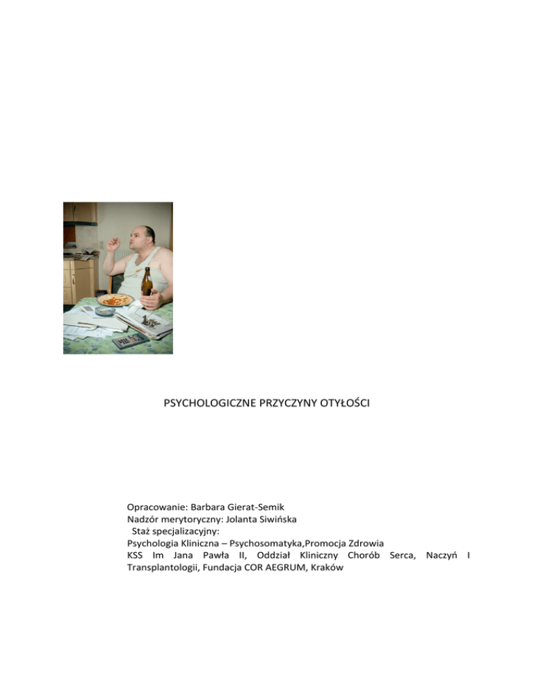 PSYCHOLOGICZNE PRZYCZYNY OTYŁOŚCI Opracowanie: Barbara Gierat-Semik Nadzór merytoryczny: Jolanta Siwińska Staż specjalizacyjny: Psychologia Kliniczna – Psychosomatyka,Promocja Zdrowia KSS Im Jana Pawła II, Oddział Kliniczny Chorób Serca, Naczyń I Transplantologii, Fundacja COR AEGRUM, Kraków Otyłość jest metaboliczną chorobą cywilizacyjną, boryka się z nią coraz więcej osób. Trudno jednoznacznie określić przyczyny otyłości, mechanizm jej powstawania jest natomiast prosty. Otyłość jest spowodowana pobieraniem większej ilości energii pod postacią spożywanych pokarmów niż wydatki energetyczne ponoszone przez organizm człowieka. Wśród przyczyn nadmiernego jedzenia, które prowadzi do nadwagi i otyłości najczęściej wymienia się czynniki genetyczne, środowiskowo-kulturowe i psychologiczne. Wśród czynników biologicznych, które predysponują do otyłości wymienia się czynniki genetyczne, dziedziczenie otyłości wynosi 33%, występowanie otyłości u jednego z rodziców zwiększa ryzyko wystąpienia otyłości u dorosłych już dzieci. Płeć ma także znaczenie. Otyłość częściej występuje u kobiet, prawdopodobnie wynika to z mniejszego zapotrzebowania energetycznego i mniejszej aktywności. Warto podkreślić, że osoby otyłe jako dzieci mają większe ryzyko otyłości w wieku dorosłym. Duży wpływ na zwiększenie otyłości, szczególnie w krajach zachodnich ma środowisko. Ludzie więcej pracują do pracy, po pracy „na spacer” przemieszczają się samochodami, preferują bierny odpoczynek. Zwiększa się także dostępność jedzenia, liczne sklepy, fast-food. Żywność zawiera środki konserwujące przedłużające przydatność do spożycia. Wpływ na powstawanie otyłości ma również reklama, która często promuje produkty wysokotłuszczowe i wysokoenergetyczne, zamiast zdrowej żywności. Czynniki kulturowe, przywiązywanie znaczenia do świąt i uroczystości rodzinnych, gdzie podawane są potrawy na ogół tłuste i słodkie, powoduje zwiększanie otyłości. Nieprawidłowe odżywianie i stawianie na szybką, gotową żywność rozpoczyna się bardzo wcześnie – długo pracujący rodzice nie mają czasu na przygotowywanie pełnowartościowych posiłków, często zastępuje się je pizzą czy innym wysokokalorycznym posiłkiem. W ostatnich latach poza otyłością dziedziczną czy związaną z zaburzeniami metabolicznymi, lekarze, psycholodzy i inni badacze zwrócili uwagę na psychologiczne przyczyny otyłości. Wśród nich wyróżnia się: Zaburzenia mechanizmu samoregulacji Cechy osobowości Oczekiwania człowieka Zaburzenia emocji i problemy w radzeniu sobie ze stresem. Zaburzenia mechanizmu samoregulacji związane z trudnościami lub niemożnością kontrolowania ilości przyjmowanych pokarmów, co prowadzi do przejadania się czy objadania. Najczęściej dochodzi do tego w sytuacjach sprzyjających utracie kontroli nad jedzeniem, kiedy jedzenia jest dużo i jest łatwo dostępne. W sytuacjach angażujących takich jak czytanie, oglądnie telewizji, spotkania towarzyskie, dochodzi do redukcji samoświadomości i zaburzeń monitorowania własnych zachowań związanych z jedzeniem. Podobnie na osoby wrażliwe na bodźce smakowe, wzrokowe i zapachowe mogą działać estetycznie i kolorowo przygotowane potrawy. Zaburzenia mechanizmu samoregulacji często występują u osób, które chcą za wszelką cenę chudnąć i starają się nie myśleć o jedzeniu. Pojawia się wówczas coraz większy głód. Zaburzenia te występują również u osób z zaniżoną samooceną, samotnych, stawiających sobie wysoką poprzeczkę w różnych dziedzinach życia. Osoby neurotyczne lub depresyjne w sytuacjach trudnych, przykre stany emocjonalne łagodzą niekontrolowanym jedzeniem. Nie radzenie sobie ze stresem, kłopoty w pracy czy w rodzinie mogą być także przyczyną nadmiernego jedzenia, które jest traktowane jako forma zmagania się z kłopotami. Jedzenie powoduje zwiększenie poziomu endorfin i serotoniny we krwi. Działają one uspokajająco i poprawiają nastrój. Często takie zachowanie powoduje błędne koło, osoba smutna, neurotyczna z niska samooceną” zajada” swoje troski, co prowadzi do nadwagi i otyłości, automatycznie zwiększających smutek, niepokój, negatywna ocenę swojego wyglądu. Nadmierne jedzenie,może być forma zwrócenia na siebie uwagi. Osoby otyłe mogą chcieć „pokazać”, że jest im źle, źle czują się ze sobą, chcą by się nimi zaopiekować. Wpływ na otyłość i przyrost masy ciała może mieć stosowanie diet odchudzających, zwłaszcza tych bardzo restrykcyjnych. Często spotykamy się z tzw. efektem „jojo”. Szybki spadek wagi, powoduje chwilowe osiągnięcie „satysfakcji”, jednak napięcie, lęk, irytacja szybko powodują, że zostają zjadane i człowiek wraca do poprzedniej lub większej wagi. U osób z nadwagą często można spotkać charakterystyczne „głodzenie” się w godzinach rannych, natomiast najadanie się popołudniu czy wieczorem. Poczucie, ze rezygnuje się z jednego posiłku może dawać złudna nadzieję, że traci się masę ciała lub, że w ciągu dnia dostarczyło się organizmowi,mniej kalorii. Warto również zastanowić się, czym się różnią pojęcia głodu i apetytu. Głód to suma odczuć związanych z niedostatkiem składników pokarmowych w organizmie, natomiast apetyt jest uwarunkowanym psychologicznie zapotrzebowaniem na jedzenia. Towarzyszy temu poczucie ulgi, jaką przynosi jego zaspokojenie. Apetyt może być regulowany na poziomie biologicznym, ale także przez bodźce wzrokowe, zapachowe czy emocjonalne. Według przeprowadzonych badań osoby otyło są bardziej wrażliwe na smak i wygląd jedzenia. Często maja problem z odmawianiem sobie jedzenia. Jedzą ( często z niewyjaśnionych przyczyn) kompulsywnie, mimo braku głodu, jedzenie, które jest bardziej eksponowane, estetyczniejsze czy nawet dobrze oświetlone. Na przest
