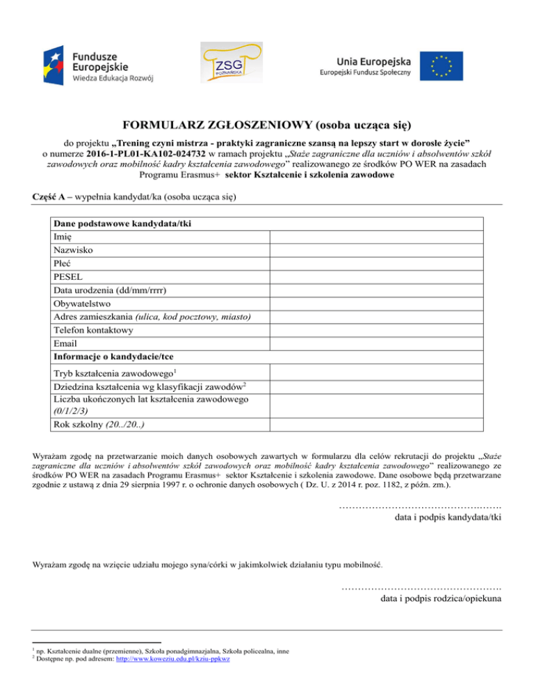 FORMULARZ ZGŁOSZENIOWY (osoba ucząca się) do projektu „Trening czyni mistrza - praktyki zagraniczne szansą na lepszy start w dorosłe życie” o numerze 2016-1-PL01-KA102-024732 w ramach projektu „Staże zagraniczne dla uczniów i absolwentów szkół zawodowych oraz mobilność kadry kształcenia zawodowego” realizowanego ze środków PO WER na zasadach Programu Erasmus+ sektor Kształcenie i szkolenia zawodowe Część A – wypełnia kandydat/ka (osoba ucząca się) Dane podstawowe kandydata/tki Imię Nazwisko Płeć PESEL Data urodzenia (dd/mm/rrrr) Obywatelstwo Adres zamieszkania (ulica, kod pocztowy, miasto) Telefon kontaktowy Email Informacje o kandydacie/tce Tryb kształcenia zawodowego1 Dziedzina kształcenia wg klasyfikacji zawodów2 Liczba ukończonych lat kształcenia zawodowego (0/1/2/3) Rok szkolny (20../20..) Wyrażam zgodę na przetwarzanie moich danych osobowych zawartych w formularzu dla celów rekrutacji do projektu „Staże zagraniczne dla uczniów i absolwentów szkół zawodowych oraz mobilność kadry kształcenia zawodowego” realizowanego ze środków PO WER na zasadach Programu Erasmus+ sektor Kształcenie i szkolenia zawodowe. Dane osobowe będą przetwarzane zgodnie z ustawą z dnia 29 sierpnia 1997 r. o ochronie danych osobowych ( Dz. U. z 2014 r. poz. 1182, z późn. zm.). …………………………………….……. data i podpis kandydata/tki Wyrażam zgodę na wzięcie udziału mojego syna/córki w jakimkolwiek działaniu typu mobilność . …………………………………………. data i podpis rodzica/opiekuna 1 2 np. Kształcenie dualne (przemienne), Szkoła ponadgimnazjalna, Szkoła policealna, inne Dostępne np. pod adresem: http://www.koweziu.edu.pl/kziu-ppkwz
