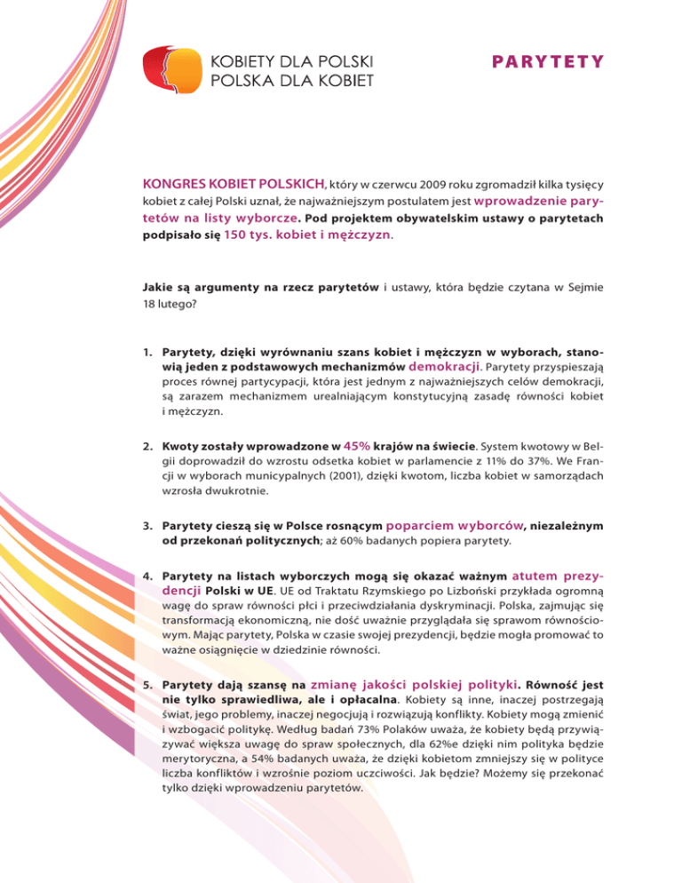 KONGRES KOBIET POLSKICH, który w czerwcu 2009 roku zgromadził kilka tysięcy kobiet z całej Polski uznał, że najważniejszym postulatem jest wprowadzenie parytetów na listy wyborcze . Pod projektem obywatelskim ustawy o parytetach podpisało się 150 tys. kobiet i mężczyzn . Jakie są argumenty na rzecz parytetów i ustawy, która będzie czytana w Sejmie 18 lutego? 1. Parytety, dzięki wyrównaniu szans kobiet i mężczyzn w wyborach, stanowią jeden z podstawowych mechanizmów demokracji . Parytety przyspieszają proces równej partycypacji, która jest jednym z najważniejszych celów demokracji, są zarazem mechanizmem urealniającym konstytucyjną zasadę równości kobiet i mężczyzn. 2. Kwoty zostały wprowadzone w 45% krajów na świecie. System kwotowy w Belgii doprowadził do wzrostu odsetka kobiet w parlamencie z 11% do 37%. We Francji w wyborach municypalnych (2001), dzięki kwotom, liczba kobiet w samorządach wzrosła dwukrotnie. 3. Parytety cieszą się w Polsce rosnącym poparciem wyborców, niezależnym od przekonań politycznych; aż 60% badanych popiera parytety. 4. Parytety na listach wyborczych mogą się okazać ważnym atutem prezydencji Polski w UE . UE od Traktatu Rzymskiego po Lizboński przykłada ogromną wagę do spraw równości płci i przeciwdziałania dyskryminacji. Polska, zajmując się transformacją ekonomiczną, nie dość uważnie przyglądała się sprawom równościowym. Mając parytety, Polska w czasie swojej prezydencji, będzie mogła promować to ważne osiągnięcie w dziedzinie równości. 5. Parytety dają szansę na zmianę jakości polskiej polityki . Równość jest nie tylko sprawiedliwa, ale i opłacalna. Kobiety są inne, inaczej postrzegają świat, jego problemy, inaczej negocjują i rozwiązują konflikty. Kobiety mogą zmienić i wzbogacić politykę. Według badań 73% Polaków uważa, że kobiety będą przywiązywać większa uwagę do spraw społecznych, dla 62%e dzięki nim polityka będzie merytoryczna, a 54% badanych uważa, że dzięki kobietom zmniejszy się w polityce liczba konfliktów i wzrośnie poziom uczciwości. Jak będzie? Możemy się przekonać tylko dzięki wprowadzeniu parytetów. 6. Parytety, różnicując pulę kandydatów, zwiększają podstawową w demokracji zasadę wolności wyboru . Dzięki parytetom obywatele i obywatelki będą mieli możliwość wybierania kandydatów spośród kobiet i mężczyzn, a nie jak do tej pory – spośród przede wszystkim mężczyzn. 66% Polaków uważa, że parytet zachęci kobiety do polityki, z której do tej pory czują się wykluczone. 56% badanych deklaruje, że będzie głosować na kobietę. 7. Parytety są neutralne politycznie , nie służą żadnym konkretnym celom, programom czy partiom politycznym. Ich funkcja jest czysto formalna, służy rzeczywistej równości szans kobiet i mężczyzn we wszystkich opcjach politycznych. Parytety są takim samym elementem demokracji, jak ustalenie progu wieku wyborczego, liczba i struktura okręgów wyborczych czy trójpodział władzy. Parytet jest równie „sztucznym” mechanizmem, jak cała demokracja, którą się zmienia i ulepsza. 8. Parytety stanowią ważny instrument sprawiedliwości . Kobiety przez setki lat nie miały praw wyborczych. Gdy je zdobyły, wieloletnia tradycja i praktyki wykluczające je ze sfery publicznej, uniemożliwiały im aktywne uczestnictwo w polityce, w której tradycyjnie najważniejszym atutem jest płeć (męska). Widać to, zarówno na listach wyborczych, jak i w składach ważnych gremiów decyzyjnych w naszym kraju. Wprowadzenie parytetu zmieni to z czasem, doprowadzając do zniesienia faktycznej dyskryminacji jednej z płci. 9. Parytety nie dają żadnych przywilejów. Zwiększają jedynie szanse wyboru kobiet . To wyborcy, a nie parytet decydują o podziale mandatów. Do tej pory znalezienie się na listach wyborczych zależało w dużym stopniu od płci (męskiej). Parytety, wprowadzając ustawowo określoną proporcję kobiet i mężczyzn, spowodują, że liderzy zaczną szukać skutecznych politycznie kobiet, które dotąd nie mogły się przebić lub nie miały szans w tradycyjnie męskim gronie otaczającym lidera. 10.Parytety przeciwdziałając politycznej dyskryminacji kobiet wzmacniają ich poczucie odpowiedzialności za polityczną wspólnotę, której są częścią. Mówi się, że kobiety są „szyją, która kręci głową”, że ich władza – choć nieformalna – jest wielka. Pora więc, by żyjąc w kraju, który deklaruje równość swoich obywateli, wzięły na siebie odpowiedzialność za życie polityczne i procesy decyzyjne. Nie ma odpowiedzialności bez rzeczywistej równości.