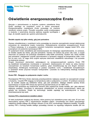 PRESS RELEASE 9.09.2010 1 (5) Oświetlenie energooszczędne Ensto Decyzja o zamontowaniu w budynku systemu oświetlenia firmy Ensto opartego na czujnikach ruchu to dobre posunięcie. Energooszczędne rozwiązania Ensto pozwalają na znaczne obniżenie zużycia prądu. Ponadto wszystkie osoby przebywające w budynku z pewnością docenią większą wygodę wynikającą z tego, że światło zapala się i gaśnie automatycznie. Światło zapala się tylko wtedy, gdy jest potrzebne Oprawy oświetleniowe z czujnikami ruchu pozwalają na znaczne oszczędności energii elektrycznej zużywanej do oświetlenia wnętrz budynków. Doświadczenia doradców energetycznych Ensto w Polsce wskazują, iż w przypadku wysokich budynków oszczędności sięgają nawet 93%, przy przeciętnym ich poziomie wynoszącym 80%. W systemach Ensto oświetlenie jest dostosowywane do bieżącego zapotrzebowania, co oznacza, że światło zapala się wtedy, gdy jest potrzebne. Oprawy nie świecą się przez cały czas, a czyjaś obecność na parterze nie powoduje oświetlenia całej klatki schodowej. System wie, kiedy światło jest potrzebne. Inteligentne czujniki zamontowane w oprawach reagują na temperaturę ciała i ruch lub na sam ruch. W ciągu dnia czujnik wykrywa obecność oświetlenia naturalnego i nie pozwala na świecenie oprawy. Drugim kluczowym elementem wpływającym na energooszczędność systemu Ensto PIR są świetlówki kompaktowe montowane w oprawach. Zastosowanie ich niesie ze sobą również oszczędności na kosztach konserwacji systemu, gdyż charakteryzują się one długim okresem eksploatacji. Perfekcyjna kombinacja w postaci czujników ruchu i świetlówek kompaktowych w oprawach Ensto przynosi korzyści funkcjonalne i pozwala na maksymalną redukcję kosztów oświetlenia. Ensto PIR - Reaguje na połączenie ciepła i ruchu Rozwiązania PIR firmy Ensto stanowią prawdopodobnie najlepszy sposób na oszczędność energii w budynku. Czujniki PIR reagują na temperaturę ciała w połączeniu z ruchem. W praktyce oznacza to, że światło zapala się dokładnie wtedy, gdy jest potrzebne. Dlatego właśnie oprawy Ensto wyposażone w czujnik PIR cieszą się ogromną popularnością już od 1994 roku. Oprawa PIR sprawdza się znakomicie zarówno jako pojedyncze źródło światła, jak i jako element większej instalacji. Umożliwia to sterowanie oświetleniem na dużych przestrzeniach, takich jak garaże lub korytarze. Dzięki tej technologii, światła zapalają się automatycznie w miarę przemieszczania się osób. Oprawa PIR z regulowanym światłem stałym W wielu budynkach znajdują się obszary, które powinny być oświetlone przez cały czas. W tym celu stworzyliśmy oprawy PIR z regulowanym światłem stałym. Umożliwiają one dobór optymalnego natężenia światła stałego dla danego obszaru (5 lub 20% nominalnego natężenia światła). Ponadto oprawy PIR z funkcją światła stałego pozwalają również na regulację natężenia światła (80 lub PRESS RELEASE 9.09.2010 2 (5) 100% wartości nominalnej) zapalanego w momencie wykrycia osoby przez czujnik. Oprócz tego, światło stałe może się automatycznie wyłączać po godzinie od momentu wykrycia przez czujnik ostatniego ruchu. Ensto Radar – reaguje na ruch Oprawy Ensto Radar bezustannie czuwają. Rozwiązania radarowe doskonale nadają się do miejsc, w których czujniki mogą aktywnie „wypatrywać” różnego rodzaju ruchu. Technologia radarowa różni się od technologii PIR tym, że reaguje na wszystkie rodzaje ruchu – zarówno na otwieranie drzwi, jak i na przechodzące osoby. Oprawa z czujnikiem radarowym pozwala stworzyć czuły system, szybko reagujący na ruch każdego rodzaju. Czujnik taki posiada szeroki zakres detekcji, wykrywając również i reagując na ruch za cienkimi ścianami i drzwiami. Efektem jest szybko włączające się oświetlenie. Ponieważ czujniki radarowe są czułe na wszelkiego rodzaju ruch, ważne jest, aby nie umieszczać ich w miejscach, w których mogłyby przypadkowo wykrywać poruszenie za cienkimi ścianami lub drzwiami. PRESS RELEASE 9.09.2010 3 (5) Przykłady typów budynków i przestrzeni, w których najczęściej używane są oprawy PIR i radarowe: Klatki schodowe: czujnik ruchu umożliwia oświetlenie wyłącznie tego piętra, na którym ktoś się znajduje. Pralnie, pomieszczenia gospodarcze, piwnice i poddasza: światła wyłączają się automatycznie, gdy w obszarze detekcji nie jest wykrywany żaden ruch. Szpitale, obiekty dla osób starszych i niepełnosprawnych: większe bezpieczeństwo, ponieważ nikt się nie przewróci, szukając po ciemku włącznika. Korytarze, szatnie i garaże: dzięki jednej lub kilku oprawom z czujnikiem, sterującym oprawami podrzędnymi, światła zapalają się i wyłączają automatycznie w zależności od wykrywanego ruchu. Biura: technologia PIR lub radarowa jest idealnym rozwiązaniem dla obiektów biurowych, posiadających nie tylko klatki schodowe i garaże, ale także wspólne przestrzenie, takie jak toalety, korytarze i pomieszczenia techniczne. Natężenie ruchu w tych obszarach bywa różne, a zastosowanie czujników ruchu daje pewność, że światło nie będzie się paliło przez cały dzień, zapewniając tym samym znaczne oszczędności. PRESS RELEASE 9.09.2010 4 (5) Fakty nt. technologii Ensto PIR i Radar Ensto PIR Ensto RADAR Oszczędność do 80% energii. W nowych instalacjach nie ma konieczności doprowadzania przewodów do włączników światła. W przypadku przebudowy istniejących instalacji nie ma konieczności doprowadzania żadnych nowych przewodów. Bezpieczeństwo i niezawodność: światło pali się zawsze wtedy, gdy ktoś znajduje się w obszarze detekcji. Wygoda: światło zapala się automatycznie. Dostępne w wersji ze światem stałym lub bez. Oprawy łatwo zamontować na ścianach i sufitach. Oprawy PIR z funkcją włączania/wyłączania można stosować również na zewnątrz. Tylko do instalacj