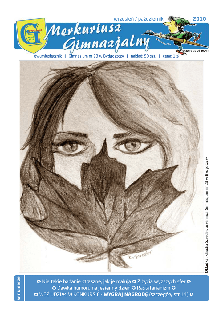 wrzesień / październik 2010 ukazuje się od 2004 r. w numerze Okładka: Klaudia Szreder, uczennica Gimnazjum nr 23 w Bydgoszczy dwumiesięcznik | Gimnazjum nr 23 w Bydgoszczy | nakład: 50 szt. | cena: 1 zł J Nie takie badanie straszne, jak je malują J Z życia wyższych sfer J J Dawka humoru na jesienny dzień J Rastafarianizm J J WEŹ UDZIAŁ W KONKURSIE - WYGRAJ NAGRODĘ (szczegóły str.14) J 2 Jula, Anucha i Szreducha, to nie jest taka zwykła podpucha. Dzisiaj Was zachęcić chcemy, by do biblioteki wchodzić bez tremy. Pani Alina już zza drzwi kuka, czy biblioteki ktoś nie szuka. Takimi słowami aktyw biblioteczny na czele z panią Aliną Gawrońską każdego dnia zaprasza gimnazjalistów do wypożyczania książek. A jest w czym wybierać! Młodzież naszej szkoły nie próżnuje. Chce wiedzieć, jak najwięcej. Dlatego wzięła udział w ogólnopolskiej kampanii edukacyjnej „Arka dla Ziemi” na Starym Rynku. Uczniowie obejrzeli prezentację mul;medialną dotyczącą zmian klimatycznych i anomalii pogodowych, a potem działali: wykonywali ręcznie nadruki na torbach materiałowych, robili graffi; na drewnianych klamerkach, lepili z gliny. SZKOLNY EXPRESS Klasy 1b, 2b i 3d wzięły udział w programie edukacji ekologicznej pod nazwą „To, co nas otacza…”, realizowanym w ramach międzynarodowego projektu „Harcerska natura” w Funce. W malowniczo położonym ośrodku harcerskim podczas warsztatów i zajęć terenowych uczniowie poznali stan czystości wód, florę i faunę Parku Narodowego Borów Tucholskich, a także zasady ogrodnictwa ekologicznego. Choć pogoda nie dopisała, uczestnicy wrócili zadowoleni z tak nietypowej formy nauki. Społeczność szkolna uczestniczyła w uroczystym otwarciu Sportowego Roku Szkolnego na Stadionie Miejskim. Wręczono nagrody za sukcesy sportowe w ubiegłym roku szkolnym. Nasze gimnazjum zajęło II miejsce. Szkolny Wolontariat pracuje pełną parą. Zabezpieczał pod względem organizacyjnotechnicznym Ogólnopolski Rajd Niepełnosprawnych oraz pomagał Fundacji „Mam Marzenie” podczas Ogólnopolskiego Dnia Marzeń w Focus Parku. O tym, że uczniowie są grzecznymi dziećmi młodzież przekonała się, oglądając występ gimnazjalistów z klasy 2d. Lekcja godziny wychowawczej w ich wykonaniu była majstersztykiem. Pełna ekspresji gra młodych wykonawców, świetnie dobrane stroje oraz wpadające w ucho piosenki zespołu wokalnego sprawiły, że występ wszystkim się podobał. Anna Marczyńska AKTYWNI I SAMORZĄDNI 3 W e wrześniu odbyły się wybory do Rady Samorządu Uczniowskiego G-23. Wzięły w nich udział wszystkie klasy tj. 368 osób obecnych w tym dniu w szkole. Do RSU zakwalifikowało się 10 osób z liczbą głosów od 50 do 145. Funkcję przewodniczącej RSU pełnić będzie w tym roku uczennica klasy 3b - Marika Brenk (145 głosów), jej zastępcą został uczeń klasy 2d - Kamil Mroczkowski (128 głosów). GRATULUJEMY I ŻYCZYMY OWOCNEJ PRACY, WIELU POMYSŁÓW I CIEKAWYCH INICJATYW NA RZECZ SZKOŁY. W Y B ORY DO RSU ZADANIA DO REALIZACJI: Wrzesień 2010: •Zebranie przedwyborcze przewodniczących klas i kandydatów do RSU; •Wybory do RSU; •Akcja - „Złotówka dla biblioteki”; •Akcja pod hasłem „Pomóżmy sobie sami - zbiórka papieru ksero dla sekretariatu”; •Ogólnopolska akcja „Obudź się przeciwdziałanie narkomani”; •Udział w plebiscycie Gazety Pomorskiej „Fajna Szkoła” - akcja sms-owa; •Wybory najmilszego chłopaka z okazji obchodów Dnia Chłopca; •Reaktywacja akcji zbiórki plastikowych nakrętek na pomoc w rehabilitacji chorego chłopca- Arka Karbownika. Październik 2010: •Kontynuacja zbiórki nakrętek na rzecz chorego Arka; •Podsumowanie akcji „Złotówka dla biblioteki”, zbiórka papieru ksero; •Zebranie członków RSU i sekcji Radia Decybel (ustalenie regulaminu i dyżurów w szkolnym radiowęźle); •Współorganizowanie apelu z okazji Dnia Nauczyciela UROCZYSTE ZAPRZYSIĘŻENIE RSU; •Ogłoszenie akcji na najładniejszą gazetkę z okazji Wszystkich Świętych - organizator klasa 3d; •Ogłoszenie akcji Halloween w naszej szkole. - organizator klasa 3d; •Rozpoczęcie akcji - zbiórka zużytych baterii (długoterminowo we współpracy z Urzędem Miasta Bydgoszczy) - organizator klasa 2b. Opiekun RSU: Arle1a Reszkowska 4 OKIEM REPORTERA LEPIEJ ROZMAWIAĆ NIŻ KŁÓCIĆ SIĘ J dziemy ulicą: pierwszy billboard, drugi billboard, trzeci billboard… i tak można by li- najmniej pięć ulotek reklamujących najróżniejsze firmy, szkoły, restauracje i przedsięwzięcia. Gdy wieczorem zasiądziemy przed telewizorem by obejrzeć dobry film w komercyjnej stacji, możemy odnieść wrażenie, jakbyśmy oglądali reklamy z przerwą na wybrany przez nas program. Trzeba spojrzeć prawdzie w oczy: reklama XXI wieku atakuje nas ze wszystkich stron. Czy jest nam potrzebna? A może tylko przeszkadza? Na ten temat porozmawiałam z uczniami naszego gimnazjum. Właściwie za każdym razem słyszałam odpowiedzi typu: „Oczywiście, bez niej nie wiedzielibyśmy, jaki jest nowy produkt na rynku”, „Jest potrzebna, bo dzięki niej łatwiej jest nam podejmować decyzje związane z kupnem”. Na pytanie: „Czy reklama cię denerwuje?” również więk- czyć bardzo długo. Wystarczy przejść przez bydgoski Stary Rynek, a później ulicę Mostową, aby zaopatrzyć się w co szość osób reagowała podobnie. Pewna długowłosa pierwszoklasistka ujęła to tak: „Są reklamy, które mnie dener- uż po raz trzeci obchodzi- liśmy w Polsce Międzynarodowy Dzień Mediacji. W naszym kraju instytucja służąca pokojowemu rozwiązywaniu konfliktów istnieje od lat, jednak wiele osób nie zdaje sobie sprawy z tego, że jest to niezwykle skuteczny sposób likwidowania sporów. Pozwala zaoszczędzić czas, nerwy i pieniądze. A wszystko zaczęło się w Australii i Nowej Zelandii. To tam wprowadzono obyczaj mediacji i naprawienia szkody przez sprawcę. Z badań statystycz