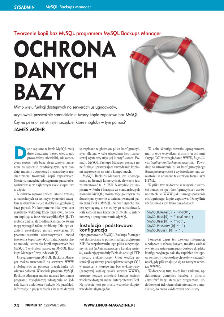 SYSADMIN MySQL Backups Manager Tworzenie kopii baz MySQL programem MySQL Backups Manager OCHRONA DANYCH BAZY Mimo wielu funkcji dostępnych na serwerach usługodawców, użytkownik przeważnie samodzielnie tworzy kopie zapasowe baz MySQL. Czy na pewno nie istnieje narzędzie, które mogłoby w tym pomóc? JAMES MOHR D ane zapisane w bazie MySQL mają duże znaczenie nawet wtedy, gdy prowadzimy niewielki, niekomercyjny serwis. Jeśli baza ulega częstym zmianom na systemie produkcyjnym, tym bardziej musimy dysponować niezawodnym mechanizmem tworzenia kopii zapasowych. Niestety, narzędzia udostępniane przez usługodawców są w najlepszym razie kłopotliwe w użyciu. Niedawno wprowadzałem istotne zmiany w bazie danych na testowym systemie i zacząłem zastanawiać się, co stałoby się, gdybym tę bazę popsuł. Na komputerze lokalnym sam regularnie wykonuję kopie zapasowe, po prostu kopiując w inne miejsce pliki MySQL. Ta metoda działa, ale z odtwarzaniem po awarii mogą wystąpić różne problemy. Dlatego zacząłem poszukiwać innych rozwiązań. Po przeanalizowaniu alternatywnych metod tworzenia kopii bazy SQL (patrz Ramka „Inne metody tworzenia kopii zapasowych baz MySQL”) wybrałem narzędzie MySQL Backups Manager firmy indexsoft [1]. Oprogramowanie MySQL Backups Manager można uruchomić na serwerze WWW i obsługiwać za pomocą przeglądarki lub wiersza poleceń. Właściwie program MySQL Backups Manager można nazwać frontonem programu mysqldump; udostępnia on jednak liczne dodatkowe funkcje. Na przykład, informacje o połączeniach z bazami danych 74 NUMER 17 CZERWIEC 2005 są zapisane w głównym pliku konfiguracyjnym, dlatego w celu utworzenia kopii zapasowej wystarczy użyć jej identyfikatora. Ponadto MySQL Backups Manager posiada inne funkcje upraszczające zarządzanie kopiami zapasowymi na wielu komputerach. MySQL Backups Manager jest udostępniany na licencji komercyjnej, ale warto jest zainwestować te 15 USD. Narzędzie jest napisane w Perlu i korzysta ze standardowych narzędzi MySQL; można więc go używać na dowolnym systemie z zainstalowanymi pakietami Perl i MySQL. Serwer Apache nie jest wymagany, ale musimy go zainstalować, jeśli zamierzamy korzystać z interfejsu internetowego oprogramowania MySQL. Instalacja i podstawowa konfiguracja Oprogramowanie MySQL Backups Manager jest dostarczane w postaci małego archiwum ZIP. Po rozpakowaniu tego pliku otrzymujemy skrypt backupsmanager.cgi i katalog modules, zawierający moduły Perla do obsługi FTP i poczty elektronicznej. Choć według instrukcji wystarczy przekopiować skrypt CGI w miejsce, z którego ma być wykonywany (zazwyczaj katalog cgi-bin serwera WWW), musimy jeszcze umieścić katalog modules w ścieżce dostępu znanej interpreterowi Perl. Najprościej jest po prostu wszystko skopiować do katalogu cgi-bin. WWW.LINUX-MAGAZINE.PL W celu skonfigurowania oprogramowania, przede wszystkim musimy uruchomić skrypt CGI w przeglądarce WWW, http://linux.local/cgi-bin/backupsmanager.cgi. Powoduje to utworzenie pliku konfiguracyjnego (backupsmanager.pm) i wyświetlenie jego zawartości w obszarze tekstowym formularza HTML. W pliku tym widoczne są wszystkie wartości domyślne opcji konfiguracyjnych zarówno interfejsu WWW, jak i samego polecenia obsługującego kopie zapasowe. Domyślnie zdefiniowana jest tylko baza danych: $mySQLDBName[0] = 'mydb0'; $mySQLHost[0] = 'localhost'; $mySQLUser[0] = 'root'; $mySQLPassword[0] = ''; $mySQLDBEmail[0] = ''; Ponieważ zapis ten zawiera informację o połączeniu z bazą danych, musimy zadbać o właściwe ustawienie praw dostępu do pliku konfiguracyjnego, tak aby zapobiec dostępowi ze strony niepowołanych osób (w szczególności, gdy plik znajduje się na naszym serwerze WWW). Widoczne są tutaj także inne zmienne, np. definiujące domyślny katalog z plikami „zrzutów” bazy, sterujące programami dodatkowymi itd. Generalnie nietrudno domyślić się, do czego każda z tych opcji służy. MySQL Backups Manager Po skonfigurowaniu programu możemy już tworzyć kopie zapasowe. W tym celu używamy interfejsu WWW, albo wykonujemy proste polecenie: backupsmanager.cgi --db=# Gdzie # jest numerem bazy danych zgodnym z zawartością pliku konfiguracyjnego. Lokalizacja zapisana jest w zmiennej $DBDumpsDir i domyślnie jest to podkatalog dumps katalogu, w którym pracuje skrypt backupsmanager.cgi. Katalogu docelowego nie możemy zmienić, możemy jednak zastosować opcję --filename= i za jej pomocą wskazać plik inny niż domyślny (tj. RRRR-MM-DD.sql). Przesyłanie kopii bazy Nawet jeśli na serwerze WWW możemy korzystać z usługi cron i za jej pomocą uruchamiać program MySQL Backups Manager, lokalne zapisywanie kopii nie zawsze wystarcza. Jeśli chcemy dysponować różnymi kopiami zapasowymi, a na serwerze nie ma wystarczająco dużo miejsca, dobrze byłoby przenieść kopie na inny komputer. Jak wspomniałem, pliki ze „zrzutami” baz można przesyłać e-mailem. Nawet jeśli nie możemy wysyłać listów do innych komputerów, być może mamy możliwość wysyłania lokalnego (np. pod adres administratora strony). Zwróćmy uwagę, że najczęściej nie wystarczy ustawić adresu e-mail na wartość webmaster lub podobną. Nawet jeśli wiadomość z pocztą ma dotrzeć do innego użytkownika tego samego hosta, nazwę hosta trzeba podać (np. webmaster@localhost). Program MySQL Backups Manager wysyła pocztę za pomocą modułu SendMail.pm. Jeśli moduł ten nie działa, musimy odpowiednio zmodyfikować zmienną $SMTP, umieszczając tam polecenie wysyłające wiadomość e-mail. Na przykład: $SMTP = '|/usr/sbin/sendmail -t'; Plik z kopią możemy wysłać albo za pomocą interfejsu WWW, albo z wiersza poleceń, przez użycie opcji -mail. Należy zwrócić uwagę, że jeśli w pliku konfiguracyjnym ustawiona jest zmienna $mySQLDBEmail[], zawsze stosowana jest jej wartość – nawet jeśli podamy adres e-mail za pomocą opcji -email. Jeśli zmie
