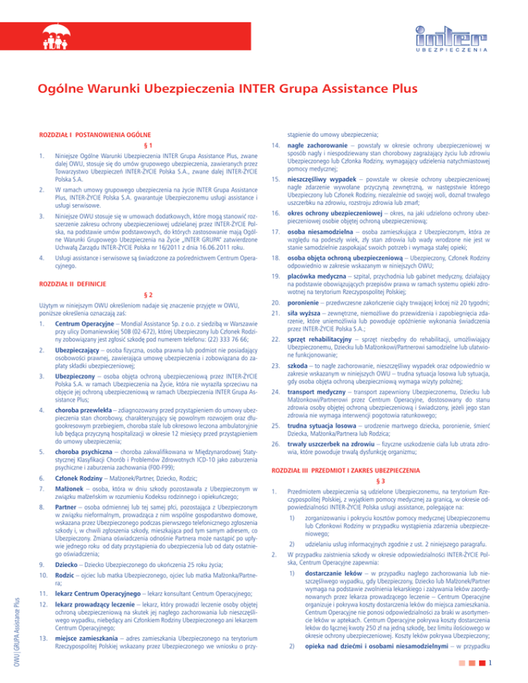 Ogólne Warunki Ubezpieczenia INTER Grupa Assistance Plus ROZDZIAŁ I POSTANOWIENIA OGÓLNE §1 1. Niniejsze Ogólne Warunki Ubezpieczenia INTER Grupa Assistance Plus, zwane dalej OWU, stosuje się do umów grupowego ubezpieczenia, zawieranych przez Towarzystwo Ubezpieczeń INTER-ŻYCIE Polska S.A., zwane dalej INTER-ŻYCIE Polska S.A. stąpienie do umowy ubezpieczenia; 14. nagłe zachorowanie – powstały w okresie ochrony ubezpieczeniowej w sposób nagły i niespodziewany stan chorobowy zagrażający życiu lub zdrowiu Ubezpieczonego lub Członka Rodziny, wymagający udzielenia natychmiastowej pomocy medycznej; 2. W ramach umowy grupowego ubezpieczenia na życie INTER Grupa Assistance Plus, INTER-ŻYCIE Polska S.A. gwarantuje Ubezpieczonemu usługi assistance i usługi serwisowe. 15. nieszczęśliwy wypadek – powstałe w okresie ochrony ubezpieczeniowej nagłe zdarzenie wywołane przyczyną zewnętrzną, w następstwie którego Ubezpieczony lub Członek Rodziny, niezależnie od swojej woli, doznał trwałego uszczerbku na zdrowiu, rozstroju zdrowia lub zmarł; 3. Niniejsze OWU stosuje się w umowach dodatkowych, które mogą stanowić rozszerzenie zakresu ochrony ubezpieczeniowej udzielanej przez INTER-ŻYCIE Polska, na podstawie umów podstawowych, do których zastosowanie mają Ogólne Warunki Grupowego Ubezpieczenia na Życie „INTER GRUPA” zatwierdzone Uchwałą Zarządu INTER-ŻYCIE Polska nr 16/2011 z dnia 16.06.2011 roku. 16. okres ochrony ubezpieczeniowej – okres, na jaki udzielono ochrony ubezpieczeniowej osobie objętej ochroną ubezpieczeniową; 17. osoba niesamodzielna – osoba zamieszkująca z Ubezpieczonym, która ze względu na podeszły wiek, zły stan zdrowia lub wady wrodzone nie jest w stanie samodzielnie zaspokajać swoich potrzeb i wymaga stałej opieki; Usługi assistance i serwisowe są świadczone za pośrednictwem Centrum Operacyjnego. 18. osoba objęta ochroną ubezpieczeniową – Ubezpieczony, Członek Rodziny odpowiednio w zakresie wskazanym w niniejszych OWU; 4. ROZDZIAŁ II DEFINICJE §2 Użytym w niniejszym OWU określeniom nadaje się znaczenie przyjęte w OWU, poniższe określenia oznaczają zaś: 1. Centrum Operacyjne – Mondial Assistance Sp. z o.o. z siedzibą w Warszawie przy ulicy Domaniewskiej 50B (02-672), której Ubezpieczony lub Członek Rodziny zobowiązany jest zgłosić szkodę pod numerem telefonu: (22) 333 76 66; 2. Ubezpieczający – osoba fizyczna, osoba prawna lub podmiot nie posiadający osobowości prawnej, zawierająca umowę ubezpieczenia i zobowiązana do zapłaty składki ubezpieczeniowej; 3. Ubezpieczony – osoba objęta ochroną ubezpieczeniową przez INTER-ŻYCIE Polska S.A. w ramach Ubezpieczenia na Życie, która nie wyraziła sprzeciwu na objęcie jej ochroną ubezpieczeniową w ramach Ubezpieczenia INTER Grupa Assistance Plus; 4. choroba przewlekła – zdiagnozowany przed przystąpieniem do umowy ubezpieczenia stan chorobowy, charakteryzujący się powolnym rozwojem oraz długookresowym przebiegiem, choroba stale lub okresowo leczona ambulatoryjnie lub będąca przyczyną hospitalizacji w okresie 12 miesięcy przed przystąpieniem do umowy ubezpieczenia; 5. choroba psychiczna – choroba zakwalifikowana w Międzynarodowej Statystycznej Klasyfikacji Chorób i Problemów Zdrowotnych ICD-10 jako zaburzenia psychiczne i zaburzenia zachowania (F00-F99); 6. Członek Rodziny – Małżonek/Partner, Dziecko, Rodzic; 7. Małżonek – osoba, która w dniu szkody pozostawała z Ubezpieczonym w związku małżeńskim w rozumieniu Kodeksu rodzinnego i opiekuńczego; 8. Partner – osoba odmiennej lub tej samej płci, pozostająca z Ubezpieczonym w związku nieformalnym, prowadząca z nim wspólne gospodarstwo domowe, wskazana przez Ubezpieczonego podczas pierwszego telefonicznego zgłoszenia szkody i, w chwili zgłoszenia szkody, mieszkająca pod tym samym adresem, co Ubezpieczony. Zmiana oświadczenia odnośnie Partnera może nastąpić po upływie jednego roku od daty przystąpienia do ubezpieczenia lub od daty ostatniego oświadczenia; 9. Dziecko – Dziecko Ubezpieczonego do ukończenia 25 roku życia; 10. Rodzic – ojciec lub matka Ubezpieczonego, ojciec lub matka Małżonka/Partnera; 19. placówka medyczna – szpital, przychodnia lub gabinet medyczny, działający na podstawie obowiązujących przepisów prawa w ramach systemu opieki zdrowotnej na terytorium Rzeczypospolitej Polskiej; 20. poronienie – przedwczesne zakończenie ciąży trwającej krócej niż 20 tygodni; 21. siła wyższa – zewnętrzne, niemożliwe do przewidzenia i zapobiegnięcia zdarzenie, które uniemożliwia lub powoduje opóźnienie wykonania świadczenia przez INTER-ŻYCIE Polska S.A.; 22. sprzęt rehabilitacyjny – sprzęt niezbędny do rehabilitacji, umożliwiający Ubezpieczonemu, Dziecku lub Małżonkowi/Partnerowi samodzielne lub ułatwione funkcjonowanie; 23. szkoda – to nagłe zachorowanie, nieszczęśliwy wypadek oraz odpowiednio w zakresie wskazanym w niniejszych OWU – trudna sytuacja losowa lub sytuacja, gdy osoba objęta ochroną ubezpieczniową wymaga wizyty położnej; 24. transport medyczny – transport zapewniony Ubezpieczonemu, Dziecku lub Małżonkowi/Partnerowi przez Centrum Operacyjne, dostosowany do stanu zdrowia osoby objętej ochroną ubezpieczeniową i świadczony, jeżeli jego stan zdrowia nie wymaga interwencji pogotowia ratunkowego; 25. trudna sytuacja losowa – urodzenie martwego dziecka, poronienie, śmierć Dziecka, Małżonka/Partnera lub Rodzica; 26. trwały uszczerbek na zdrowiu – fizyczne uszkodzenie ciała lub utrata zdrowia, które powoduje trwałą dysfunkcję organizmu; ROZDZIAŁ III PRZEDMIOT I ZAKRES UBEZPIECZENIA §3 1. 2. Przedmiotem ubezpieczenia są udzielone Ubezpieczonemu, na terytorium Rzeczypospolitej Polskiej, z wyjątkiem pomocy medycznej za granicą, w okresie odpowiedzialności INTER-ŻYCIE Polska usługi assistance, polegające na: 1) zorganizowaniu i pokryciu kosztów pomocy 