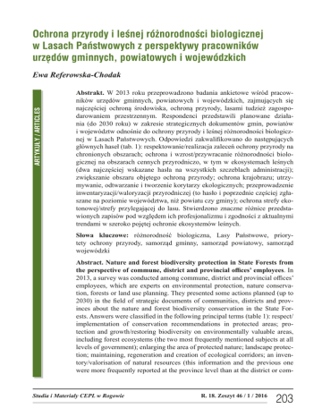 Ochrona przyrody i leśnej różnorodności biologicznej w Lasach Państwowych z perspektywy pracowników urzędów gminnych, powiatowych i wojewódzkich ARTYKUŁY / ARTICLES Ewa Referowska-Chodak Abstrakt. W 2013 roku przeprowadzono badania ankietowe wśród pracowników urzędów gminnych, powiatowych i wojewódzkich, zajmujących się najczęściej ochroną środowiska, ochroną przyrody, lasami tudzież zagospodarowaniem przestrzennym. Respondenci przedstawili planowane działania (do 2030 roku) w zakresie strategicznych dokumentów gmin, powiatów i województw odnośnie do ochrony przyrody i leśnej różnorodności biologicznej w Lasach Państwowych. Odpowiedzi zakwalifikowano do następujących głównych haseł (tab. 1): respektowanie/realizacja zaleceń ochrony przyrody na chronionych obszarach; ochrona i wzrost/przywracanie różnorodności biologicznej na obszarach cennych przyrodniczo, w tym w ekosystemach leśnych (dwa najczęściej wskazane hasła na wszystkich szczeblach administracji); zwiększanie obszaru objętego ochroną przyrody; ochrona krajobrazu; utrzymywanie, odtwarzanie i tworzenie korytarzy ekologicznych; przeprowadzenie inwentaryzacji/waloryzacji przyrodniczej (to hasło i poprzednie częściej zgłaszane na poziomie województwa, niż powiatu czy gminy); ochrona strefy ekotonowej/strefy przylegającej do lasu. Stwierdzono znaczne różnice przedstawionych zapisów pod względem ich profesjonalizmu i zgodności z aktualnymi trendami w szeroko pojętej ochronie ekosystemów leśnych. Słowa kluczowe: różnorodność biologiczna, Lasy Państwowe, priorytety ochrony przyrody, samorząd gminny, samorząd powiatowy, samorząd wojewódzki Abstract. Nature and forest biodiversity protection in State Forests from the perspective of commune, district and provincial offices’ employees. In 2013, a survey was conducted among commune, district and provincial offices’ employees, which are experts on environmental protection, nature conservation, forests or land use planning. They presented some actions planned (up to 2030) in the field of strategic documents of communities, districts and provinces about the nature and forest biodiversity conservation in the State Forests. Answers were classified in the following principal terms (table 1): respect/ implementation of conservation recommendations in protected areas; protection and growth/restoring biodiversity on environmentally valuable areas, including forest ecosystems (the two most frequently mentioned subjects at all levels of government); enlarging the area of protected nature; landscape protection; maintaining, regeneration and creation of ecological corridors; an inventory/valorisation of natural resources (this information and the previous one were more frequently reported at the province level than at the district or com- Studia i Materiały CEPL w Rogowie R. 18. Zeszyt 46 / 1 / 2016 203 mune one); protection of ecotone zone/area adjacent to the forest. Regarding to submitted information, it was also found to have significant differences of their professionalism and compliance with current trends in the protection of forest ecosystems. Key words: biodiversity, the State Forests, nature protection priorities, commune government, district government, provincial government Wstęp Tereny administrowane przez nadleśnictwa Lasów Państwowych położone są jednocześnie w granicach gmin, powiatów i województw. Mimo że za realizację gospodarki leśnej i stan lasu odpowiada samodzielnie nadleśniczy (Ustawa 1991 – art. 35.1), to istnieje płaszczyzna współpracy i relacji pomiędzy nadleśnictwami i jednostkami samorządu terytorialnego. Z jednej strony projekt planu urządzenia lasu podlega konsultacjom społecznym, w których mogą uczestniczyć jednostki samorządu terytorialnego (Ustawa 2008 – art. 54, Zarządzenie 2009 – Załącznik 1). Z drugiej strony w projekcie planu urządzenia lasu określa się przewidywany wpływ realizacji założeń polityki przestrzennego zagospodarowania gmin oraz całego regionu na prowadzenie trwale zrównoważonej gospodarki leśnej, w tym ochronę ekosystemów leśnych. Podstawą do tej oceny są m.in. regionalne strategie rozwoju oraz regionalne programy ochrony środowiska (Instrukcja 2011a – § 7.1.2 i § 9). W dobie coraz większego wpływu społeczeństwa na zarządzanie środowiskiem dużego znaczenia nabiera rozpoznanie społecznych opinii i oczekiwań w tej kwestii, gdyż może to pozwolić na dopasowanie polityki rozwoju danej jednostki – czy to nadleśnictwa, czy jednostki samorządu terytorialnego. Celem niniejszego opracowania jest przedstawienie planów w zakresie ochrony różnorodności biologicznej leśnych ekosystemów do roku 2030 (w Lasach Państwowych), sformułowanych na szczeblu gmin, powiatów i województw. Metodyka badań Materiał zebrano w 2013 roku w ramach szerszych badań ankietowych (Referowska-Chodak i in. 2015), a w przypadku wątpliwości zweryfikowano i uzupełniono mailowo i telefonicznie w roku 2013 i 2014. W niektórych przypadkach skorzystano też z dokumentów zamieszczonych w internecie, a wskazanych przez respondentów. W elektronicznych ankietach zadano pytanie: „Jakie są przewidywane (planowane) w okresie do 2030 roku założenia i działania względem ochrony przyrody w Lasach Państwowych?” w zakresie strategicznych dokumentów gmin, powiatów i województw. Dotyczyło to następujących dokumentów: programu ochrony środowiska (gminy, powiatu i województwa), strategii rozwoju (gminy i województwa), studium uwarunkowań i kierunków zagospodarowania przestrzennego (gminy) oraz planów zagospodarowania przestrzennego (gminy i województwa). Zarządy powiatów oraz zarządy województw zostały dodatkowo zapytane o „podejście w zakresie ochrony przyrody w Lasach Państwowych”, jakie „zamierzają reprezentować przy uzgadnianiu projektów” dokumentów związanych z zagospodarowaniem przestrzennym na poziom
