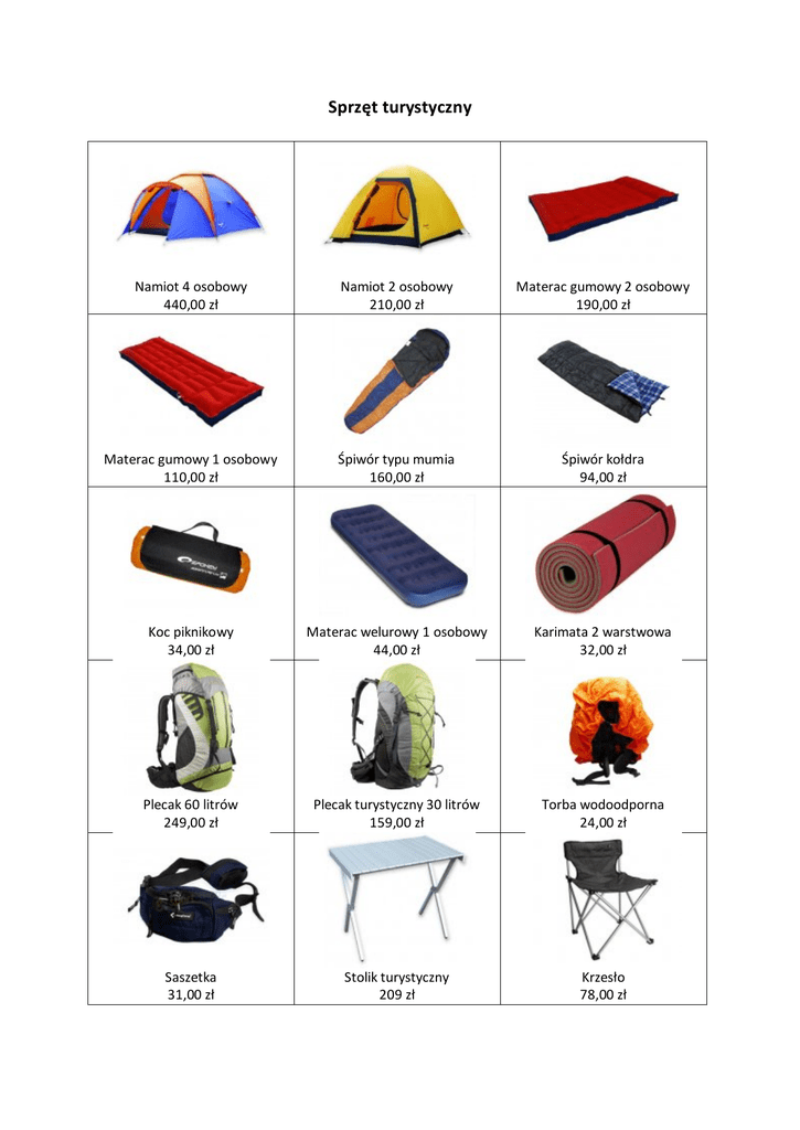 Sprzęt turystyczny Namiot 4 osobowy 440,00 zł Namiot 2 osobowy 210,00 zł Materac gumowy 2 osobowy 190,00 zł Materac gumowy 1 osobowy 110,00 zł Śpiwór typu mumia 160,00 zł Śpiwór kołdra 94,00 zł Koc piknikowy 34,00 zł Materac welurowy 1 osobowy 44,00 zł Karimata 2 warstwowa 32,00 zł Plecak 60 litrów 249,00 zł Plecak turystyczny 30 litrów 159,00 zł Torba wodoodporna 24,00 zł Saszetka 31,00 zł Stolik turystyczny 209 zł Krzesło 78,00 zł