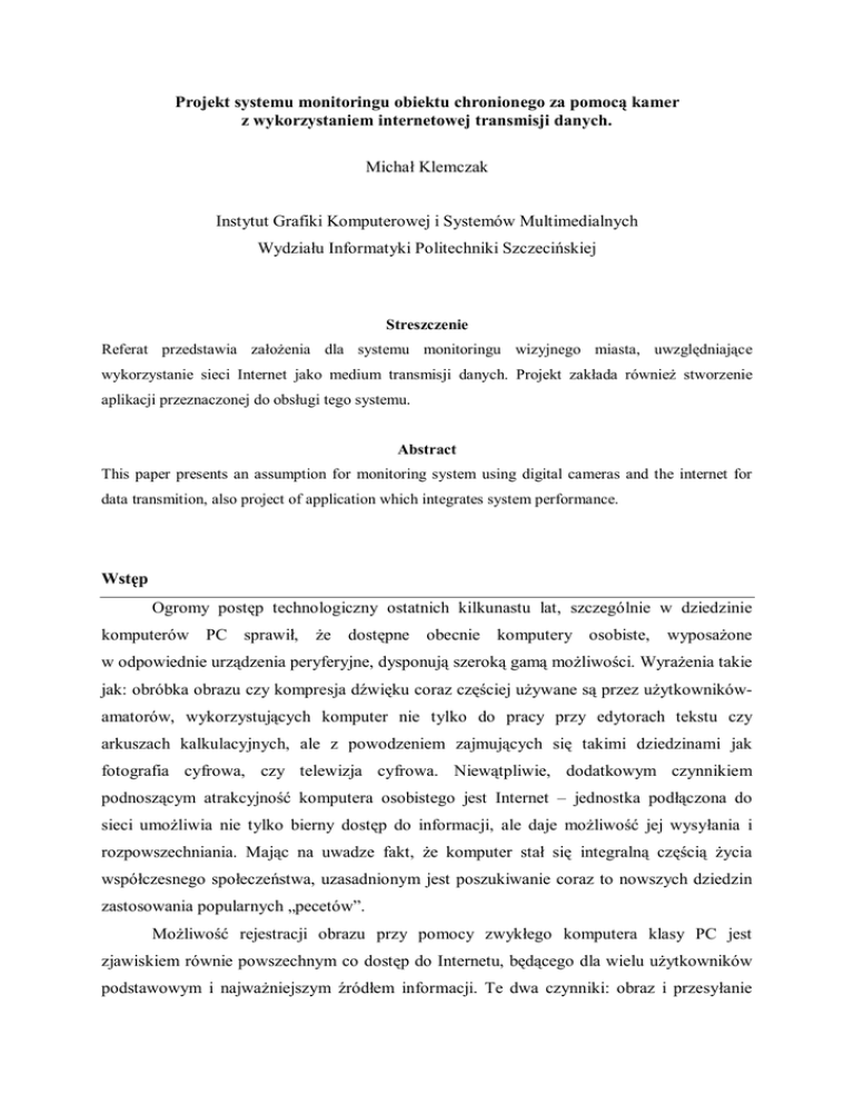 Projekt systemu monitoringu obiektu chronionego za pomocą kamer z wykorzystaniem internetowej transmisji danych. Michał Klemczak Instytut Grafiki Komputerowej i Systemów Multimedialnych Wydziału Informatyki Politechniki Szczecińskiej Streszczenie Referat przedstawia założenia dla systemu monitoringu wizyjnego miasta, uwzględniające wykorzystanie sieci Internet jako medium transmisji danych. Projekt zakłada również stworzenie aplikacji przeznaczonej do obsługi tego systemu. Abstract This paper presents an assumption for monitoring system using digital cameras and the internet for data transmition, also project of application which integrates system performance. Wstęp Ogromy postęp technologiczny ostatnich kilkunastu lat, szczególnie w dziedzinie komputerów PC sprawił, że dostępne obecnie komputery osobiste, wyposażone w odpowiednie urządzenia peryferyjne, dysponują szeroką gamą możliwości. Wyrażenia takie jak: obróbka obrazu czy kompresja dźwięku coraz częściej używane są przez użytkownikówamatorów, wykorzystujących komputer nie tylko do pracy przy edytorach tekstu czy arkuszach kalkulacyjnych, ale z powodzeniem zajmujących się takimi dziedzinami jak fotografia cyfrowa, czy telewizja cyfrowa. Niewątpliwie, dodatkowym czynnikiem podnoszącym atrakcyjność komputera osobistego jest Internet – jednostka podłączona do sieci umożliwia nie tylko bierny dostęp do informacji, ale daje możliwość jej wysyłania i rozpowszechniania. Mając na uwadze fakt, że komputer stał się integralną częścią życia współczesnego społeczeństwa, uzasadnionym jest poszukiwanie coraz to nowszych dziedzin zastosowania popularnych „pecetów”. Możliwość rejestracji obrazu przy pomocy zwykłego komputera klasy PC jest zjawiskiem równie powszechnym co dostęp do Internetu, będącego dla wielu użytkowników podstawowym i najważniejszym źródłem informacji. Te dwa czynniki: obraz i przesyłanie informacji, traktowane jako podstawowe składniki każdego systemu monitoringu wizyjnego, przemawiają za nową koncepcją wykorzystania zwykłego komputera i połączeń sieci komputerowych typu LAN lub WAN, które na dzień dzisiejszy w zakresie zabezpieczeń są ciągle w fazie eksperymentalnej. Celem niniejszej pracy jest zaprezentowanie możliwości stworzenia systemu, który poprzez zastosowanie odpowiedniej kompresji obrazu, poprawnej transmisji danych i właściwej ich interpretacji – stanowić będzie narzędzie, pracujące jako poprawnie zaprojektowany system monitoringu wizyjnego, pełniącego trzy podstawowe funkcje: archiwizacyjną, prewencyjną i nadzoru bieżącego. Analogowe systemy CCTV Główną domeną telewizji przemysłowej (CCTV) jest zapewnienie bezpieczeństwa obiektów, osób i mienia. Zainstalowane kamery umożliwiają zdalny nadzór banków, dworców, biurowców, stacji benzynowych, a nawet całych miast. Wykorzystanie kilku, kilkudziesięciu czy kilkuset kamer umożliwia wirtualną obecność małej grupki strażników w wielu miejscach jednocześnie i szybkie "przemieszczanie się" nadzorującego między odległymi punktami obiektu. Wyposażenie systemu w urządzenia rejestrujące - magnetowidy - pozwala zabezpieczyć materiał dowodowy na potrzeby śledztwa w przypadku ewentualnego przestępstwa. Układ podglądu za pomocą jednej analogowej kamery i monitora jest stosunkowo prosty i niedrogi, natomiast gdy potrzebny jest bardziej rozbudowany system, z większą liczbą kamer rozmieszczonych na rozległym obszarze – pojawia się szereg czynników, które w istotny sposób wpływają na proces wdrożenia takiego systemu. Za najważniejsze wady możemy uznać: · przesyłanie sygnału analogowego, zwłaszcza na większe odległości, wymaga instalowania okablowania o wysokiej jakości, co naturalnie wpływa na koszty · oglądanie obrazów z wielu kamer na jednym monitorze oznacza konieczność wyposażenia systemu w dodatkowe skomplikowane urządzenia analogowe, np. multipleksery. · do rejestrowania obrazu nie wystarcza zwykły magnetowid VHS, a wyspecjalizowane urządzenia są oczywiście droższe. Ograniczona pojemność kasety wymusza konieczność okresowej obsługi, ogranicza też funkcjonalność systemu, Cyfrowe rozwiązania w systemach monitoringu Powyższe ograniczenia nie dotyczą w ogóle systemów cyfrowych. Sygnał w postaci cyfrowej nie ulega degradacji w czasie przesyłania, można go więc przesyłać na dowolne odległości. Co więcej, do transmisji można wykorzystać prawie dowolne medium – od dedykowanej linii, przez istniejące okablowanie sieci lokalnej (np. Ethernet), po łącza telefoniczne (analogowe lub ISDN) czy najszerzej pojęty Internet. Rolę końcówki monitorującej może spełniać dedykowane urządzenie, można jednak wykorzystać do tego standardowy lub nieco rozbudowany komputer PC. Systemy cyfrowe są też bardzo łatwo skalowalne. Wyświetlanie obrazu z wielu kamer czy zmiana jego źródła nie wymagają stosowania przełączników czy multiplekserów – wszystko odbywa się na drodze programowej. Rolę konsoli operatorskiej pełni ekranowe menu, standardowa mysz i klawiatura. Obraz przesyłany jest w postaci skompresowanej, a więc zajmuje znacznie mniejsze od analogowego pasmo transmisyjne i pozwala np. bez problemów przesyłać sygnał z kilku kamer jednym łączem. Kompresja obrazu ułatwia też jego rejestrowanie, oczywiście na twardych dyskach. Funkcjonalność systemów cyfrowych wykracza daleko poza zwykłe powielenie możliwości układów analogowych. Zastosowania informatyczne w dziedzinie monitoringu to przede wszystkim: · cyfrowa obróbka obrazu zapewnia łatwą realizację zaawansowanych, odpornych na zakłócenia funkcji wykrywania ruchu; · możliwość natychmiastowego powiadomienia operatora o zdarzeniu (poprzez SMS, email) i pokazanie mu obrazu z właściwej kamery · możliwość rejestrowanie na dysku wyłącznie ujęć, na których coś się dzieje (dzięki b