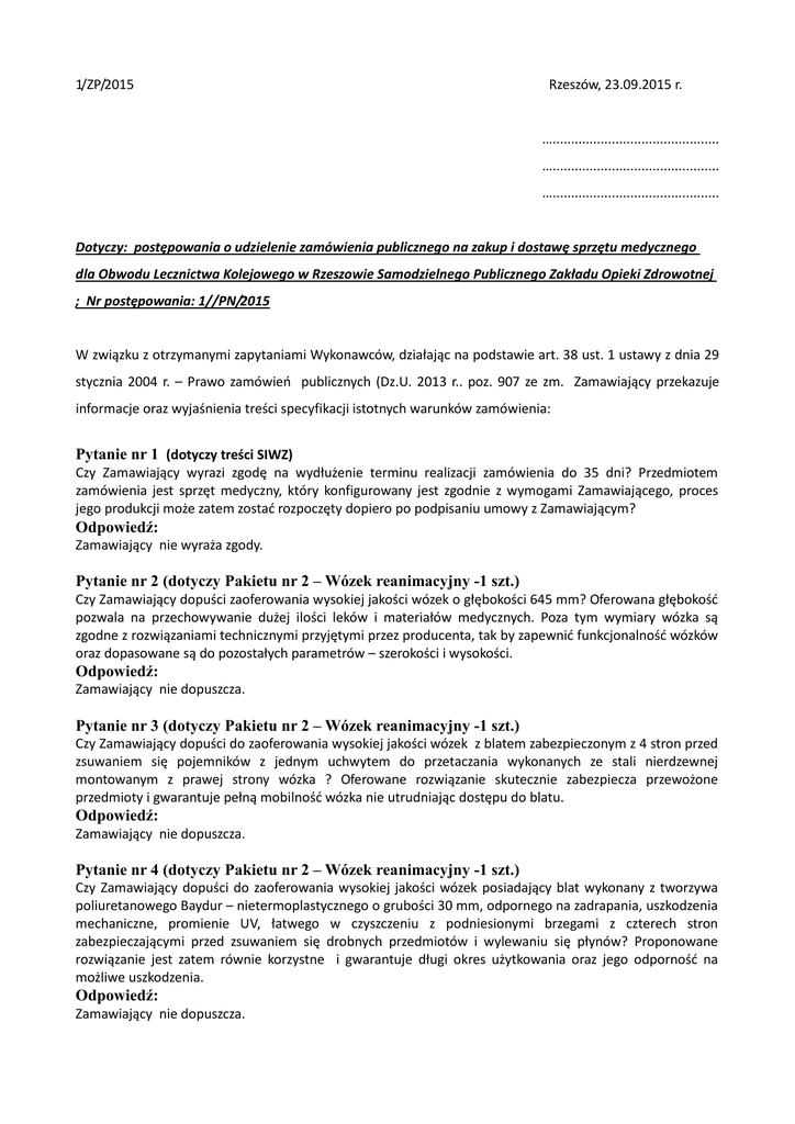 1/ZP/2015 Rzeszów, 23.09.2015 r. …............................................. …............................................. …............................................. Dotyczy: postępowania o udzielenie zamówienia publicznego na zakup i dostawę sprzętu medycznego dla Obwodu Lecznictwa Kolejowego w Rzeszowie Samodzielnego Publicznego Zakładu Opieki Zdrowotnej ; Nr postępowania: 1//PN/2015 W związku z otrzymanymi zapytaniami Wykonawców, działając na podstawie art. 38 ust. 1 ustawy z dnia 29 stycznia 2004 r. – Prawo zamówień publicznych (Dz.U. 2013 r.. poz. 907 ze zm. Zamawiający przekazuje informacje oraz wyjaśnienia treści specyfikacji istotnych warunków zamówienia: Pytanie nr 1 (dotyczy treści SIWZ) Czy Zamawiający wyrazi zgodę na wydłużenie terminu realizacji zamówienia do 35 dni? Przedmiotem zamówienia jest sprzęt medyczny, który konfigurowany jest zgodnie z wymogami Zamawiającego, proces jego produkcji może zatem zostać rozpoczęty dopiero po podpisaniu umowy z Zamawiającym? Odpowiedź: Zamawiający nie wyraża zgody. Pytanie nr 2 (dotyczy Pakietu nr 2 – Wózek reanimacyjny -1 szt.) Czy Zamawiający dopuści zaoferowania wysokiej jakości wózek o głębokości 645 mm? Oferowana głębokość pozwala na przechowywanie dużej ilości leków i materiałów medycznych. Poza tym wymiary wózka są zgodne z rozwiązaniami technicznymi przyjętymi przez producenta, tak by zapewnić funkcjonalność wózków oraz dopasowane są do pozostałych parametrów – szerokości i wysokości. Odpowiedź: Zamawiający nie dopuszcza. Pytanie nr 3 (dotyczy Pakietu nr 2 – Wózek reanimacyjny -1 szt.) Czy Zamawiający dopuści do zaoferowania wysokiej jakości wózek z blatem zabezpieczonym z 4 stron przed zsuwaniem się pojemników z jednym uchwytem do przetaczania wykonanych ze stali nierdzewnej montowanym z prawej strony wózka ? Oferowane rozwiązanie skutecznie zabezpiecza przewożone przedmioty i gwarantuje pełną mobilność wózka nie utrudniając dostępu do blatu. Odpowiedź: Zamawiający nie dopuszcza. Pytanie nr 4 (dotyczy Pakietu nr 2 – Wózek reanimacyjny -1 szt.) Czy Zamawiający dopuści do zaoferowania wysokiej jakości wózek posiadający blat wykonany z tworzywa poliuretanowego Baydur – nietermoplastycznego o grubości 30 mm, odpornego na zadrapania, uszkodzenia mechaniczne, promienie UV, łatwego w czyszczeniu z podniesionymi brzegami z czterech stron zabezpieczającymi przed zsuwaniem się drobnych przedmiotów i wylewaniu się płynów? Proponowane rozwiązanie jest zatem równie korzystne i gwarantuje długi okres użytkowania oraz jego odporność na możliwe uszkodzenia. Odpowiedź: Zamawiający nie dopuszcza. Pytanie nr 5 (dotyczy Pakietu nr 2 – Wózek reanimacyjny -1 szt.) Czy Zamawiający dopuści do zaoferowania wysokiej jakości wózek , którego fronty szuflad wykończone są panelami z aluminium (z możliwością wyboru koloru miejsca na etykiety) z aluminiowymi uchwytami do otwierania? Oferowane rozwiązanie jest równie korzystne jak to wymagane i gwarantuje pełną dezynfekcję, estetyczny wygląd i odporność na uszkodzenia. Aluminiowe uchwyty są bardziej trwałe niż elementy z tworzywa sztucznego. Odpowiedź: Zamawiający dopuszcza. Pytanie nr 6 (dotyczy Pakietu nr 2 – Wózek reanimacyjny -1 szt.) Czy Zamawiający dopuści do zaoferowania wysokiej jakości wózek bez mat antypoślizgowych wewnątrz szuflad? Nie ma potrzeby stosowania ww. mat, gdyż przewożone wewnątrz szuflad przedmioty będą, zgodnie z oczekiwaniem Zamawiającego, zabezpieczone podziałkami służącymi do segregacji leków bądź akcesoriów. Odpowiedź: Zamawiający nie dopuszcza. Pytanie nr 7 (dotyczy Pakietu nr 2 – Wózek reanimacyjny -1 szt.) Czy Zamawiający dopuści do zaoferowania wysokiej jakości wózek z dodatkowym wysuwanym blatem bocznym wykonanym z materiału HPL? Oferowane rozwiązanie jest równie trwałe jak to wymagane i spełnia taką samą funkcję. Odpowiedź: Zamawiający nie dopuszcza. Pytanie nr 8 (dotyczy Pakietu nr 2 – Wózek reanimacyjny -1 szt.) Czy Zamawiający dopuści do zaoferowania wysokiej jakości wózek o nośności szuflad niskich na poziomie 8 kg i szuflady wysokiej na poziomie 10 kg? Jest to obciążalność gwarantujące przechowywanie bardzo dużej ilości leków i materiałów medycznych, poza tym nie ma możliwości ani potrzeby przechowywania w 11 cm szufladzie przedmiotów o wadze 50 kg. Odpowiedź: Zamawiający nie dopuszcza. Pytanie nr 9 (dotyczy Pakietu nr 2 – Wózek reanimacyjny -1 szt.) Czy Zamawiający dopuści do zaoferowania wysokiej jakości wózek wyposażony w 4 pojedyncze cichobieżne koła o średnicy 125 mm, łatwe w czyszczeniu, niekorodujące i nie zostawiające śladów (3 koła z blokadą, 1 antystatyczne)? Oferowane rozwiązanie gwarantuje pełną mobilność wózka i jego skuteczne unieruchomienie. Ponadto zastosowanie antystatycznego koła skutecznie zapobiega przed gromadzeniem się ładunków elektrycznych na powierzchni wózka. Odpowiedź: Zamawiający dopuszcza. Pytanie nr 10 (dotyczy Pakietu nr 2 – Wózek reanimacyjny -1 szt.) Czy Zamawiający dopuści do zaoferowania wysokiej wyposażony w tworzywowy pojemnik na kacesoria medyczne o wysokości 100 mm montowany do boku wózka z oddzielnie montowanym uchwytem z pojemnikiem na zużyte igły o regulowanej szerokości zamiast drucianego kosza? Oferowane rozwiązanie umożliwia łatwy dostęp do akcesoriów bez ryzyka ich wypadnięcia podczas przetaczania wózka, co w prypadku kosza jest niemożliwe. Ponadto ze względów sanitarnych zużyte igły powinny być bezwzględnie oddzielone od akcesoriów medycznych aby nie doszło do ich przypadkowego skażenia. Odpowiedź: Zamawiający nie dopuszcza. Pytanie nr 11 (dotyczy Pakietu nr 2 – Wózek reanimacyjny -1 szt.) Czy Zamawiający dopuści wózek o następujących wymiarach: -Głębokość 500 mm Pozostałe wymiary zgodnie z SIWZ. Odpowiedź: Zamawiający dopuszcza