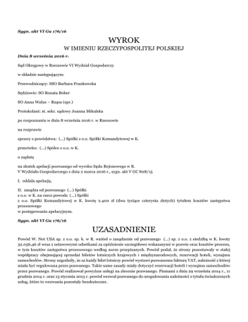 Sygn. akt VI Ga 176/16 WYROK W IMIENIU RZECZYPOSPOLITEJ POLSKIEJ Dnia 8 września 2016 r. Sąd Okręgowy w Rzeszowie VI Wydział Gospodarczy w składzie następującym: Przewodniczący: SSO Barbara Frankowska Sędziowie: SO Renata Bober SO Anna Walus – Rząsa (spr.) Protokolant: st. sekr. sądowy Joanna Mikulska po rozpoznaniu w dniu 8 września 2016 r. w Rzeszowie na rozprawie sprawy z powództwa: (...) Spółki z o.o. Spółki Komandytowej w K. przeciwko: (...) Spółce z o.o. w K. o zapłatę na skutek apelacji pozwanego od wyroku Sądu Rejonowego w R. V Wydziału Gospodarczego z dnia 2 marca 2016 r., sygn. akt V GC 808/15 I. oddala apelację, II. zasądza od pozwanego (...) Spółki z o.o. w K. na rzecz powoda (...) Spółki z o.o. Spółki Komandytowej w K. kwotę 2.400 zł (dwa tysiące czterysta złotych) tytułem kosztów zastępstwa procesowego w postępowaniu apelacyjnym. Sygn. akt VI Ga 176/16 UZASADNIENIE Powód W. Not USA sp. z o.o. sp. k. w R. wniósł o zasądzenie od pozwanego (...) sp. z o.o. z siedzibą w K. kwoty 32.056,46 zł wraz z ustawowymi odsetkami za opóźnienie szczegółowo wskazanymi w pozwie oraz kosztów procesu, w tym kosztów zastępstwa procesowego według norm przepisanych. Powód podał, że strony pozostawały w stałej współpracy obejmującej sprzedaż biletów lotniczych krajowych i międzynarodowych, rezerwacji hoteli, wynajmu samochodów. Strony uzgodniły, że za każdy bilet lotniczy powód wystawi pozwanemu fakturę VAT, należność z której miała być regulowana przez pozwanego. Takie same zasady miały dotyczyć rezerwacji hoteli i wynajmu samochodów przez pozwanego. Powód realizował powyższe usługi na zlecenie pozwanego. Pismami z dnia 29 września 2014 r., 11 grudnia 2014 r. oraz 13 stycznia 2015 r. powód wezwał pozwanego do uregulowania należności z tytułu świadczonych usług, które to wezwania pozostały bezskuteczne. W dniu 25 lutego 2015 r. Referendarz Sądowy w Sądzie Rejonowym w R. wydał nakaz zapłaty w postępowaniu upominawczym (sygn. akt V GNc 777/15). Sprzeciw od powyższego nakazu złożył pozwany (...) sp. z o.o. z siedzibą w K., zaskarżając nakaz zapłaty w całości i wnosząc o oddalenie powództwa oraz zasądzenie od powoda na rzecz pozwanego zwrotu kosztów procesu, w tym kosztów zastępstwa procesowego według norm przepisanych. Pozwany zarzucił, że z uwagi na charakter dokumentów dołączonych do pozwu (dokumentów księgowych) oraz wydruków komputerowych nie stanowią one dostatecznego dowodu na fakt zlecenia i wykonania usług na rzecz pozwanego. Dodatkowo złożone zamówienia nie zostały złożone przez osobę upoważnioną do działania w imieniu pozwanej spółki. W odpowiedzi na sprzeciw powód podtrzymał żądania i twierdzenia zawarte w pozwie, jak również ustosunkował się do zarzutów pozwanego podniesionych w sprzeciwie od nakazu zapłaty. Powód podkreślił, że przedstawione przez niego faktury VAT zostały poparte wydrukami elektronicznymi z systemów rezerwacyjnych dot. przewozów lotniczych i rezerwacji hotelowych. Sam fakt rezerwacji skutkował obowiązkiem zapłaty na rzecz przewoźnika lotniczego oraz hotelu, a tym samym spełnił on swoje świadczenie w zakresie zleconych usług. Powód podniósł, że pozwany nie zakwestionował samego faktu składania zamówień na określone usługi przez swoich pracowników, jak również faktu skorzystania z tych usług. Z ustaleń Sądu Rejonowego wynika, że powód (...) sp. z o.o. sp. k. z siedzibą w K. (działająca uprzednio pod firmą (...) USA sp. z o.o. sp. k. z siedzibą w R.) prowadzi działalność gospodarczą obejmującą w szczególności świadczenie usług pośrednictwa przy zawieraniu umów o przewóz osób w przewozach krajowych i międzynarodowych, o świadczenie usług hotelarskich, czy o wynajem samochodów. Powód pozostawał z pozwanym (...) sp. z o.o. z siedzibą w K. w stałych stosunkach handlowych i świadczył na jego zlecenie usługi obejmujące sprzedaż biletów lotniczych krajowych i międzynarodowych, rezerwację hoteli, wynajem samochodów. Współpraca stron polegała na tym, że pracownicy pozwanego składali bezpośrednio u powoda zamówienia drogą e-mailową lub telefonicznie - na określone usługi np. kupno biletów lotniczych, dokonanie rezerwacji w hotelu, zapewnienie rezerwacji pojazdu w określonym czasie i miejscu. Z ramienia strony pozwanej zamówień dokonywali pracownicy P. G. oraz A. C.. Powód dokonywał rezerwacji zgodnie z zamówieniem i przesyłał pozwanemu informację zwrotną, w której wskazywał również termin, do upływu którego pozwany miał prawo zrezygnować z zarezerwowanych usług. Brak odpowiedzi we wskazanym terminie oznaczał potwierdzenie zamówienia. Powód w związku z potwierdzonymi zamówieniami dokonywał płatności bezpośrednio na rzecz przewoźnika lotniczego, hoteli lub wynajmujących zarezerwowane samochody. Następnie wystawiano fakturę VAT na rzecz pozwanego, który był obowiązany uregulować ją w terminie wskazanym w fakturze w drodze przelewu bankowego. Faktury VAT zgodnie z praktyką stron były wysyłane listami zwykłymi. Sąd Rejonowy powołał w ustaleniach faktycznych szczegółowe faktury w odniesieniu do konkretnych zamówień na bilety lotnicze, wynajem samochodów i rezerwację hoteli, które zostały załączone do pozwu. Pismami z dnia 29 września 2014 r., 11 grudnia 2014 r. oraz 13 stycznia 2015 r. powód wzywał pozwanego do uregulowania kwoty 32.056,46 zł. Do każdego z powyższych pism dołączone było zestawienie zaległych płatności wskazujących na numer dokumentu (faktury VAT), daty jego wystawienia, terminu płatności oraz wysokości należności. Strona pozwana nie ustosunkowała się do powyższych wezwań, jak również nie uregulowała wierzytelności powoda. Sąd oparł powyższe ustalenia faktyczne na podstawie dowodów z dokumentów i wydruków komputerowych obejmujących zamówienia, bilety lotnicze, 
