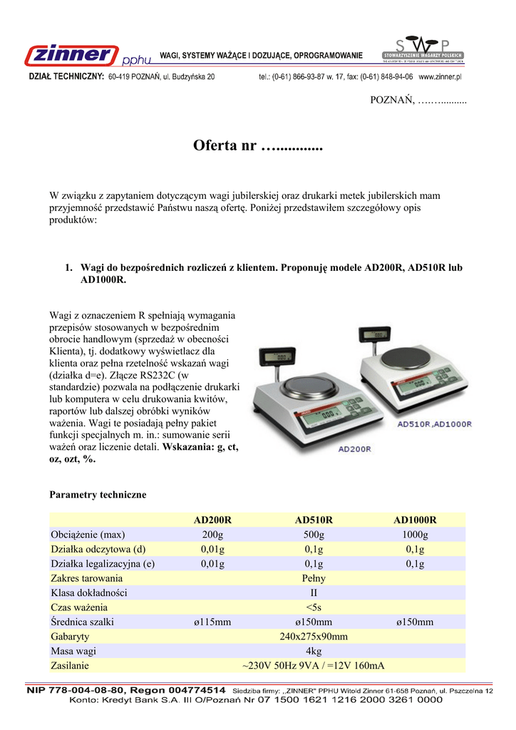 POZNAŃ, ….….......... Oferta nr …............ W związku z zapytaniem dotyczącym wagi jubilerskiej oraz drukarki metek jubilerskich mam przyjemność przedstawić Państwu naszą ofertę. Poniżej przedstawiłem szczegółowy opis produktów: 1. Wagi do bezpośrednich rozliczeń z klientem. Proponuję modele AD200R, AD510R lub AD1000R. Wagi z oznaczeniem R spełniają wymagania przepisów stosowanych w bezpośrednim obrocie handlowym (sprzedaż w obecności Klienta), tj. dodatkowy wyświetlacz dla klienta oraz pełna rzetelność wskazań wagi (działka d=e). Złącze RS232C (w standardzie) pozwala na podłączenie drukarki lub komputera w celu drukowania kwitów, raportów lub dalszej obróbki wyników ważenia. Wagi te posiadają pełny pakiet funkcji specjalnych m. in.: sumowanie serii ważeń oraz liczenie detali. Wskazania: g, ct, oz, ozt, %. Parametry techniczne Obciążenie (max) Działka odczytowa (d) Działka legalizacyjna (e) Zakres tarowania Klasa dokładności Czas ważenia Średnica szalki Gabaryty Masa wagi Zasilanie AD200R 200g 0,01g 0,01g ø115mm AD510R AD1000R 500g 1000g 0,1g 0,1g 0,1g 0,1g Pełny II <5s ø150mm ø150mm 240x275x90mm 4kg ~230V 50Hz 9VA / =12V 160mA 2. Wagi jubilerskie do handlu. Proponuję modele AD200, AD510 lub AD1000. Wagi serii AD legalizowane, ale bez oznaczenia R, mogą być stosowane do wyznaczania masy wyrobów jubilerskich (metkowania) i innych pomiarów dokonywanych na zapleczach zakładów jubilerskich. Złącze RS232C (w standardzie) pozwala na podłączenie drukarki lub komputera w celu drukowania kwitów, raportów lub dalszej obróbki wyników ważenia. Wagi te posiadają pełny pakiet funkcji specjalnych m. in.: liczenie detali, możliwość generowania prostych etykiet oraz autozerowanie. Wskazania: g, ct, oz, ozt, %. Parametry techniczne Obciążenie (max) Działka odczytowa (d) Działka legalizacyjna (e) Zakres tarowania Klasa dokładności Czas ważenia Średnica szalki Gabaryty Masa wagi Zasilanie AD200 200g 0,001g 0,01g ø115mm AD510 500g 0,01g 0,1g Pełny II <5s ø150mm 240x275x90mm 4kg ~230V 50Hz 9VA / =12V 160mA AD1000 1000g 0,01g 0,1g ø150mm 3. Wagi jubilerskie technologiczne. Proponuję modele AD250, AD2.5. Jako wagi technologiczne mogą być używane nielegalizowane wagi serii AD. Złącze RS232C (w standardzie) pozwala na podłączenie drukarki lub komputera w celu drukowania kwitów, raportów lub dalszej obróbki wyników ważenia. Wagi te posiadają pełny pakiet funkcji specjalnych m.in. sporządzanie receptur, tworzenie prostych etykiet, sumowanie serii ważen, liczenie detali. Wskazania: g, ct, oz, ozt, %. Parametry techniczne Obciążenie (max) Działka odczytowa (d) Działka legalizacyjna (e) Zakres tarowania Klasa dokładności Czas ważenia Średnica szalki Gabaryty Masa wagi Zasilanie AD250 250g 0,01g 0,1g AD2.5 2,5kg 0,1g 0,5g Pełny II <5s ø115mm ø150mm 240x275x90mm 4kg ~230V 50Hz 9VA / =12V 160mA 4. Waga jubilerska kieszonkowa. Proponuję model 9201 szwajcarskiej firmy Soehnle. Kompaktowa nielegalizowana waga 9201 Soehnle Professional została zaprojektowana do ważenia drobnych przedmiotów. Waga ta jest przewidziana do tych zastosowań w obrębie Wspólnoty Europejskiej, które nie podlegają obowiązkowi legalizacji. Odpowiada ona wzorowi konstrukcyjnemu opisanemu w dokumencie dotyczącym dopuszczenia tej konstrukcji oraz obowiązującym wymaganiom dyrektyw Unii Europejskiej. Waga sprawdza się m. in. w: • lombardach • sklepach jubilerskich Parametry techniczne Obciążenie (max) Działka odczytowa (d) Jednostki Wyświetlacz Funkcje 500 g 1g g/oz/dwt/ozt LCD autowyłączanie, kalibracja Zasilanie LI CR 2430 (3V) Obudowa Kolor Wymiary wagi Wymiary szalki plastikowa czarny 120 x 150 mm 58 x 58 mm Proponuję drukarkę Dymo Jubilerska Profesjonalna termiczna drukarka etykiet współpracująca z komputerami PC oraz Mac. Drukarka Dymo oferuje wszystkie funkcje, które powinna mieć drukarka etykiet, w bardzo konkurencyjnej cenie. Główne korzyści : • • • • • • • • • • • • Drukowanie kodów kreskowych Wysokiej jakości wydruk etykiet o rozdzielczości 600×300 (DPI) Etykiety o szerokości do 60 mm Drukowanie z szybkością do 51 etykiet na minutę (przy drukowaniu etykiet adresowych z 4 liniami) Automatyczne cofanie pierwszej etykiety Funkcja zwalniania etykiety, upraszczająca wyjmowanie etykiet Port USB 2.0 Zgodność z komputerami PC i Mac 2 lata gwarancji producenta Obsługuje 19 rozmiarów etykiet Dymo Program do projektowania etykiet 10 etykiet 10x50mm jubilerskich polipro gratis! CENY: • • • • • • • • • • • • • • Waga AD200R: Waga AD510R: Waga AD1000R: Waga AD200: Waga AD510: Waga AD1000: Waga AD250: Waga AD2.5: Waga 9201: Legalizacja (dotyczy wag Axis, ważna do końca 2014 r.): Drukarka Dymo Jubilerska: Metki jubilerskie (10 x 50mm): Metki jubilerskie (10 x 50mm): Transport UPS: 1 880 zł;-/szt. 1 380 zł;-/szt. 1 780 zł;-/szt. 1 800 zł;-/szt. 1 300 zł;-/szt. 1 400 zł;-/szt. 1 280 zł;-/szt. 1 280 zł;-/szt. 80 zł;-/szt. 40 zł;-/szt. 433 zł;-/szt. 60 zł;-/500szt. 178 zł;-/1500szt. 15 zł;-/szt. Pozostałe warunki: • • • Do powyższych cen należy doliczyć 23% VAT Termin realizacji: 7 dni Ważność oferty: 90 dni Z poważaniem, Jakub Frątczak Doradca Techniczno-Handlowy 609 219 303 Zinner PPHU [email protected]