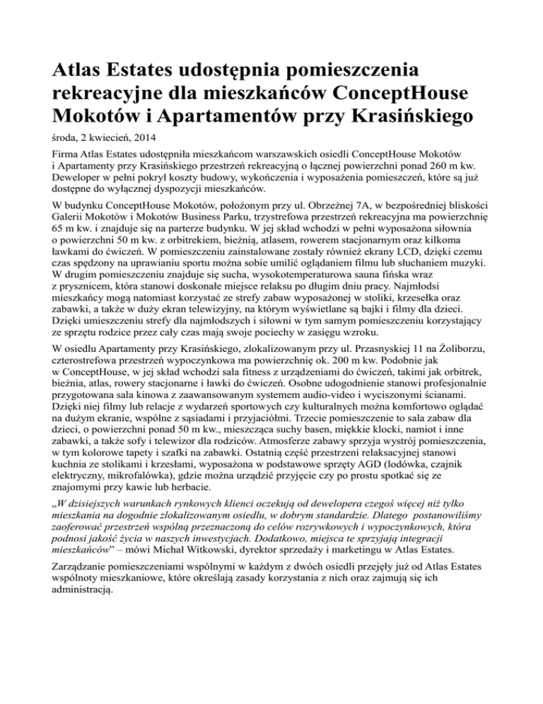 Atlas Estates udostępnia pomieszczenia rekreacyjne dla mieszkańców ConceptHouse Mokotów i Apartamentów przy Krasińskiego środa, 2 kwiecień, 2014 Firma Atlas Estates udostępniła mieszkańcom warszawskich osiedli ConceptHouse Mokotów i Apartamenty przy Krasińskiego przestrzeń rekreacyjną o łącznej powierzchni ponad 260 m kw. Deweloper w pełni pokrył koszty budowy, wykończenia i wyposażenia pomieszczeń, które są już dostępne do wyłącznej dyspozycji mieszkańców. W budynku ConceptHouse Mokotów, położonym przy ul. Obrzeżnej 7A, w bezpośredniej bliskości Galerii Mokotów i Mokotów Business Parku, trzystrefowa przestrzeń rekreacyjna ma powierzchnię 65 m kw. i znajduje się na parterze budynku. W jej skład wchodzi w pełni wyposażona siłownia o powierzchni 50 m kw. z orbitrekiem, bieżnią, atlasem, rowerem stacjonarnym oraz kilkoma ławkami do ćwiczeń. W pomieszczeniu zainstalowane zostały również ekrany LCD, dzięki czemu czas spędzony na uprawianiu sportu można sobie umilić oglądaniem filmu lub słuchaniem muzyki. W drugim pomieszczeniu znajduje się sucha, wysokotemperaturowa sauna fińska wraz z prysznicem, która stanowi doskonałe miejsce relaksu po długim dniu pracy. Najmłodsi mieszkańcy mogą natomiast korzystać ze strefy zabaw wyposażonej w stoliki, krzesełka oraz zabawki, a także w duży ekran telewizyjny, na którym wyświetlane są bajki i filmy dla dzieci. Dzięki umieszczeniu strefy dla najmłodszych i siłowni w tym samym pomieszczeniu korzystający ze sprzętu rodzice przez cały czas mają swoje pociechy w zasięgu wzroku. W osiedlu Apartamenty przy Krasińskiego, zlokalizowanym przy ul. Przasnyskiej 11 na Żoliborzu, czterostrefowa przestrzeń wypoczynkowa ma powierzchnię ok. 200 m kw. Podobnie jak w ConceptHouse, w jej skład wchodzi sala fitness z urządzeniami do ćwiczeń, takimi jak orbitrek, bieżnia, atlas, rowery stacjonarne i ławki do ćwiczeń. Osobne udogodnienie stanowi profesjonalnie przygotowana sala kinowa z zaawansowanym systemem audio-video i wyciszonymi ścianami. Dzięki niej filmy lub relacje z wydarzeń sportowych czy kulturalnych można komfortowo oglądać na dużym ekranie, wspólne z sąsiadami i przyjaciółmi. Trzecie pomieszczenie to sala zabaw dla dzieci, o powierzchni ponad 50 m kw., mieszcząca suchy basen, miękkie klocki, namiot i inne zabawki, a także sofy i telewizor dla rodziców. Atmosferze zabawy sprzyja wystrój pomieszczenia, w tym kolorowe tapety i szafki na zabawki. Ostatnią część przestrzeni relaksacyjnej stanowi kuchnia ze stolikami i krzesłami, wyposażona w podstawowe sprzęty AGD (lodówka, czajnik elektryczny, mikrofalówka), gdzie można urządzić przyjęcie czy po prostu spotkać się ze znajomymi przy kawie lub herbacie. „W dzisiejszych warunkach rynkowych klienci oczekują od dewelopera czegoś więcej niż tylko mieszkania na dogodnie zlokalizowanym osiedlu, w dobrym standardzie. Dlatego postanowiliśmy zaoferować przestrzeń wspólną przeznaczoną do celów rozrywkowych i wypoczynkowych, która podnosi jakość życia w naszych inwestycjach. Dodatkowo, miejsca te sprzyjają integracji mieszkańców” – mówi Michał Witkowski, dyrektor sprzedaży i marketingu w Atlas Estates. Zarządzanie pomieszczeniami wspólnymi w każdym z dwóch osiedli przejęły już od Atlas Estates wspólnoty mieszkaniowe, które określają zasady korzystania z nich oraz zajmują się ich administracją.