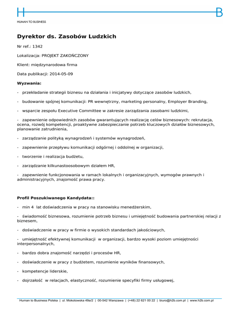 Dyrektor ds. Zasobów Ludzkich Nr ref.: 1342 Lokalizacja: PROJEKT ZAKOŃCZONY Klient: międzynarodowa firma Data publikacji: 2014-05-09 Wyzwania: - przekładanie strategii biznesu na działania i inicjatywy dotyczące zasobów ludzkich, - budowanie spójnej komunikacji: PR wewnętrzny, marketing personalny, Employer Branding, - wsparcie zespołu Executive Committee w zakresie zarządzania zasobami ludzkimi, - zapewnienie odpowiednich zasobów gwarantujących realizację celów biznesowych: rekrutacja, ocena, rozwój kompetencji, proaktywne zabezpieczanie potrzeb kluczowych działów biznesowych, planowanie zatrudnienia, - zarządzanie polityką wynagrodzeń i systemów wynagrodzeń, - zapewnienie przepływu komunikacji odgórnej i oddolnej w organizacji, - tworzenie i realizacja budżetu, - zarządzanie kilkunastoosobowym działem HR, - zapewnienie funkcjonowania w ramach lokalnych i organizacyjnych, wymogów prawnych i administracyjnych, znajomość prawa pracy. Profil Poszukiwanego Kandydata:: - min 4 lat doświadczenia w pracy na stanowisku menedżerskim, - świadomość biznesowa, rozumienie potrzeb biznesu i umiejętność budowania partnerskiej relacji z biznesem, - doświadczenie w pracy w firmie o wysokich standardach jakościowych, - umiejętność efektywnej komunikacji w organizacji, bardzo wysoki poziom umiejętności interpersonalnych, - bardzo dobra znajomość narzędzi i procesów HR, - doświadczenie w pracy z budżetem, rozumienie wyników finansowych, - kompetencje liderskie, - dojrzałość w relacjach, elastyczność, rozumienie specyfiki firmy usługowej, Human to Business Polska | ul. Mokotowska 49a/2 | 00-542 Warszawa | (+48) 22 621 00 22 | [email protected] | www.h2b.com.pl - bardzo dobra organizacja pracy, zorientowanie na cel, - energia, szybkie działanie, proaktywność, - bardzo dobra znajomość języka angielskiego pozwalająca na skuteczną, komunikację w międzynarodowym środowisku zarówno w mowie jak i w piśmie, - wykształcenie wyższe (zarządzanie, prawo, ekonomia, kierunki społeczne). Atuty oferty: - praca w firmie o wysokich standardach, - międzynarodowa organizacja, - samodzielność w działaniu, - bardzo dobra atmosfera, - kultura pracy zorientowana na połączenie wyniku i respektowania jakości. W sprawie projektu zapraszam do kontaktu: [email protected] Prosimy o dopisanie następującej klauzuli: "Wyrażam zgodę na przetwarzanie moich danych osobowych zawartych w ofercie pracy dla potrzeb procesu rekrutacji zgodnie z ustawą z dnia 27.08.1997r. Dz. U. z 2002 r., Nr 101, poz. 923 ze zm." Jeżeli okaże się, że nie jest to wyzwanie, które Państwa interesuje, prosimy o przekazanie zaproszenia do projektu osobom, które mogłyby być zainteresowane. Human to Business Polska | ul. Mokotowska 49a/2 | 00-542 Warszawa | (+48) 22 621 00 22 | [email protected] | www.h2b.com.pl Powered by TCPDF (www.tcpdf.org)