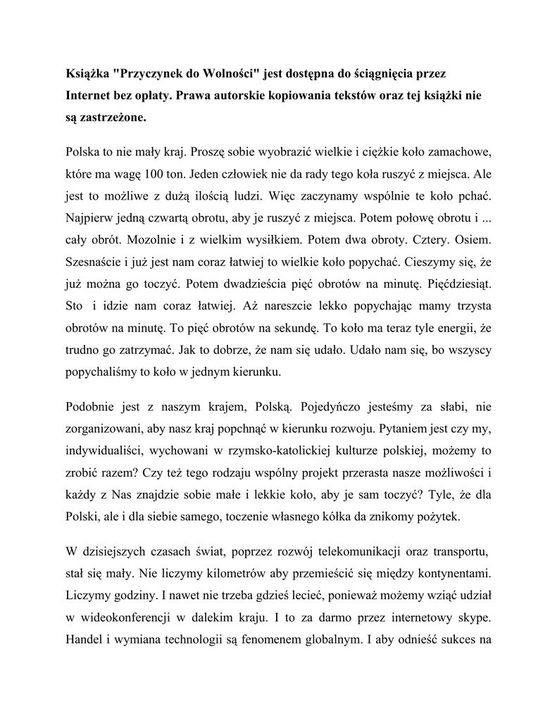 Książka "Przyczynek do Wolności" jest dostępna do ściągnięcia przez Internet bez opłaty. Prawa autorskie kopiowania tekstów oraz tej książki nie są zastrzeżone. Polska to nie mały kraj. Proszę sobie wyobrazić wielkie i ciężkie koło zamachowe, które ma wagę 100 ton. Jeden człowiek nie da rady tego koła ruszyć z miejsca. Ale jest to możliwe z dużą ilością ludzi. Więc zaczynamy wspólnie te koło pchać. Najpierw jedną czwartą obrotu, aby je ruszyć z miejsca. Potem połowę obrotu i ... cały obrót. Mozolnie i z wielkim wysiłkiem. Potem dwa obroty. Cztery. Osiem. Szesnaście i już jest nam coraz łatwiej to wielkie koło popychać. Cieszymy się, że już można go toczyć. Potem dwadzieścia pięć obrotów na minutę. Pięćdziesiąt. Sto i idzie nam coraz łatwiej. Aż nareszcie lekko popychając mamy trzysta obrotów na minutę. To pięć obrotów na sekundę. To koło ma teraz tyle energii, że trudno go zatrzymać. Jak to dobrze, że nam się udało. Udało nam się, bo wszyscy popychaliśmy to koło w jednym kierunku. Podobnie jest z naszym krajem, Polską. Pojedyńczo jesteśmy za słabi, nie zorganizowani, aby nasz kraj popchnąć w kierunku rozwoju. Pytaniem jest czy my, indywidualiści, wychowani w rzymsko-katolickiej kulturze polskiej, możemy to zrobić razem? Czy też tego rodzaju wspólny projekt przerasta nasze możliwości i każdy z Nas znajdzie sobie małe i lekkie koło, aby je sam toczyć? Tyle, że dla Polski, ale i dla siebie samego, toczenie własnego kółka da znikomy pożytek. W dzisiejszych czasach świat, poprzez rozwój telekomunikacji oraz transportu, stał się mały. Nie liczymy kilometrów aby przemieścić się między kontynentami. Liczymy godziny. I nawet nie trzeba gdzieś lecieć, ponieważ możemy wziąć udział w wideokonferencji w dalekim kraju. I to za darmo przez internetowy skype. Handel i wymiana technologii są fenomenem globalnym. I aby odnieść sukces na arenie światowej w pojedynkę jest to niemożliwe. Jeden człowiek jest na to za mały. Za słaby. W dzisiejszych czasach konkuruje się o miejsca pracy, byt i dobrobyt, tylko w dużych zorganizowanych grupach. My, wszyscy Polacy w kraju i ci, rozsiani po świecie, jesteśmy kulturowo jednym narodem. Jest nas na świecie 60 milionów. Obecne zagrożenia ekonomiczne Polski, zmuszają nas do wspólnego działania. Dlatego trzeba ruszyć nasze koło zamachowe gospodarki z miejsca i zacząć go coraz szybciej toczyć. Kiedy patrzę się dzisiaj na filmy obrazujące Marsze Niepodległości w dniu 11 listopada, widzę las polskich flag niesiony przez Polaków. Ale też widzę przed nimi to wielkie koło zamachowe, jakim jest nasza Polska. Wielkie koło zamachowe, które stoi w miejscu. Jestem pewien, że każdy z nas chce pomóc, aby to koło zacząć szybko potoczyć w kierunku rozwoju. W kierunku zwycięstwa nad biedą i poniżeniem. Niewątpliwie moi adwersarze zaraz krzykną, że to co powyżej powiedziałem to jest nacjonalizm. Ale nie zapominajmy, że w czasie wielkiej światowej depresji ekonomicznej w latach 30-tych XX wieku, w czasie Wielkiego Kryzysu Gospodarczego, kiedy świat kapitalistyczny był bezrobotny i głodny, a Rosja była pijana krwią bolszewickiej rewolucji, największe sukcesy miały kraje, które się zmobilizowały aby pchać swoje koła zamachowe w kierunku interwencyjnej gospodarki nacjonalistycznej - od New Dealu prezydenta Franklina Roosevelta w Stanach Zjednoczonych, po Czteroletni Plan Inwestycyjny wicepremiera Eugeniusza Kwiatkowskiego w Polsce. Bo tylko taka nacjonalistycznie ukierunkowana gospodarka daje możliwość rozwoju w czasie światowego kryzysu. Przez ostatnie ćwierć wieku po zmianie ustroju Polacy odczuli na własnej skórze wypaczenia rozbestwionego neokolonialnego kapitalizmu, a przez poprzednie pół wieku gnębił nas dyktatorski komunizm. Ile czasu można się uczyć na własnych błędach i cierpieć z tego powodu. Najwyższy czas, aby określić się jako naród z własnym planem akcji, który nie tylko pomoże nam przetrwać światowe zawieruchy, ale da nam możliwości pracy i zysku dla siebie, dla Polski i dla przyszłych pokoleń. Kiedy w 1990 roku nieoczekiwanie przez 10 dni zebrałem 140 tysięcy podpisów na poparcie mojej kandydatury na prezydenta RP, moje plany rozwoju gospodarczego dla Polski były poniżająco ośmieszane. Moi adwersarze głosili, że jedyny słuszny plan miał tylko Leszek Balcerowicz. Wiele lat później z socjopatyczną szczerością sam przyznał się do błędu. Przyznał, że w swojej szokowej reformie nie uwzględnił ludzkich możliwości. Czyli, że nie uwzględnił najważniejszego i decydującego czynnika wszelkiego rozwoju gospodarczego. A tym samym okrutnie stłamsił żywotność naszego narodu. W 1992 roku dopracowałem wraz z doc. Józefem Kosseckim "Plan rozwoju dla Polski". Został on opublikowany w przez Partię "X" jako "Plan X" i jest on do dzisiaj niezmiennie aktualny. Niniejsza książka stanowi jego rozszerzenie i uaktualnienie. Jest jeszcze jedną cegiełką budowania fundamentu Polski. Przyczynkiem do wolności dla mego ukochanego kraju. W wyborach prezydenckich w 1990 roku głosowało na mnie prawie 4 miliony Polaków w każdej turze wyborów. Ta książka jest dla ludzi, którzy mi wtedy zaufali swoim głosem wyborczym. Ale jest przede wszystkim dla ich synów i córek, aby skorzystali z moich doświadczeń walki o polskość. Ich rodzice za to, że na mnie wtedy głosowali, byli ośmieszani, a nawet prześladowani. Byli obelżywie nazywani "homo sovieticus" przez antypolskie środowisko "Gazety Wyborczej" i "Tygodnika Powszechnego". Dlatego przytoczę w tym miejscu naukową charakterystykę socjologiczną tych Polaków, którzy na mnie wtedy głosowali, po to aby Wy, ich dzieci mogły być z nich dumne: "Ludzi Tymińskiego najtrudniej (było) skrótowo określić. Można jednak powiedzieć, że jego zwolennicy nieco bardziej sceptycznie niż wybieraj