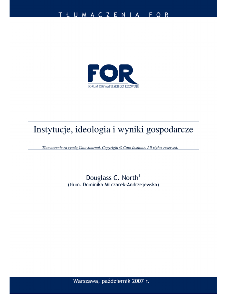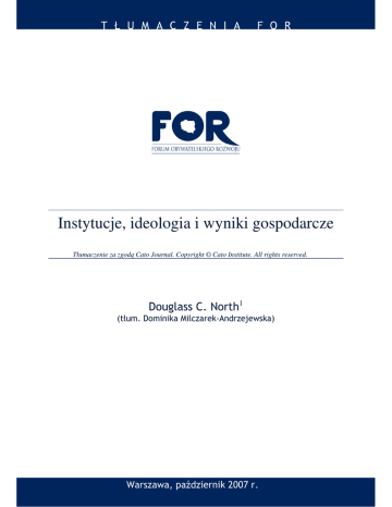 Instytucje, ideologia i wyniki gospodarcze Tłumaczenie za zgodą Cato Journal. Copyright © Cato Institute. All rights reserved. Douglass C. North1 (tłum. Dominika Milczarek-Andrzejewska) Warszawa, październik 2007 r. Główna teza tego tekstu brzmi następująco: instytucje wspólnie z ideologią kształtują wyniki gospodarcze. Instytucje wpływają na sytuację gospodarczą determinując (wraz z wykorzystywaną technologią) koszty transakcji i produkcji. Instytucje składają się z zasad formalnych, nieformalnych ograniczeń i cech pozwalających na egzekwowanie tych ograniczeń. Podczas gdy zasady formalne mogą być zmienione przez administrację państwową w ciągu jednej nocy, ograniczenia nieformalne zmieniają się bardzo powoli. Zarówno zasady formalne jak i ograniczenia nieformalne są ostatecznie kształtowane przez subiektywne postrzeganie otaczającego świata przez ludzi. Z kolei percepcja świata determinuje bezpośrednie wybory pomiędzy zasadami formalnymi a ewoluującymi ograniczeniami nieformalnymi. W dalszych częściach tekstu przedstawię ramy analityczne wykorzystywane przeze mnie do zdiagnozowania odmiennych wyników gospodarczych zachodnich gospodarek rynkowych, krajów Trzeciego Świata i gospodarek socjalistycznych. INSTYTUCJE I KOSZTY TRANSAKCYJNE Instytucje są to zasady gry w społeczeństwie, a bardziej formalnie, to stworzone przez ludzi ograniczenia, które kształtują ludzkie interakcje. Tworzą więc one strukturę bodźców w procesie wymiany czy to politycznym, społecznym czy gospodarczym. Zmiana instytucjonalna kształtuje sposób w jaki społeczeństwa ewoluują na przestrzeni czasu, i w związku z tym, jest kluczem do zrozumienia zmiany historycznej. Fakt, że instytucje wpływają na wyniki gospodarcze nie budzi raczej kontrowersji. Nie jest także kontrowersyjne stwierdzenie, że zróżnicowane wyniki gospodarcze krajów na przestrzeni lat wynikają przede wszystkim ze sposobu w jaki ewoluują instytucje. Jednak zachodnia, neoklasyczna teoria ekonomiczna jest wciąż pozbawiona instytucji, a przez to jest w niewielkim stopniu przydatna do analizowania podstawowych źródeł rozwoju gospodarczego. 1 North. D.C., Institutions, Ideology and Economic Performance, “Cato Journal”, vol. 11, nr 3 (Winter 1992). Tekst pochodzi częściowo z pracy Northa (1990b). 2 Nie będzie wielką przesadą stwierdzenie, że podczas gdy teoria neoklasyczna koncentruje się na działaniu efektywnych rynków, niewielu zachodnich ekonomistów rozumie jakie wymogi instytucjonalne są niezbędne do stworzenia takich rynków. Traktują je po prostu jako dane. A efektywne rynki czynników produkcji i produktów finalnych, na których opiera się wzrost gospodarczy, wymagają zestawu instytucji politycznych i ekonomicznych odpowiedzialnych za niskie koszty transakcyjne oraz wiarygodne zobowiązania. Koszty transakcyjne w procesie wymiany są determinowane przez cztery główne zmienne. Pierwsza z nich to koszt pomiaru wartościowych cech towarów i usług lub działalności ludzi podczas procesu wymiany. Prawa własności składają się z wiązki uprawnień. I jeśli nie jesteśmy w stanie precyzyjnie zmierzyć wartościowych cech poszczególnych uprawnień, wówczas koszty transakcyjne i niepewność związana z transakcją dramatycznie rosną. Pomiar obejmuje zdefiniowanie wymiarów fizycznych uprawnień będących przedmiotem wymiany (koloru, wielkości, wagi, liczby, itd.) oraz wymiarów praw własności (uprawnień definiujących użycie, uzyskiwany dochód i przeniesienie własności). W świecie, w którym koszty pomiaru równałyby się zeru, społeczeństwa nie musiałyby przeznaczać ogromnych zasobów na organizacje i egzekwowanie umów. Ale ponieważ koszty te są niezwykle wysokie, a w konsekwencji tego, prawa nie są doskonale określone, inne zmienne odgrywają ważną rolę w kosztach procesu wymiany. Drugą zmienną związaną z kosztami transakcji jest wielkość rynku, która określa czy przeprowadzana wymiana ma charakter interpersonalny czy bezosobowy. Podczas wymiany interpersonalnej to więzy rodzinne, przyjaźń, osobista lojalność i powtarzające się kontakty handlowe ograniczają zachowanie uczestników oraz zmniejszają potrzebę kosztownej specyfikacji i egzekwowania zobowiązań. W przeciwnym przypadku - podczas wymiany bezosobowej - nic nie powstrzymuje przed wykorzystaniem drugiej strony. W konsekwencji, koszt umowy rośnie wraz z potrzebą opracowania bardziej szczegółowego opisu wymienianych praw. Gdy strony transakcji angażują się w powtarzające się kontakty handlowe na bezosobowych rynkach, rolę podstawowego ograniczenia pełni wówczas efektywna konkurencja. 3 Trzecią zmienną jest egzekwowanie umów. W sytuacji idealnej - w świecie doskonałego egzekwowania umów - osoby trzecie mogłyby bezstronnie (i bez kosztów) rozstrzygać spory i wyznaczać odszkodowanie dla pokrzywdzonej strony w przypadku naruszenia warunków umowy. Oportunizm, unikanie obowiązków i oszukiwanie nigdy nie opłacałby się w takim świecie. Ale taki świat nie istnieje. W rzeczywistości stworzenie względnie bezstronnego systemu sądowniczego egzekwującego warunki umów stanowiło krytyczną trudność na ścieżce rozwoju gospodarczego. Ewolucja sądów, systemu prawnego i relatywnie niezależnych organów prawnej egzekucji odegrała główną rolę w rozwoju skomplikowanego systemu umów w świecie zachodnim. Umowy te, posiadające zdolność rozwijania się w czasie i przestrzeni, są kluczowym wymogiem świata specjalizacji. Jeśli utrzymamy neoklasyczne behawioralne założenie o maksymalizacji bogactwa, jedynie te trzy zmienne będą determinować koszty wymiany. Wówczas, jednostki maksymalizować będą bogactwo w każdej sytuacji (jeśli oszukiwanie opłaca się, jednostka będzie oszukiwać, jeśli próżnowanie w pracy jest możliwe, jednostka będzie próżnować, a jeśli jednostka może bezkarnie zniszczyć konkurenta, z