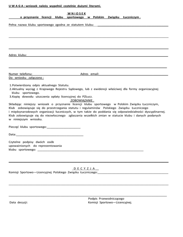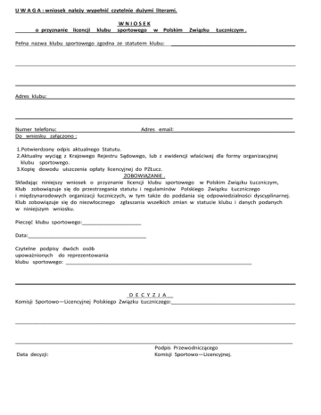 U W A G A : wniosek należy wypełnić czytelnie dużymi literami. o przyznanie licencji klubu WNIOSEK sportowego w Polskim Pełna nazwa klubu sportowego zgodna ze statutem klubu: Związku Łuczniczym . __________________________________________ _______________________________________________________________________________________________ _______________________________________________________________________________________________ Adres klubu:____________________________________________________________________________________ ______________________________________________________________________________________________ Numer telefonu: Do wniosku załączono : Adres email:_________________________________________ 1.Potwierdzony odpis aktualnego Statutu. 2.Aktualny wyciąg z Krajowego Rejestru Sądowego, lub z ewidencji właściwej dla formy organizacyjnej klubu sportowego. 3.Kopię dowodu uiszczenia opłaty licencyjnej do PZŁucz. ZOBOWIĄZANIE . Składając niniejszy wniosek o przyznanie licencji klubu sportowego w Polskim Związku Łuczniczym, Klub zobowiązuje się do przestrzegania statutu i regulaminów Polskiego Związku Łuczniczego i międzynarodowych organizacji łuczniczych, w tym także do poddania się odpowiedzialności dyscyplinarnej. Klub zobowiązuje się do niezwłocznego zgłaszania wszelkich zmian w statucie klubu i danych podanych w niniejszym wniosku. Pieczęć klubu sportowego:____________________ Data:________________________________________ Czytelne podpisy dwóch osób upoważnionych do reprezentowania klubu sportowego: _______________________________________________________________ _______________________________________________________________________________________________ D E C Y Z J A __ Komisji Sportowo—Licencyjnej Polskiego Związku Łuczniczego:__________________________________________ _______________________________________________________________________________________________ ______________________________________________________________________________________________ Podpis Przewodniczącego Data decyzji: Komisji Sportowo—Licencyjnej. U W A G A : wniosek należy wypełnić czytelnie dużymi literami . W N I O S E K_ o przedłużenie ważności licencji klubu sportowego w Polskim Związku Łuczniczym _______ n a r o k : ____________________ Numer licencji klubu sportowego w Polskim Związku Łuczniczym: _____________ Pełna nazwa klubu sportowego zgodna ze statutem klubu:___________________________________________ _______________________________________________________________________________________________ _______________________________________________________________________________________________ Adres klubu:____________________________________________________________________________________ _______________________________________________________________________________________________ Numer telefonu:____________________________Adres email:__________________________________________ Do wniosku załączono: kopię dowodu uiszczenia opłaty licencyjnej do PZŁucz. Klub składając wniosek o przedłużenie ważności licencji klubu sportowego w Polskim Związku Łuczniczym zobowiązuje się do przestrzegania statutu i regulaminów Polskiego Związku Łuczniczego , oraz międzynarodowych organizacji łuczniczych, w tym także do poddania się odpowiedzialności dyscyplinarnej. Klub zobowiązuje się do niezwłocznego zgłaszania wszelkich zmian w statucie klubu i danych podanych w niniejszym wniosku. Pieczęć klubu sportowego:____________________ Data: _____________________________________ Czytelny podpis osoby upoważnionej do reprezentowania klubu sportowego:_______________________________________________________________ _______________________________________________________________________________________________ D E C Y Z J A__ Komisji Sportowo—Licencyjnej Polskiego Związku Łuczniczego :_________________________________________ _______________________________________________________________________________________________ ______________________________________________________________________________________________ ______________________________________________________________________________________________ Data decyzji: Podpis Przewodniczącego Komisji Sportowo—Licencyjnej. U W A G A: wniosek należy wypełnić czytelnie dużymi literami . o przyznanie licencji W N I O S E K_ zawodnika w Polskim Związku Łuczniczym .____________ Nazwisko i imię :________________________________________________________________________________ Pełna data urodzenia:_________________________________ Numer P E S E L:_____________________________ Adres zamieszkania:_______________________________________________________________________________ Numer telefonu: ___________________________________________ Do wniosku załączono: 1 fotografię / na odwrocie należy podać nazwisko i imię wnioskodawcy /. Kopię dowodu uiszczenia opłaty licencyjnej do PZŁucz. Zobowiązuję się do przestrzegania statutu i regulaminów Polskiego Związku Łuczniczego, oraz międzynarodowych organizacji łuczniczych, w tym także do poddania się odpowiedzialności dyscyplinarnej. Wyrażam zgodę na przetwarzanie moich danych osobowych dla potrzeb mojego udziału we współzawodnictwie sportowym. Data:_______________________ Własnoręczny , czytelny podpis wnioskodawcy: __________________________________________________ _______________________________________________________________________________________________ Z G O D A : przedstawiciela ustawowego, opiekuna prawnego lub opiekuna faktycznego w przypadku, gdy osoba wnioskodawcy jest jeszcze niepełnoletnia , to jest nie ukończyła jeszcze 1 8 roku życia. Ja niżej podpisany / na : _______________________________________________________________________ wyrażam zgodę na uprawianie łucznictwa przez: ____________________________________________________________________________________ Data: ________________________
