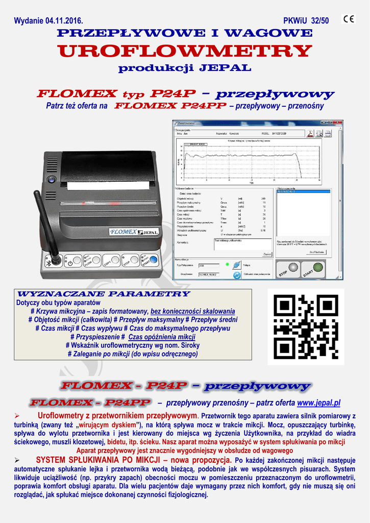 Wydanie 04.11.2016. PKWiU 32/50 PRZEPŁYWOWE I WAGOWE UROFLOWMETRY produkcji JEPAL FLOMEX typ P24P – przepływowy Patrz też oferta na FLOMEX P24PP – przepływowy – przenośny WYZNACZANE PARAMETRY Dotyczy obu typów aparatów # Krzywa mikcyjna – zapis formatowany, bez konieczności skalowania # Objętość mikcji (całkowita) # Przepływ maksymalny # Przepływ średni # Czas mikcji # Czas wypływu # Czas do maksymalnego przepływu # Przyspieszenie # Czas opóźnienia mikcji # Wskaźnik uroflowmetryczny wg nom. Siroky # Zaleganie po mikcji (do wpisu odręcznego) FLOMEX - P24P – przepływowy FLOMEX - P24PP – przepływowy przenośny – patrz oferta www.jepal.pl Uroflowmetry z przetwornikiem przepływowym. Przetwornik tego aparatu zawiera silnik pomiarowy z turbinką (zwany też „wirującym dyskiem”), na którą spływa mocz w trakcie mikcji. Mocz, opuszczający turbinkę, spływa do wylotu przetwornika i jest kierowany do miejsca wg życzenia Użytkownika, na przykład do wiadra ściekowego, muszli klozetowej, bidetu, itp. ścieku. Nasz aparat można wyposażyć w system spłukiwania po mikcji Aparat przepływowy jest znacznie wygodniejszy w obsłudze od wagowego SYSTEM SPŁUKIWANIA PO MIKCJI – nowa propozycja. Po każdej zakończonej mikcji następuje automatyczne spłukanie lejka i przetwornika wodą bieżącą, podobnie jak we współczesnych pisuarach. System likwiduje uciążliwość (np. przykry zapach) obecności moczu w pomieszczeniu przeznaczonym do uroflowmetrii, poprawia komfort obsługi aparatu. Dla wielu pacjentów daje wymagany przez nich komfort, gdy nie muszą się oni rozglądać, jak spłukać miejsce dokonanej czynności fizjologicznej. CECHY APARATU # Zwłaszcza do rutynowej uroflowmetrii # produkcja od 1995 r. # „wyrób polski” Przetwornik pom. przepływowy turbinkowy typu „wirujący dysk” – Qmax 50 ml/sek , dokł. 3% Przetwornik pomiarowy odporny na artefakty Drukarka własna lub bez drukarki - drukarka prod. pol/jap , papier szer. 112 mm Możliwość współpracy z komputerem - poprzez program współpracy Obsługa z klawiatury aparatu i/lub z komputera Połączenie zespołu sterującego z przetwornikiem pomiarowym – przewód - długośc do 30 m Łącza zespołu sterującego z komputerem : USB , Bluetooth Możliwosć sprawdzenia i ew. wykonania kalibracji - we własnym zakresie Bardzo obszerne wyposażenie - do różnych aplikacji Odprowadzenie moczu: wiadro ściekowe, muszla klozetowa, bidet, kanalizacja zdjęcia Krzesła, taborety mikcyjne zdjęcia ; wykonanie – stal nierdz. System automatycznego spłukiwania po mikcji opis systemu , opcja PREZENTACJA BADANIA Wydruk krzywej mikcyjnej i jej parametrów - na drukarce aparatu i/lub komputera Autoformatowanie krzywej mikcyjnej – bez ustawiania skali pomiarowej Wydruk numeru, daty, czasu badania Wydruk Logo badającego Pliki, wydruki w PDF – możliwość przesyłu danych Wydruki z danymi pacjenta - zarejestrowanego w kartotece pacjenta Wydruki zbiorcze z kartoteki - do 5-ciu badań danego pacjenta Wydruki komentarzy - wpis z komputera lub odręczny Wydruk wartości wskaźnika uroflowmetrycznego wg nom. Siroky, interpretacja PRZETWORNIK POMIAROWY STATYW PRZYŚCIENNY W-SP +STATYW KOMPAKT typ W-SK Z PRZEMYWANIEM PO MIKCJI TABORET MIKCYJNY typ W-TMW KRZESŁO MIKCYJNE typ W-KMOW STATYW WOLNOSTOJĄCY typ W-SW . Aplikacja z muszlą klozetową . . . z wiadrem ściekowym TABORET+STATYW typ W-TSW KRZESŁO MIKCYJNE typ W-KMOS OPRACOWANIE , PRODUKCJA , DYSTRYBUCJA , PEŁNY SERWIS : JEPAL ZAŁ. 1983 WYBIERZ UROFLOWMETR FLOMEX PRODUKCJI JEPAL . . . JEPAL jest jedynym krajowym producentem uroflowmetrów, zarówno przepływowych (produkcja od 1995 roku), jak i wagowych (produkcja od 2014 roku). Zapewniamy szybki, pełny i skuteczny serwis naszych aparatów ; m.in. dzięki temu są one „niezniszczalne” FLOMEX-CENY Aktualne ceny wersji standardowych aparatów , cen wyposażenia opcjonalnego , etc. – prosić o ofertę cenową FLOMEX - P24P - przepływowy WYPOSAŻENIE I KOMPLETACJA WIĘCEJ – PATRZ „OPIS APARATU” jn. oraz www.jepal.pl „STANDARD” – wszystkie zasadnicze podzespoły i możliwości aparatu, w typowym zestawie „OPCJA” – inne możliwości, wg nastaw aparatu, nie korzystania, zrezygnowania lub dokupienia wyposażenia Podzespoły, wyposażenie , możliwości STANDARD przetwornik pomiarowy przepływowy turbinkowy typu „wirujący dysk” zespół sterujący Zasilacz sieciowy wtyczkowy drukarka własna Kafka SQ prod. pol/jap szer. papieru 112 mm odprowadzenie moczu: wiadro ściekowe, muszla klozetowa, bidet, kanalizacja, wg wyboru typu statywu mikcyjnego : typy W-SK , W-SP , W-SW program współpracy z komputerem typ W-24.2 Instrukcja Obsługi. Płytka CD INFO. Paszport Techniczny Butelka kalibracyjna, do sprawdzania kalibracji System automatycznego spłukiwania po mikcji Krzesła, taborety mikcyjne , wg wyboru typy : TMW , TMS KMOW KMOS TSW papier termiczny 1 opak. 5 rolek typ W-SEIKO płyn dezynfekcyjny 1 opak. 1 litr typ W-VC410 Możliwa współpraca z komputerem Użytkownika Połączenie z komputerem kablowe - USB Połączenie z komputerem bezprzewodowe - Bluetooth dostawa kurierem w opakowaniu specjalnym dostawa, uruchomienie, szkolenie obsługi - przez Jepal tak tak tak tak tak tak tak tak nie nie 1 opak. tak 1 opak. tak tak tak nie tak OPCJA CENY BRUTTO nie Jeden typ w cenie aparatu tak tak 1300,00 800,00 1100,00 600,00 1000,00 54 zł/op 129,6 zł/op nie tak 450,00 tak 1,3 zł/km FLOMEX - P24P - przepływowy OPIS APARATU FLOMEX P24P w wersji STANDARD (tj. w typowym zestawie) składa się z zespołu sterującego, drukarki termicznej, przepływowego przetwornika pomiarowego, wybranego jednego z trzech typów statywów mikcyjnych, programu współpracy aparatu z komputerem, zestawu startowego materiałów eksploatacyjnych ZESPÓŁ STERUJĄCY aparatu zawiera: zasilacz sieciowy, sterownik z klawiaturą oraz drukarkę termiczną. Badanie jest inicjowane przyciskiem START. 