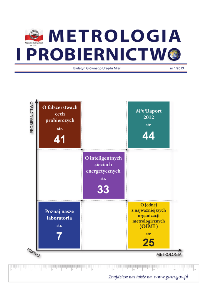METROLOGIA I PROBIERNICTWO Mierzymy dla Wszystkich od 1919 r. PROBIERNICTWO Biuletyn Głównego Urzędu Miar nr 1/2013 O fałszerstwach cech probierczych MiniRaport 2012 str. str. 44 41 O inteligentnych sieciach energetycznych str. 33 PR 0 Poznaj nasze laboratoria O jednej z najważniejszych organizacji metrologicznych str. (OIML) 7 str. 25 AW O 2 METROLOGIA 4 6 8 10 12 14 16 Znajdziesz nas także na www.gum.gov.pl 18 W numerze: Zakłady metrologiczne w Głównym Urzędzie Miar 4-6 WYDARZENIA 25-32 WSPÓŁPRACA 7-24 TECHNIKA I POMIARY Z precyzją do miliardowych części sekundy Rola niepewności przy ocenie zdolności pomiarowej przyrządu Nowe podejście w definiowaniu jednostek miar Przekazywanie jednostki masy od wzorca państwowego do wielokrotności i podwielokrotności kilograma w oparciu o hierarchiczny układ sprawdzań Ewolucja międzynarodowych organizacji metrologicznych na przykładzie Międzynarodowej Organizacji Metrologii Prawnej Udział pracowników GUM w XII Sympozjum „Niepewność Pomiarów” 33-37 PRAWNA KONTROLA METROLOGICZNA 38-40 TERMINOLOGIA Fałszerstwa cech probierczych i sposoby ich wykrywania Międzynarodowe instrumenty prawne i rekomendacje w dziedzinie „smart grid” Informacja o prowadzonych pracach legislacyjnych w związku z upływem terminu okresu przejściowego dla stosowania art. 27 i 29a ustawy – „Prawo o miarach” 41-43 PROBIERNICTWO Wydawca: GŁÓWNY URZĄD MIAR ul. Elektoralna 2, 00-139 Warszawa, tel.: 22 581 93 99, fax: 22 581 93 92 Redakcja: Karol Markiewicz (red. naczelny), Adam Żeberkiewicz (sekretarz red.), Magdalena Ulaczyk (Probiernictwo), dr Jerzy Borzymiński (Terminologia), dr Paweł Fotowicz (Technika i pomiary), Aniceta Imiełowska (Czy wiesz, że), Agnieszka Goszczyńska (Wydarzenia), Joanna Sękala (Współpraca), Tadeusz Lach (Prawna kontrola metrologiczna) Zdjęcia: Maciej Koszarny, archiwum GUM i OUP Warszawa Druk: Drukarnia SMYK s.c., ul. Ściegiennego 215, 25-116 Kielce Wszystkie prawa zastrzeżone. Redakcja nie zwraca materiałów nie zamówionych oraz zastrzega sobie prawo do skrótów i zmian tytułów. Pytania i uwagi do redakcji: [email protected] 44-47 CZY WIESZ, ŻE...? Szanowni Państwo, z niezwykłą satysfakcją przedstawiam pierwszy numer Biuletynu Informacyjnego Głównego Urzędu Miar (GUM) pn. „Metrologia i Probiernictwo”. Publikacja ta ma w nowy sposób propagować działalność polskiej administracji miar i administracji probierczej oraz przekazywać doświadczenie i dorobek metrologów dokonujących pomiarów w laboratoriach GUM. Mówimy o nowym spojrzeniu, choć tak naprawdę zarówno jeśli chodzi o tytuł, jak i pod względem treści biuletyn nawiązywać będzie do kilku poprzednich wydawnictw GUM, przede wszystkim do wydawanego w latach 1996–2000 biuletynu „Metrologia i Probiernictwo”. Chcemy nadal publikować treści, których wartość naukowa była najwyższa i doceniana przez czytelników, pragniemy również wzbogacić biuletyn o nowe zagadnienia, które jak sądzę, spotkają się z takim samym zainteresowaniem. Zachęcam do lektury artykułów technicznych, które będą publikowane w dziale „Technika i pomiary”. W tym numerze znajdą tam Państwo m.in. rozważania o niepewności pomiarów oraz opis zakładów metrologicznych działających w naszym urzędzie. To aktualna wskazówka dla tych, którzy byli czytelnikami wydawanego w GUM do listopada 2012 r. pisma pod nazwą „Metrologia”. Drodzy Czytelnicy, co kwartał planujemy dostarczać Państwu informacji o aktualnych istotnych wydarzeniach dotyczących działalności GUM, w tym bogatej współpracy z międzynarodowymi organizacjami metrologicznymi. Nie zabraknie też miejsca dla prawnej kontroli metrolo- gicznej i śladów obecności metrologii w życiu codziennym. W tym roku, jak zawsze w dniu 20 maja, obchodziliśmy Światowy Dzień Metrologii, tym razem pod hasłem „Pomiary w życiu codziennym”. W kolejnym numerze „Metrologii i Probiernictwa” zamieścimy relację z tych obchodów, ukazującą związek metrologii z codzienną aktywnością człowieka. Działalność GUM to również współpraca z ośrodkami akademickimi i udział w projektach badawczych współfinansowanych przez Unię Europejską, jak np. w wieloletnim Europejskim Programie Badań Metrologicznych – EMRP. O tym także będziemy informować na naszych łamach. Co ważne, otrzymują Państwo do rąk publikację niekomercyjną, której celem jest przedstawianie znaczenia dorobku metrologii i probiernictwa w różnych obszarach aktywności społecznej. Szanowni Czytelnicy, jestem przekonana, że artykuły i informacje publikowane na łamach naszego Biuletynu, będą interesujące dla szerokiego kręgu osób, a więc m.in. dla naszych klientów, pracowników ośrodków naukowo-badawczych, przedsiębiorców, urzędników czy parlamentarzystów. Gorąco zachęcam Państwa do sięgnięcia po „Metrologię i Probiernictwo”, a także do kontaktu z nami. Mam nadzieję, że każdy czytelnik znajdzie w tej publikacji interesujące go treści. Życzę ciekawej lektury zarówno tego, jak i kolejnych wydań naszego Biuletynu. Janina Maria Popowska Prezes Głównego Urzędu Miar Wydarzenia 15.06 17. Piknik Naukowy Polskiego Radia i Centrum Nauki Kopernik 23.05 Spotkanie przedstawicieli laboratoriów wzorcujących i audytorów 20.05 Światowy Dzień Metrologii Z udziałem Głównego Urzędu Miar na Stadionie Narodowym w Warszawie odbyła się 17. edycja Pikniku Naukowego Polskiego Radia i Centrum Nauki Kopernik pod hasłem ŻYCIE . 23 maja 2013 r. w Galerii Porczyńskich w Warszawie odbyło się spotkanie, z udziałem przedstawicieli Głównego Urzędu Miar (GUM), którego tematem przewodnim były Badania biegłości jako narzędzie do potwierdzania wartości CMC, spójności pomiarowej oraz walidacji metod pomiarowych. Elżbieta Michniewicz, Dyrektor Zakładu Elektrycznego GUM przedstawiła zasady europejskiej działalności metrologicznej, zaś Joanna 
