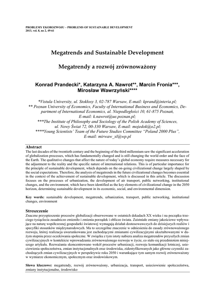 PROBLEMY EKOROZWOJU – PROBLEMS OF SUSTAINABLE DEVELOPMENT 2013, vol. 8, no 2, 49-61 Megatrends and Sustainable Development Megatrendy a rozwój zrównoważony Konrad Prandecki*, Katarzyna A. Nawrot**, Marcin Fronia***, Mirosław Wawrzyński**** *Vistula University, ul. Stokłosy 3, 02-787 Warsaw, E-mail: [email protected]; ** Poznan University of Economics, Faculty of International Business and Economics, Department of International Economics, al. Niepodległości 10, 61-875 Poznań, E-mail: [email protected]; ***The Institute of Philosophy and Sociology of the Polish Academy of Sciences, ul. Nowy Świat 72, 00-330 Warsaw, E-mail: [email protected]; ****Young Scientists’ Team of the Future Studies Committee “Poland 2000 Plus”, E-mail: [email protected] Abstract The last decades of the twentieth century and the beginning of the third millennium saw the significant acceleration of globalization processes, which has fundamentally changed and is still changing the world order and the face of the Earth. The qualitative changes that affect the nature of today’s global economy require measures necessary for the adjustment to the reality and the specific nature of international relations. This is of particular importance for the principle of sustainable development, which depends on the on-going civilizational change largely shaped by the social expectations. Therefore, the analysis of megatrends in the future civilizational changes becomes essential in the context of the achievement of sustainable development, which is discussed in this article. The discussion focuses on the processes of urbanization, the development of air transport, public networking, institutional changes, and the environment, which have been identified as the key elements of civilizational change in the 2050 horizon, determining sustainable development in its economic, social, and environmental dimension. Key words: sustainable development, megatrends, urbanization, transport, public networking, institutional changes, environment Streszczenie Znaczne przyspieszenie procesów globalizacji obserwowane w ostatnich dekadach XX wieku i na początku trzeciego tysiąclecia zasadniczo zmieniło i zmienia porządek i oblicze świata. Zaistniałe zmiany jakościowe wpływające na naturę współczesnej gospodarki światowej wymagają działań dostosowawczych do dzisiejszych realiów i specyfiki stosunków międzynarodowych. Ma to szczególne znaczenie w odniesieniu do zasady zrównoważonego rozwoju, której realizacja uwarunkowana jest zachodzącymi zmianami cywilizacyjnymi ukształtowanymi w dużym stopniu przez oczekiwania społeczne. W związku z tym istoty nabiera analiza megatrendów przyszłych zmian cywilizacyjnych w kontekście wprowadzania zrównoważonego rozwoju w życie, co stało się przedmiotem niniejszego artykułu. Rozważania skoncentrowano wokół procesów urbanizacji, rozwoju komunikacji lotniczej, usieciowienia społeczeństwa, zmian instytucjonalnych oraz środowiska, zidentyfikowanych jako główne czynniki zachodzących zmian cywilizacyjnych w perspektywie roku 2050 i warunkujące tym samym rozwój zrównoważony w wymiarze ekonomicznym, społecznym oraz środowiskowym. Słowa kluczowe: megatrendy, rozwój zrównoważony, urbanizacja, transport, usieciowienie społeczeństwa, zmiany instytucjonalne, środowisko 50 Prandecki et al./Problemy Ekorozwoju/Problems of Sustainable Development 2/2013, 49-61 Introduction The future is a fundamental element of the sustainable development concept. This is clearly highlighted in the definition included in the Brundtland Report, where sustainable development is defined as development that meets the needs of the present without compromising the ability of future generations to meet their own needs (WCED, 1987). This definition suggests that civilizational changes should take into account not only of the present, but also of the needs of the generations to come. In addition, the key element of that concept is the fear of the environmental limits to growth (Meadows at al., 1972). What it means in practice is that we need to monitor and control the rate of consumption of natural resources so as to prevent their depletion. Those measures should be taken with due regard to the rules of social justice, and therefore should satisfy the needs of the poorest societies and, at the same time, reduce the consumption rate in highly developed countries (Dresner, 2002). Past experience in the implementation of sustainable development leads us to the conclusion that the concept, on the one hand, is becoming a widely recognized political movement; but, at the same time, it seems to be nothing more than an empty slogan having very little in common with the reality of today’s world (Pawłowski, 2010). True, we have been witnessing many attempts aimed at implementing the principle of sustainable development, especially as part of the EU energy and climate policy. However, those efforts look more like an attempt to find one’s way in the dark rather than heading towards a predefined goal (Prandecki, 2011a). This is mainly due to the fact that the concept is very general and there is no set of universally applied measures to determine whether or not a given initiative is consistent with the underlying concept. There is a large body of publications prescribing the implementation of sustainable development (inter alia Edwards, 2010; Korten, 2010; Jackson, 2009). They are usually limited to rather general messages suggesting the need to change the public approach to consumption and possession of material wealth. Those analyses present idealistic visions without considering the changes in today’s world. Such an approach is their major weakness. Therefore, it seems only justified to analyze the current scenarios of the world’s development and to determine whether it is at all possible to achieve sustainable development in the context of the expected megatrends. The term megatrend