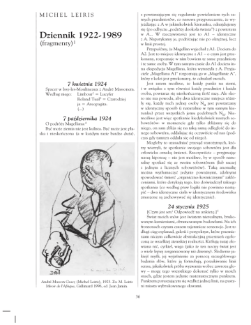 MICHEL LEIRIS z powtarzającym się regularnie powielaniem tych sa mych przedmiotów, co nasuwa przypuszczenie, że wy jeżdżając z A w jakimkolwiek kierunku, odnajdujemy się (po odbyciu „podróży dookoła świata”) z powrotem w A... W rzeczywistości jest to A1 - identyczne z A. Napotykamy je, podróżując nie po okrężnej, lecz w linii prostej. Przypuśćmy, że Magellan wyjechał z A1. Dociera do A2. Jest to miejsce identyczne z A1 - o czym jest prze konany, rozpoznaje w nim bowiem te same przedmioty i te same osoby. W tym samym czasie do A1 dociera in na ekspedycja Magellana, która wyruszyła z A. Przyja ciele „Magellana A 1” rozpoznają go w „Magellanie A ”, który z kolei jest przekonany, że odnalazł swoich. Jest zatem możliwe, że każdy punkt na ziemi, i w związku z tym również każdy przedmiot i każda osoba, powtarza się nieskończoną ilość razy. Ale sko ro nie ma powodu, aby dwa identyczne miejsca różni ły się, każdy ruch jednej osoby N a jest powtarzany w identyczny sposób (i naturalnie w tym samym kie runku) przez wszystkich jemu podobnych N n. Nie możliwe jest więc spotkanie kiedykolwiek naszych so bowtórów: w momencie gdy tylko zbliżamy się do niego, on sam zbliża się na taką samą odległość do in nego sobowtóra, oddalając się oczywiście od nas (pod czas gdy tamten oddala się od niego). Mogłoby to uzasadniać przesąd starożytnych, któ rzy wierzyli, że spotkanie swojego sobowtóra jest dla człowieka oznaką śmierci. Rzeczywiście - przyjmując naszą hipotezę - nie jest możliwe, by w sposób natu ralny spotkać się ze swoim sobowtórem (lub raczej z jednym z licznych sobowtórów). Taką anomalię można wytłumaczyć jedynie poważnymi, zdolnymi spowodować śmierć „organiczno-kosmicznymi” zakłó ceniami, które dotykają tego, kto doświadczył takiego spotkania (co według praw logiki nie powinno nastą pić - dwa identyczne ciała w identycznym środowisku zmuszone są zachowywać się identycznie). Dziennik 1922-1989 (fragmenty) 1 7 kwietnia 1924 Spacer w Issy-les-Moulineaux z André Massonem. Według niego: Limbour2 = Lucyfer Roland Tual3 = Czarodziej ja = Areopagita. (...) 7 października 1924 O podróży Magellana:4 Być może ziemia nie jest kulista. Być może jest pła ska i nieskończona (a w każdym razie bardzo duża), 24 stycznia 1925 [Crym jest sen? Odpowiedź na ankietę.]5 Świat moich snów jest światem nierealnym, bruko wanym kamieniami, obramowanym budowlami. N a ich frontonach czytam czasem tajemnicze sentencje. Jest to długi ciąg esplanad, galerii i perspektyw, które przemie rzam niczym całkowicie abstrakcyjną przestrzeń ogoło coną ze wszelkiej ziemskiej realności. Królują tutaj oło wiana nić, cyrkiel, waga (jako że ten nocny świat jest o wiele lepiej zorganizowany niż dzienny). Śledzenie ja kiejś myśli, jej wyjaśnienie za pomocą szczegółowego badania słów, które ją formułują, poszukiwanie linii sensu, jakakolwiek próba wyzwania wobec zawrotu gło wy - mogę tego wszystkiego dokonać tylko w moich snach, gdzie jestem jedynie matematycznym punktem. Punktem poruszającym się wzdłuż jednej linii, na pusty ni miasta wybrukowanego słowami. André Masson Gracz (Michel Leiris), 1923. Za: M. Leiris Miroir de l'Afrique, Gallimard 1996, ed. Jean Jamin. 36 Michel Leiris • DZIENNIK 1922-1989 Gdy tylko dzień odchodzi i oczy się zamykają, sy laby i litery wzbogacają się nowymi znaczeniami. For ma litery, dźwięk sylaby popychają umysł ku nieocze kiwanym tropom, odsłaniając przed nim nieznane związki pomiędzy różnymi elementami języka. Ileż to słów, których ukryty, intymny sens nigdy mi się wy raźnie nie ukazał, zostało w ten sposób przetłumaczo nych we śnie... Wydarzenia występujące zazwyczaj we śnie, nie in teresują mnie bardziej niż te rzeczywiste. Wydaje mi się jedynie ważne, to wspaniałe wy zwolenie umysłu, które pozwala na roztrząsanie naj poważniejszych spekulacji za pomocą analizy słów tej specjalnej logiki, mniej rygorystycznej niż trady cyjna, ale o ileż bardziej przekonywającej w swych objawieniach... Ten szczególny świat myśli tworzy nieustannie se kretną osnowę moich marzeń sennych. Trwały znak, który odnajduję we wszystkich przygodach mojego snu - niezależnie od tego, czy chodzi o podróż po podziem nych labiryntach, czy też o gonitwy wzdłuż meandrów bagnistej rzeki, która prowadzi mnie do bieguna, do kobiecego łona lub do prawdy. 15 maja 1929 (...) Poezja jest długotrwałą walką ze śmiercią (śmiercią, którą staramy się poznać, wierząc, że dzięki temu zdołamy ją okiełznać). To właśnie zbliża ją do mi styki, której celem jest zdobycie za życia namacalnego świadectwa nieśmiertelności. Pragnienie absolutu w rzeczywistości dotyczy negacji czasu - w ten sposób śmierć przestałaby istnieć. Stwarzamy świat poezji, po nieważ wszystko wydaje się w nim nienaruszalne - niepoddane zmienności i niszczeniu, którym podlega ciało. (...) Nie chodzi bowiem o to, że jego ponadczasowość jest szlachetniejsza, ale że jest „ponadczasowa”, czyli (w dosłownym sensie tego słowa) „ponad czasem”: niepoddana przemijaniu i śmierci. (...) Dlatego poezja powinna być rozumiana jako narkotyk lub nałóg, które go jedyną rolą jest pozwolić zapomnieć. (...) Każde działanie artystyczne sięga korzeniami do tej właśnie wojny przeciwko śmierci. Przypomina to ogromną pracę, jaką wykonali Holendrzy w XVII wie ku, by wydrzeć morzu nowe tereny, osuszając je. Jed nak w bitwie, jaką prowadzi sztuka, nie ma trwałych zdobyczy. Wszystkie zwycięstwa są złudzeniem. Trzeba bez przerwy budować na nowo, stawiać nowe funda- Od lewej: Robert Desnos, Georges Bataille, Gaston-Louis Roux, Alberto Giacometti, Michel Leiris, hrabia de Noailles i Georges Auric. Anonimowa fotografia, ok. 1925. Biblioteque littéraire Jacques Doucet. 37 Michel Leiris • DZIENNIK 1922-1989 men