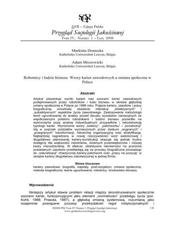 QSR – Edycja Polska Przegląd Socjologii Jakościowej Tom IV, Numer 1 – Luty 2008 Markieta Domecka Katholieke Uniwersiteit Leuven, Belgia Adam Mrozowicki Katholieke Uniwersiteit Leuven, Belgia Robotnicy i ludzie biznesu. Wzory karier zawodowych a zmiana społeczna w Polsce Abstrakt Artykuł prezentuje wyniki badań nad wzorami karier zawodowych podejmowanych przez robotników i ludzi biznesu w okresie głębokiej zmiany społecznej w Polsce po 1989 roku. Pojęcia kariery, zasobów i pracy biograficznej umożliwiły zbadanie interakcji „obiektywnych” i „subiektywnych” aspektów życia zawodowego. Zastosowanie metodologii teorii ugruntowanej do analizy ponad dwustu wywiadów narracyjnych ze współczesnymi polskimi robotnikami i ludźmi biznesu pozwoliło na wykroczenie poza analizę indywidualnych przypadków i rekonstrukcję typologii karier. Wyróżnione wzory „kotwicy”, „patchworku” i „konstrukcji” idą w poprzek podziałów wyznaczonych przez dyskurs „wygranych” i „przegranych” transformacji, hierarchię organizacyjną oraz stratyfikację. Najbardziej nagradzany w nowej rzeczywistości wzór wielotorowej i długofalowo planowanej kariery-konstrukcji okazuje się jednak trudno dostępny dla większości robotników, drobnych przedsiębiorców i niższej kadry menedżerskiej. W efekcie, obiektywne nierówności na poziomie posiadanych zasobów przekładają się na procesy biograficzne prowadząc do „naturalizacji” chaotycznej kariery-patchwork oraz „pracy na pozycję” w obrębie kariery długofalowo zakotwiczonej w jednej firmie. Słowa kluczowe kariery zawodowe, biografie, kapitały, post-socjalizm, zmiana społeczna, metoda biograficzna, teoria ugruntowana, robotnicy, środowisko biznesu. Wprowadzenie Niniejszy artykuł stawia problem relacji między skonstruowanymi społecznie wzorami karier, funkcjonującymi jako element „normalności” przebiegu życia (por. Kohli, 1988; Prawda, 1987), a głęboką zmianą systemową, rozumianą jako wzajemnie powiązane procesy przekształceń reguł instytucjonalnych i ©2008 PSJ Tom IV Numer 1 Przegląd Socjologii Jakościowej www.qualitativesociologyreview.org 136 indywidualnych strategii działania (por. Mach, 1998). Odwołując się do pojęcia kariery (por. Hughes, 1997), rozpatrujemy typowe modele przebiegu życia zawodowego współczesnych polskich robotników i ludzi biznesu. Przeprowadzona analiza porównawcza ma na celu wyjaśnienie podobieństw i różnic w karierach zawodowych przedstawicieli środowisk reprezentujących dwa „krańce” hierarchii organizacyjnej (por. Glaser, 1968: 413), różnie doświadczających i doświadczonych przez transformację systemową w Polsce po 1989 roku (por. Jasiecki, 2002; Gardawski, 1997). W artykule zrekonstruowane zostają trzy zasadnicze wzory karier („kotwica”, „patchwork”, „konstrukcja”), które – mimo wewnętrznych różnic – pojawiają się w obu badanych środowiskach. Empiryczna część tekstu przynosi bliższą definicję wspomnianych typów ze względu na charakter towarzyszących im procesów biograficznych i sprzyjających zasobów, porównuje ich właściwości w warunkach realnego socjalizmu i w czasach obecnych oraz próbuje odpowiedzieć na pytanie o źródła ich wewnętrznego zróżnicowania i dynamiki w okresie zmiany systemowej. Badanie wzorów karier dostarcza argumentów na rzecz tezy o „rekombinacyjnej” naturze transformacji postkomunistycznej (por. Mach, 1998; Stark, Bruszt, 2001), która, obok otwarcia pola dla działań innowacyjnych, sprzyja readaptacji części wzorów działania „odziedziczonych” po realnym socjalizmie. Inspiracje teoretyczne i pojęcia uwrażliwiające w badaniu karier Badanie karier w okresie głębokiej zmiany społecznej wymaga zastosowania procedur metodologicznych i pojęć teoretycznych, które umożliwią ujęcie dynamicznych aspektów zmieniającej się rzeczywistości. Odwołanie się do strategii teorii ugruntowanej (por. Glaser, Strauss, 1967; Glaser, 1978), w celu wyjaśnienia obserwowanych wzorów organizacji życia zawodowego, pozwala na względną otwartość teoretyczną wobec zjawisk i procesów, które są substantywnie nowe i w niewielkim stopniu przebadane na gruncie polskimi. Otwartość taka nie stoi w sprzeczności z „teoretyczną wrażliwością” (por. Glaser, 1978), zasadzającą się na „wiedzy socjologicznej badacza, [jego] przygotowaniu i umiejętnościach konceptualnego rozumienia danych przedmiotowych” (por. Glaser, 1992: 27). W naszych badaniach takiego typu „wrażliwość” pojawia się w dwóch postaciach. Po pierwsze, korzystamy z określonych przesłanek ontologicznych, takich jak założenie o procesualnym charakterze rzeczywistości i kształtowaniu się działań w interakcji między aktorami i ich środowiskiem (por. Strauss, 1991), przypisywanych przez Anselma Strauss’a dziedzictwu pragmatyzmu filozoficznego i dość powszechnie akceptowanych przez współczesnych badaczy biograficznych (por. Chamberlane i in., 2002; Bertaux, Kohli, 1984; Ferrarotti, 2002). Po drugie, odwołujemy się one do określonego spektrum „pojęć uwrażliwiających” (por. Blumer, 1954: 7) wywodzących się zarówno z tradycji socjologii interpretatywnej (jak kategoria kariery czy biografii), jak i ze strukturalistycznie zorientowanych szkół myśli socjologicznej (jak koncepcja „kapitałów”)ii. Badania dotyczą karier związanych z zawodowym aspektem pracy. Wychodzą one jednak z szerszej definicji tego ostatniego zjawiska, zaproponowanej przez Straussa, sugerującego objęcie tym terminem „każdego przedsięwzięcia, nawet jeśli ludzie zaangażowani w to przedsięwzięcie nie myślą o nim jako obejmującym pracę” (Strauss, 1993: 94). Praca w znaczeniu wąskim to aktywność służąca – pośrednio lub bezpośrednio – „podtrzymaniu egzystencji jednostek i grup społecznych” (Kozek, 2000: 175). W znaczeniu szerokim jest ona natomia