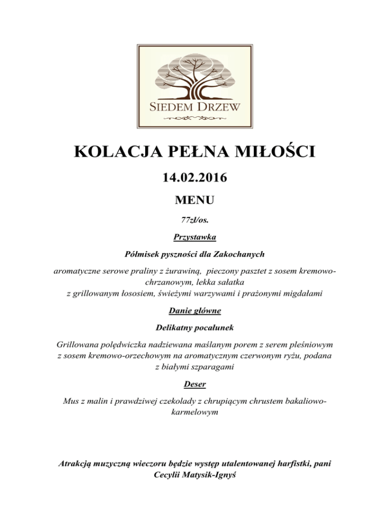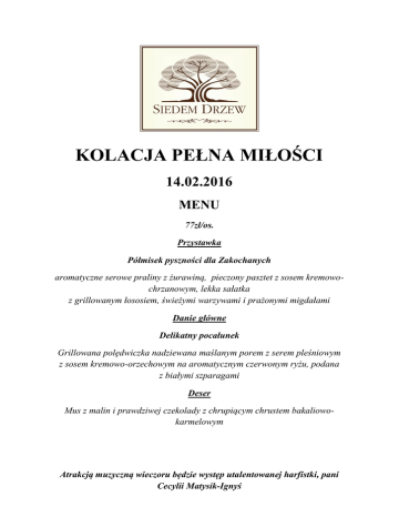 KOLACJA PEŁNA MIŁOŚCI 14.02.2016 MENU 77zł/os. Przystawka Półmisek pyszności dla Zakochanych aromatyczne serowe praliny z żurawiną, pieczony pasztet z sosem kremowochrzanowym, lekka sałatka z grillowanym łososiem, świeżymi warzywami i prażonymi migdałami Danie główne Delikatny pocałunek Grillowana polędwiczka nadziewana maślanym porem z serem pleśniowym z sosem kremowo-orzechowym na aromatycznym czerwonym ryżu, podana z białymi szparagami Deser Mus z malin i prawdziwej czekolady z chrupiącym chrustem bakaliowokarmelowym Atrakcją muzyczną wieczoru będzie występ utalentowanej harfistki, pani Cecylii Matysik-Ignyś