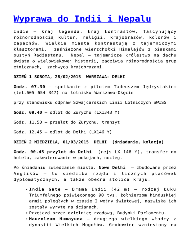 Wyprawa do Indii i Nepalu Indie – kraj różnorodnością legenda, kraj kontrastów, fascynujący kultur, religii, krajobrazów, kolorów i zapachów. Wielkie miasta kontrastują z tajemniczymi klasztorami, zaśnieżone wierzchołki Himalajów z piaskami pustyń Radżastanu. Nepal – tajemnicze królestwo na dachu świata o wielowiekowej historii, zadziwia różnorodnością grup etnicznych, zachwyca krajobrazami. DZIEŃ 1 SOBOTA, 28/02/2015 WARSZAWA- DELHI Godz. 07.30 – spotkanie z pilotem Tadeuszem Jędrysiakiem (tel.605 654 347) na lotnisku Warszawa-Okęcie przy stanowisku odpraw Szwajcarskich Linii Lotniczych SWISS Godz. 09.40 – odlot do Zurychu (LX1343 Y) Godz. 11.50 – przelot do Zurychu, tranzyt Godz. 12.45 – odlot do Delhi (LX146 Y) DZIEŃ 2 NIEDZIELA, 01/03/2015 DELHI (śniadanie, kolacja) Godz. 00.45 przylot do Delhi (rejs LX 146 Y), transfer do hotelu, zakwaterowanie w pokojach, nocleg. Po śniadaniu zwiedzanie miasta. Nowe Delhi – zbudowane przez Anglików – to siedziba rządu i licznych placówek dyplomatycznych, a także obecna stolica kraju. India Gate – Brama Indii (42 m) – rodzaj Łuku Triumfalnego poświęconego 90 tys. żołnierzom hinduskiej armii poległych w czasie I wojny światowej, nazwiska ich zostały wyryte na ścianach. Przejazd przez dzielnicę rządową, Budynki Parlamentu. Mauzoleum Humayuna – drugiego wielkiego władcy z dynastii Wielkich Mogołów. Grobowiec wzniesiony na tarasie w XVI w., ozdobiony łukami z czerwonego piaskowca w środku dużego ogrodu otoczonego murem. Grobowiec był wzorem przy budowie mauzoleum Tadż Mahal w Agrze (zabytek UNESCO). Zwiedzanie Świątyni Lotosu – będąca w rzeczywistości Domem Modlitwy, wyrosłym na podłożu filozofii bahaizmu. Miejsce jest usytuowane z dala od centrum i pozwala odnaleźć spokój i ciszę w tym wielkim mieście, a dodatkowo łączy wyznawców wszystkich religii. Qutub Minar – minaret. Ma blisko 73 m wysokości (co stanowi najwyższy na świecie minaret z cegieł), jego średnica maleje ku górze, u podstawy wynosi 15 m, a u szczytu 2,5 m. Jest to wieża zwycięstwa, przypominająca w stylu wieże afgańskie i pełniąca funkcje minaretu. Przypatrując się wieży można dostrzec 5 poziomów, oddzielonych balkonami. Pierwsze trzy są wykonane z czerwonego piaskowca, a 4. i 5. zarówno z piaskowca, jak i marmuru. Na całej jego wysokości wyryte są doskonale zachowane inskrypcje z Koranu (zabytek UNESCO). Powrót do hotelu, kolacja, nocleg. Hotel Lemon Tree Premier Aerocity – Delhi (3 noclegi) DZIEŃ 3 PONIEDZIAŁEK, 02/03/2015 DELHI Po śniadaniu zwiedzanie Starego Delhi (stare miasto położone nad rzeką Jamuną, dawna stolica kraju), przejazd rykszami przez uliczki Starego Delhi Wielki Meczet – Jama Masjid (Meczet Piątkowy) – zbudowany przez cesarza Szahdżahana (1644-1658). Jest to największy meczet w całych Indiach. Meczet ma trzy wielkie bramy, cztery narożne wieże i dwa 40 m minarety, zbudowane z czerwonego piaskowca i białego marmuru. Dziedziniec meczetu może pomieścić 25 000 osób. Przejazd obok Czerwonego Fortu (zabytek UNESCO). Raj Ghat – miejsce kremacji Mahatma Gandhi przerwa na lunch zwiedzanie świątyni Sików (Gurudwary) w Nowym Delhi powrót do hotelu, kolacja, nocleg Hotel Lemon Tree Premier Aerocity – Delhi DZIEN 4 WTOREK, 03/03/2015 DELHI – MANDAWA Po śniadaniu przejazd autokarem do Mandawy (260 km ok.6 godz.). Jest to urocze miasteczko założone w XVIII w. przez kupców, ponieważ leży na trasie karawan tzw. jedwabnego szlaku. Miasto to czerpało ogromne zyski z handlu. Bogaci kupcy budowali tu w irańsko-perskim stylu wspaniałe rezydencje, tzw. haveli. W mieście znajduje wiele haveli malowanych metodą al fresco bueno. Znajdują się tu także pozostałości po fortyfikacjach. Zakwaterowanie w starym zamku należącym do maharadży, który połowę swojej rezydencji przerobił na hotel, kolacja i nocleg. Hotel Castle – Mandawa (1 nocleg) DZIEŃ 5 ŚRODA, 04/03/2015 MANDAWA – JAIPUR Po śniadaniu spacer po Mandawie – zwiedzanie haveli przejazd do Jaipuru (170 km ok. 4 godz.) krótki postój w Nawalgarh – miasto podobnie jak Mandawa posiada kilka ciekawych odnowionych haveli, obecnie przerobionych na hotele dla turystów przyjazd do Jajpuru, zakwaterowanie, kolacja, nocleg Hotel Lemon Tree Premier – Jaipur (3 noclegi) DZIEŃ 6 CZWARTEK, 05/03/2015 – JAIPUR Jaipur – stolica Radżastanu, najciekawszy oraz najbardziej egzotyczny i najbarwniejszy zakątek Indii. Jaipur nazywany jest Różowym Miastem z powodu murów domów pokrytych farbą ze sproszkowanego minerału terakotowego – garo, zmieszanego z wapnem, co daje jasno koralowy połysk. Kolor różowy w kulturze rajpudżkiej to kolor gościnności. Kiedy w 1853 r. Jaipur odwiedził książę Walii maharadża kazał pomalować na jego cześć miasto na różowo. po śniadaniu, przejazd do miasta, oglądanie fasady Pałacu Wiatrów – Hawa Mahal z XVIII w., wzniesionego przy jednej z głównych ulic miasta, aby umożliwić damom dworu obserwowanie życia codziennego mieszkańców. Pałac składa się wyłącznie z fasady, a różowe oktagonalne okna przypominają plaster miodu. zwiedzanie Fort Amber – kompleksu budowli obronnych i pałacowych. Była to siedziba maharadży, położona w odległości 10 km od Jajpuru. przejazd do miasta, przerwa na lunch na terenie pałacu maharadży zwiedzanie Pałacu Miejskiego (pałac maharadży) – część jego stanowi nadal siedzibę maharadżów Jajpuru. Jantar Mantar – obserwatorium astronomiczne, budowla ukończona w 1734 r. Obserwatorium składa się z 16 obiektów służących m.in. do ustalania azymutu i pozycji gwiazd, określania dat zaćmień Słońca i wysokości nad poziomem morza. Jest to największe kamienne obserwatorium astronomiczne na świecie (zabytek UNESCO) powrót do hotelu, kolacja, nocleg. Hotel Lemon Tree Premier – Jaipur DZIEŃ 7 PIĄTEK, 06/03/2015 – JAIPUR ŚWIĘTO WIOSNY HOLI – KOLOROWE