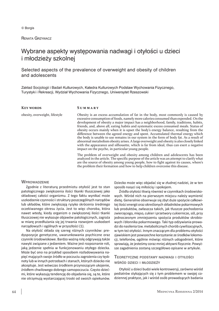 © Borgis Renata Grzywacz Wybrane aspekty występowania nadwagi i otyłości u dzieci i młodzieży szkolnej Selected aspects of the prevalence of overweight and obesity of children and adolescents Zakład Socjologii i Badań Kulturowych, Katedra Kulturowych Podstaw Wychowania Fizycznego, Turystyki i Rekreacji, Wydział Wychowania Fizycznego, Uniwersytet Rzeszowski Key words Summary obesity, overweight, lifestyle Obesity is an excess accumulation of fat in the body, most commonly is caused by excessive consumption of foods, namely more calories consumed than expended. On the development of obesity a major impact has a neighborhood, family, traditions, habits, friends, and, above all, eating habits and systematic excess consumed meals. Status of obesity occurs mainly when it is upset the body’s energy balance, resulting from the difference between the agreed energy and spent. Accumulated thermal energy which the body is unable to use remains in our system in the form of body fat. As a result of abnormal metabolism obesity arises. A large overweight and obesity is also closely linked with the appearance and silhouette, which is far from ideal, thus can exert a negative impact on the psyche, in particular young people. The problem of overweight and obesity among children and adolescents has been analyzed in the article. The specific purpose of the article was an attempt to clarify what are the source of obesity among young people, how to fight against its causes, where’s the problem their formation and how to help children overcome this disease. Wprowadzenie Zgodnie z literaturą przedmiotu otyłość jest to stan patologicznego zwiększenia ilości tkanki tłuszczowej jako składowej całości organizmu. Z tego faktu wynikać może uszkodzenie czynności i struktury poszczególnych narządów lub układów, które zwiększają ryzyko skrócenia średniego oczekiwanego okresu życia. Jest to więc choroba, która nawet wtedy, kiedy organizm o zwiększonej ilości tkanki tłuszczowej nie wykazuje objawów patologicznych, zagraża w miarę przedłużania się jej trwania rozwojem uszkodzeń narządowych i ogólnych w przyszłości (1). Na otyłość składa się szereg różnych czynników: predyspozycje genetyczne, uwarunkowania psychiczne oraz czynniki środowiskowe. Bardzo ważną rolę odgrywają także nawyki związane z jedzeniem. Ważne jest rozpoznanie roli, jaką jedzenie spełnia w funkcjonowaniu otyłego dziecka. Może być ono na przykład sposobem rozładowywania napięć mających swoje źródło w poczuciu zagrożenia czy tęsknoty lub w innych potrzebach i stanach, których dziecko nie akceptuje. Jest wówczas środkiem przynoszącym ukojenie, źródłem chwilowego dobrego samopoczucia. Często dziećmi, które wykazują tendencję do objadania się, są te, które nie otrzymują wystarczającej troski od swoich opiekunów. 64 Dziecko może więc objadać się w złudnej nadziei, że w ten sposób nasyci się miłością i spokojem. Źródła otyłości tkwią również w czynnikach środowiskowych. Wśród nich na pierwszym miejscu należy wymienić dietę. Generalnie obserwuje się zbyt duże spożycie całkowitej ilości energii oraz określonych składników pokarmowych lub produktów, zwłaszcza takich, jak tłuszcze pochodzenia zwierzęcego, mięso, cukier i przetwory cukiernicze, sól, przy jednoczesnym zmniejszeniu spożycia produktów skrobiowych i błonnika pokarmowego. Taki typ odżywiania prowadzi do nasilenia tzw. metabolicznych chorób cywilizacyjnych, w tym też otyłości. Innym znaczącym dla problemu otyłości zjawiskiem jest powszechne korzystanie ze środków lokomocji, telefonów, ogólnie mówiąc różnych udogodnień, które sprawiają, że jesteśmy coraz mniej aktywni fizycznie. Powyższe zagadnienia zostaną szczegółowo opisane w artykule. Teoretyczne podstawy nadwagi i otyłości wśród dzieci i młodzieży Otyłość u dzieci budzi wiele kontrowersji, zarówno wśród pediatrów stykających się z tym problemem w swojej codziennej praktyce, jak i wśród osób prowadzących badania Medycyna Rodzinna 2/2014 Wybrane aspekty występowania nadwagi i otyłości u dzieci i młodzieży szkolnej i obserwacje wybranych grup. Wśród wielu pediatrów panuje pogląd, że otyłość nie jest chorobą, a otyłe dziecko nie wymaga szczególnej opieki lekarskiej. Istnieje przekonanie, że próby redukcji nadwagi są nieefektywne i że otyłe dziecko samo „wyrasta” z otyłości (2). Wydaje się, że również rodzice nie dostrzegają wagi problemu, a utożsamianie pulchnego dziecka ze zdrowiem jest nadal aktualne. Innymi słowy, oznaki „prawidłowego odżywiania” w postaci dobrze wyglądającego dziecka – dziecka otyłego – świadczyć mają o jego obecnym i przyszłym zdrowiu i szczęściu (3). W rzeczywistości nadwaga i otyłość wiążą się z wieloma poważnymi konsekwencjami zdrowotnymi dla dziecka, a później najprawdopodobniej otyłego dorosłego. Warto zaznaczyć, że konsekwencje te nie wiążą się tylko i wyłącznie z fizycznym funkcjonowaniem, ale mogą również dotyczyć zdrowia psychicznego i społecznego młodego człowieka. Otyłość jako jedno z najczęściej występujących zaburzeń rozwoju dzieci i młodzieży wpływa na wszystkie elementy zdrowia (fizyczne, psychiczne i społeczne) młodego, a następnie dorosłego człowieka, ogranicza jego potencjał rozwojowy, możliwości życiowe i jakość życia (4). Z danych epidemiologicznych wynika, że w zależności od kraju dzieci z otyłością stanowią od 3 do około 20% populacji. W Stanach Zjednoczonych, gdzie udział osób otyłych jest największy w skali światowej, częstość występowania nadwagi u dzieci w wieku od 5 do 14 lat uległa podwojeniu z 15 do 30%. Na dziesięcioro amerykańskich dzieci w wieku od 6 do 10 lat troje z nich jest otyłych, a jedno w takim stopniu, że waga utrudnia zdolność poruszania się, ograniczając zabawy z rówieśnikami i p