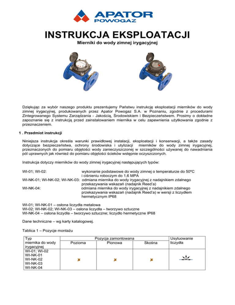 INSTRUKCJA EKSPLOATACJI Mierniki do wody zimnej irygacyjnej Dziękując za wybór naszego produktu prezentujemy Państwu instrukcję eksploatacji mierników do wody zimnej irygacyjnej, produkowanych przez Apator Powogaz S.A. w Poznaniu, zgodnie z procedurami Zintegrowanego Systemu Zarządzania - Jakością, Środowiskiem i Bezpieczeństwem. Prosimy o dokładne zapoznanie się z instrukcją przed zainstalowaniem miernika w celu zapewnienia użytkowania zgodnie z przeznaczeniem. 1 . Przedmiot instrukcji Niniejsza instrukcja określa warunki prawidłowej instalacji, eksploatacji i konserwacji, a także zasady dotyczące bezpieczeństwa, ochrony środowiska i utylizacji mierników do wody zimnej irygacyjnej, przeznaczonych do pomiaru objętości wody zanieczyszczonej w szczególności używanej do nawadniania pól uprawnych jak również do pomiaru objętości ścieków wstępnie oczyszczonych. Instrukcja dotyczy mierników do wody zimnej irygacyjnej następujących typów: WI-01; WI-02: wykonanie podstawowe do wody zimnej o temperaturze do 50ºC i ciśnieniu roboczym do 1,6 MPA WI-NK-01; WI-NK-02; WI-NK-03: odmiana miernika do wody irygacyjnej z nadajnikiem zdalnego przekazywania wskazań (nadajnik Reed’a) WI-NK-04: odmiana miernika do wody irygacyjnej z nadajnikiem zdalnego przekazywania wskazań (nadajnik Reed’a) w wersji z liczydłem hermetycznym IP68 WI-01; WI-NK-01 – osłona liczydła metalowa WI-02; WI-NK-02; WI-NK-03 – osłona liczydła – tworzywo sztuczne WI-NK-04 – osłona liczydła – tworzywo sztuczne; liczydło hermetyczne IP68 Dane techniczne – wg karty katalogowej. Tablica 1 – Pozycje montażu Typ miernika do wody irygacyjnej WI-01; WI-02 WI-NK-01 WI-NK-02 WI-NK-03 WI-NK-04 Pozioma Pozycja zamontowana Pionowa Skośna Usytuowanie liczydła Przykładowe oznaczenie miernika do wody irygacyjnej: typ średnica nominalna odmiana konstrukcyjna WI 50 - 01 2. Dobór właściwej wielkości miernika do wody irygacyjnej. Za kryterium doboru właściwej wielkości (średnicy nominalnej) miernika do wody irygacyjnej powinny służyć zawsze warunki pracy miernika, tj. przeciętna oraz maksymalna wartość strumienia objętości wody przepływającej w przewodzie, do którego miernik do wody irygacyjnej ma być podłączony, a nie jego średnica. Zbyt duży miernik do wody irygacyjnej dla danych warunków, nie tylko zwiększy koszt inwestycji, ale wskazuje z mniejszą dokładnością wskazań w okresach małego przepływu wody. Dobór zbyt małego miernika do wody irygacyjnej jest powodem jego przeciążenia i tym samym przedwczesnego zużycia jego części czynnych. Stąd aby zainstalowany miernik do wody irygacyjnej pracował właściwie w granicach jego zakresu pomiarowego i dopuszczalnych błędów wskazań, należy wnikliwie ustalić zakres jego pracy w ciągu doby, względnie zakres ten należy ustalić w oparciu o miesięczne zużycie wody przy uwzględnieniu dorywczych maksymalnych wartości strumienia objętości. Dopuszczalne obciążenia mierników do wody irygacyjnej podane są w tablicy 2: Tablica 2 Typ Maksymalny Dopuszczalne (wielkość roboczy strumień obciążenie miernika do objętości miesięczne wody irygacyjnej) DN [mm] m3/h m3/m-c 40 25 10800 50 30 12960 65 50 21600 80 80 34400 100 125 54000 125 175 75600 150 250 108000 200 450 194000 250 700 302000 3. Warunki prawidłowego wbudowania miernika do wody irygacyjnej. 3.1 Miejsce wbudowania miernika do wody irygacyjnej powinno być łatwo dostępne do montażu, demontażu i obsługi, wygodne dla odczytu, chronione przed mrozem. 3.2 Przed i za miernikiem do wody irygacyjnej należy przewidzieć zamontowanie zaworów celem odcięcia dopływu wody w przypadku konieczności wymontowania miernika do wody irygacyjnej względnie jego wstawki pomiarowej dla dokonania przeglądu lub naprawy. 3.3 Przewód w miejscu wbudowania powinien być tak ukształtowany, aby nie było możliwości tworzenia się w obrębie miernika do wody irygacyjnej poduszki powietrznej . Miernik do wody irygacyjnej musi być całkowicie wypełniony wodą, stąd przewód wodociągowy za miernikiem do wody irygacyjnej nie może się obniżać (Rys. 1) . Miernik do wody irygacyjnej Rys.1 Zabudowa miernika 3.4 Dla zabezpieczenia przed ujemnym wpływem odkształceń strumienia wody (zaburzeń przepływu) wywołanych przez kolana, zawory i inne elementy instalacji wskazane jest stosowanie przed miernikiem do wody irygacyjnej (na dopływie) prostego odcinka przewodu o długości L=5DN (średnic nominalnych miernika do wody irygacyjnej). W przypadku wbudowania miernika do wody irygacyjnej za podwójnym kolanem, zaworem zwrotnym lub pompą należy wyżej podaną długość odcinka prostego podwoić: 2L , a w przypadku pompy tłokowej nawet potroić: 3L. Chcąc uniknąć tak długiej prostki można wbudować kierownicę strumienia przed miernikiem do wody irygacyjnej. Za miernikiem do wody irygacyjnej długość odcinka prostego powinna wynosić: L1 = 3DN. 3.5 Przy wbudowaniu miernika do wody irygacyjnej wszelkiego rodzaju połączenia należy wykonać starannie. Uszczelki powinny być zakładane koncentrycznie do przewodu. Niedopuszczalne jest mimośrodowe osadzenie miernika do wody irygacyjnej w przewodzie, a w szczególności przesunięcie uszczelek między miernikiem do wody irygacyjnej a przewodem w taki sposób, żeby zajmowały część przekroju rurociągu i zaburzały w ten sposób przepływ. 3.6 Przepływ wody przez miernik do wody irygacyjnej powinien być zgodny z kierunkiem strzałek umieszczonych po obu stronach jego osłony. Zamontowane przed i za miernikiem do wody irygacyjnej zasuwy w czasie przepływu wody powinny być całkowicie otwarte. 3.7 Przy oddawaniu do eksploatacji nowych instalacji wodociągowych oraz w przypadku dokonywania naprawy rurociągów przed zamontowaniem miernika do wody irygacyjnej należy ten rurociąg dokładnie przepłukać w celu oczyszczenia jego wnętrza z zanieczyszczeń mogących spowodować uszkodzenie