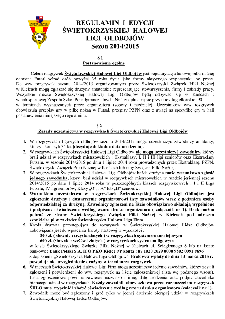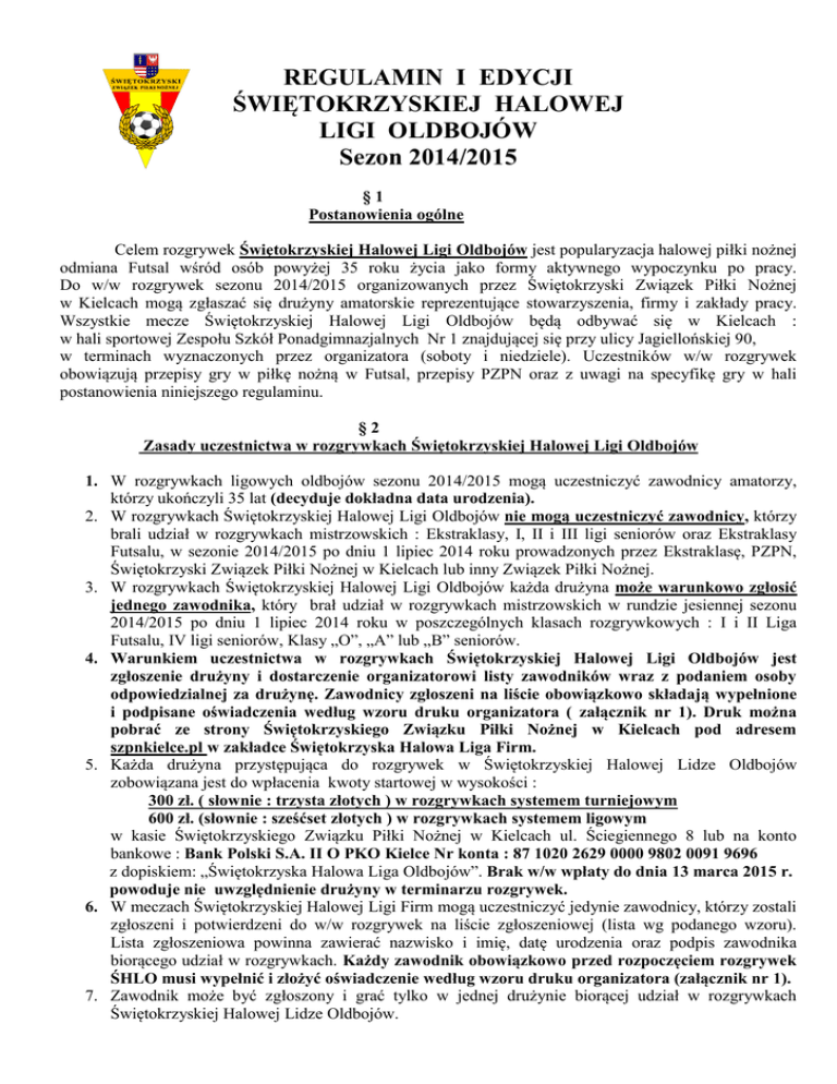 REGULAMIN I EDYCJI ŚWIĘTOKRZYSKIEJ HALOWEJ LIGI OLDBOJÓW Sezon 2014/2015 §1 Postanowienia ogólne Celem rozgrywek Świętokrzyskiej Halowej Ligi Oldbojów jest popularyzacja halowej piłki nożnej odmiana Futsal wśród osób powyżej 35 roku życia jako formy aktywnego wypoczynku po pracy. Do w/w rozgrywek sezonu 2014/2015 organizowanych przez Świętokrzyski Związek Piłki Nożnej w Kielcach mogą zgłaszać się drużyny amatorskie reprezentujące stowarzyszenia, firmy i zakłady pracy. Wszystkie mecze Świętokrzyskiej Halowej Ligi Oldbojów będą odbywać się w Kielcach : w hali sportowej Zespołu Szkół Ponadgimnazjalnych Nr 1 znajdującej się przy ulicy Jagiellońskiej 90, w terminach wyznaczonych przez organizatora (soboty i niedziele). Uczestników w/w rozgrywek obowiązują przepisy gry w piłkę nożną w Futsal, przepisy PZPN oraz z uwagi na specyfikę gry w hali postanowienia niniejszego regulaminu. §2 Zasady uczestnictwa w rozgrywkach Świętokrzyskiej Halowej Ligi Oldbojów 1. W rozgrywkach ligowych oldbojów sezonu 2014/2015 mogą uczestniczyć zawodnicy amatorzy, którzy ukończyli 35 lat (decyduje dokładna data urodzenia). 2. W rozgrywkach Świętokrzyskiej Halowej Ligi Oldbojów nie mogą uczestniczyć zawodnicy, którzy brali udział w rozgrywkach mistrzowskich : Ekstraklasy, I, II i III ligi seniorów oraz Ekstraklasy Futsalu, w sezonie 2014/2015 po dniu 1 lipiec 2014 roku prowadzonych przez Ekstraklasę, PZPN, Świętokrzyski Związek Piłki Nożnej w Kielcach lub inny Związek Piłki Nożnej. 3. W rozgrywkach Świętokrzyskiej Halowej Ligi Oldbojów każda drużyna może warunkowo zgłosić jednego zawodnika, który brał udział w rozgrywkach mistrzowskich w rundzie jesiennej sezonu 2014/2015 po dniu 1 lipiec 2014 roku w poszczególnych klasach rozgrywkowych : I i II Liga Futsalu, IV ligi seniorów, Klasy „O”, „A” lub „B” seniorów. 4. Warunkiem uczestnictwa w rozgrywkach Świętokrzyskiej Halowej Ligi Oldbojów jest zgłoszenie drużyny i dostarczenie organizatorowi listy zawodników wraz z podaniem osoby odpowiedzialnej za drużynę. Zawodnicy zgłoszeni na liście obowiązkowo składają wypełnione i podpisane oświadczenia według wzoru druku organizatora ( załącznik nr 1). Druk można pobrać ze strony Świętokrzyskiego Związku Piłki Nożnej w Kielcach pod adresem szpnkielce.pl w zakładce Świętokrzyska Halowa Liga Firm. 5. Każda drużyna przystępująca do rozgrywek w Świętokrzyskiej Halowej Lidze Oldbojów zobowiązana jest do wpłacenia kwoty startowej w wysokości : 300 zł. ( słownie : trzysta złotych ) w rozgrywkach systemem turniejowym 600 zł. (słownie : sześćset złotych ) w rozgrywkach systemem ligowym w kasie Świętokrzyskiego Związku Piłki Nożnej w Kielcach ul. Ściegiennego 8 lub na konto bankowe : Bank Polski S.A. II O PKO Kielce Nr konta : 87 1020 2629 0000 9802 0091 9696 z dopiskiem: „Świętokrzyska Halowa Liga Oldbojów”. Brak w/w wpłaty do dnia 13 marca 2015 r. powoduje nie uwzględnienie drużyny w terminarzu rozgrywek. 6. W meczach Świętokrzyskiej Halowej Ligi Firm mogą uczestniczyć jedynie zawodnicy, którzy zostali zgłoszeni i potwierdzeni do w/w rozgrywek na liście zgłoszeniowej (lista wg podanego wzoru). Lista zgłoszeniowa powinna zawierać nazwisko i imię, datę urodzenia oraz podpis zawodnika biorącego udział w rozgrywkach. Każdy zawodnik obowiązkowo przed rozpoczęciem rozgrywek ŚHLO musi wypełnić i złożyć oświadczenie według wzoru druku organizatora (załącznik nr 1). 7. Zawodnik może być zgłoszony i grać tylko w jednej drużynie biorącej udział w rozgrywkach Świętokrzyskiej Halowej Lidze Oldbojów. 8. Drużyny przystępujące do gry powinny posiadać jednolite stroje (koszulki z numerami) oraz obuwie do gry w hali. Zaleca się żeby każdy zawodnik grał w czasie całych rozgrywek ŚHLO z tym samym numerem na koszulce. 9. Każdy zawodnik przystępujący do meczu musi posiadać dokument tożsamości (dowód osobisty, prawo jazdy lub inny ważny dokument ze zdjęciem). 10. Mecze Świętokrzyskiej Halowej Ligi Oldbojów odbywają się według terminarza opracowanego przez organizatorów. Terminarz jest dostępny na stronie internetowej Świętokrzyskiego Związku Piłki Nożnej pod adresem szpnkielce.pl w zakładce Świętokrzyska Halowa Liga Firm. 11. Terminy i godziny meczów wyznaczone przez organizatorów i podane do wiadomości są ostateczne. O braku możliwości rozgrywania meczu w wyznaczonym terminie kierownik drużyny pisemnie powiadamia organizatorów ligi najpóźniej na 14 dni przed planowanym terminem rozgrywek. Powyższe pismo należy dostarczyć do siedziby Świętokrzyskiego Związku Piłki Nożnej wnosząc jednocześnie opłatę za zmianę terminu lub godziny zawodów w wysokości 50 zł. (słownie : pięćdziesiąt złotych). Przełożenie meczu jest możliwe za zgodą przeciwnika. Późniejsze zgłoszenia lub brak regulaminowej opłaty za zmianę terminu powoduje, że zmiana nie zostanie uwzględniona w terminarzu rozgrywek. §3 Najważniejsze przepisy gry w lidze halowej W rozgrywkach obowiązywać będą przepisy gry PZPN w piłkę nożną oraz z uwagi na specyfikę gry w hali postanowienia niniejszego regulaminu. 1.Zawody rozgrywane będą w hali na boisku do piłki ręcznej piłką halową dostarczoną przez organizatora. 2.Bramki o wymiarach 3m x 2m. 3.Mecze trwają 2x15 min. z przerwą 2 min. na zmianę połowy boiska. 4.W jednym meczu w danej drużynie może wystąpić max. 12 zawodników. 5.W grze bierze udział po 5 zawodników w tym bramkarz. 6.Najmniejsza ilość zawodników biorących udział w grze – trzech w tym bramkarz. 7.Zmiany zawodników są dozwolone w czasie meczu tylko i wyłącznie w strefie zmian. Za prawidłową zmianę uznaje się, gdy zawodnik biorący udział w grze opuści boisko a w jego miejsce wejdzie zawodnik rezerwowy. Dozwolona jest wielokrotna wymiana zawodników w jednym meczu ( zmiany hokejowe ). 