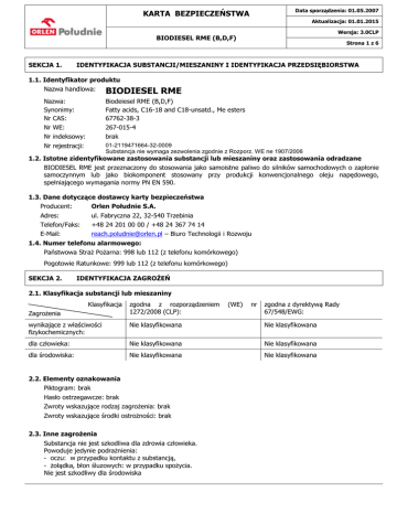 Data sporządzenia: 01.05.2007 KARTA BEZPIECZEŃSTWA Aktualizacja: 01.01.2015 Wersja: 3.0CLP BIODIESEL RME (B,D,F) SEKCJA 1. Strona 1 z 6 IDENTYFIKACJA SUBSTANCJI/MIESZANINY I IDENTYFIKACJA PRZEDSIĘBIORSTWA 1.1. Identyfikator produktu Nazwa handlowa: BIODIESEL RME Nazwa: Synonimy: Nr CAS: Biodeiesel RME (B,D,F) Fatty acids, C16-18 and C18-unsatd., Me esters 67762-38-3 Nr WE: 267-015-4 Nr indeksowy: brak Nr rejestracji: 01-2119471664-32-0009 Substancja nie wymaga zezwolenia zgodnie z Rozporz. WE ne 1907/2006 1.2. Istotne zidentyfikowane zastosowania substancji lub mieszaniny oraz zastosowania odradzane BIODIESEL RME jest przeznaczony do stosowania jako samoistne paliwo do silników samochodowych o zapłonie samoczynnym lub jako biokomponent stosowany przy produkcji konwencjonalnego oleju napędowego, spełniającego wymagania normy PN EN 590. 1.3. Dane dotyczące dostawcy karty bezpieczeństwa Producent: Orlen Południe S.A. Adres: ul. Fabryczna 22, 32-540 Trzebinia Telefon/Faks: +48 24 201 00 00 / +48 24 367 74 14 E-Mail: [email protected] – Biuro Technologii i Rozwoju 1.4. Numer telefonu alarmowego: Państwowa Straż Pożarna: 998 lub 112 (z telefonu komórkowego) Pogotowie Ratunkowe: 999 lub 112 (z telefonu komórkowego) SEKCJA 2. IDENTYFIKACJA ZAGROŻEŃ 2.1. Klasyfikacja substancji lub mieszaniny Klasyfikacja Zagrożenia zgodna z rozporządzeniem 1272/2008 (CLP): (WE) nr zgodna z dyrektywą Rady 67/548/EWG: wynikające z właściwości fizykochemicznych: Nie klasyfikowana Nie klasyfikowana dla człowieka: Nie klasyfikowana Nie klasyfikowana dla środowiska: Nie klasyfikowana Nie klasyfikowana 2.2. Elementy oznakowania Piktogram: brak Hasło ostrzegawcze: brak Zwroty wskazujące rodzaj zagrożenia: brak Zwroty wskazujące środki ostrożności: brak 2.3. Inne zagrożenia Substancja nie jest szkodliwa dla zdrowia człowieka. Powoduje jedynie podrażnienia: - oczu: w przypadku kontaktu z substancją, - żołądka, błon śluzowych: w przypadku spożycia. Nie jest szkodliwy dla środowiska KARTA BEZPIECZEŃSTWA Data sporządzenia: 01.05.2007 Aktualizacja: 01.01.2015 Wersja: 3.0CLP BIODIESEL RME (B,D,F) SEKCJA 3. Strona 2 z 6 SKŁAD/INFORMACJA O SKŁADNIKACH 3.1. Substancje Nazwa substancji Wzór % wagowy Nr CAS Nr WE Nr indeksowy Fatty acids, C16-18 and C18-unsatd., Me esters Nie dotyczy min. 80 67762-38-3 267-015-4 brak Charakterystyka chemiczna: Mieszanina estrów metylowych wyższych kwasów tłuszczowych, charakterystycznych dla oleju rzepakowego. Składniki niebezpieczne. Substancja spełniająca wymagania normy PN EN 14214 nie zawiera składników klasyfikowanych jako substancje niebezpieczne. 3.2. Mieszaniny Nie dotyczy – produkt jest substancją. SEKCJA 4. ŚRODKI PIERWSZEJ POMOCY 4.1. Opis środków pierwszej pomocy Wdychanie: Brak szczególnych sposobów działania Kontakt ze skórą: Zdjąć zanieczyszczoną odzież i buty, zmyć skórę dużą ilością mydła i wody Kontakt z oczami: Przemywać oczy bieżącą wodą przez 10-15 minut przy otwartej powiece. Jeśli po tym ból nie ustanie, wezwać lekarza Połknięcie: Nie wywoływać wymiotów, przepłukać usta wodą, jeśli osoba jest przytomna dać do wypicia 0,5 litra wody; w przypadku złego samopoczucia wezwać lekarza 4.2. Najważniejsze ostre i opóźnione objawy oraz skutki narażenia Brak 4.3. Wskazania dotyczące wszelkiej natychmiastowej pomocy lekarskiej i szczególnego postępowania z poszkodowanym Brak SEKCJA 5. POSTĘPOWANIE W PRZYPADKU POŻARU Substancja palna. W przypadku pożaru istnieje możliwość powstania niebezpiecznych gazów pożarowych lub oparów. Zalecenia ogólne: Zawiadomić otoczenie o pożarze, usunąć z obszaru zagrożenia wszystkie osoby nie biorące udziału w likwidowaniu awarii, w razie potrzeby zarządzić ewakuację, wezwać ekipy ratownicze, Straż Pożarną. Należy wyeliminować źródła zapłonu – ugasić otwarty płomień. 5.1. Środki gaśnicze Odpowiednie środki gaśnicze: gaśnica śniegowa, gaśnica proszkowa, piany. Niewłaściwe środki gaśnicze: zwarte prądy wody. Uwaga: nie stosować wody. 5.2. Szczególne zagrożenia związane z substancją Przy spalaniu powstają toksyczne tlenki, tlenek węgla, dwutlenek węgla, przy niepełnym spalaniu sadza 5.3. Informacje dla straży pożarnej Udział w akcji ratowniczej wyłącznie osób przeszkolonych, wyposażonych w aparat oddechowy z niezależnym dopływem powietrza, odzież ochronną aby zapobiec kontaktu z oczami i skórą. KARTA BEZPIECZEŃSTWA Data sporządzenia: 01.05.2007 Aktualizacja: 01.01.2015 BIODIESEL RME (B,D,F) SEKCJA 6. Wersja: 3.0CLP Strona 3 z 6 POSTĘPOWIANIE W PRZYPADKU NIEZAMIERZONEGO UWOLNIENIA DO ŚRODOWISKA 6.1. Indywidualne środki ostrożności, wyposażenie ochronne i procedury w sytuacjach awaryjnych Wyeliminować wszystkie źródła zapłonu. Oddalić się od źródła niebezpieczeństwa, w kierunku pod wiatr. 6.2. Środki ostrożności w zakresie ochrony środowiska Nie dopuścić do przedostania się substancji w większych ilościach do wody gruntowej lub kanalizacji bez rozcieńczenia, wyciek obwałować i zebrać. 6.3. Metody i materiały zapobiegające rozprzestrzenianiu się skażenia i służące do usuwania skażenia Ograniczyć rozprzestrzenianie się wycieku przez obwałowanie terenu; zebraną ciecz odpompować. Małe ilości rozlanej substancji przysypać niepalnym materiałem chłonnym np. suchą ziemią, piaskiem lub trocinami, zebrać zanieczyszczone sorbenty. 6.4. Odniesienia do innych sekcji Odnieść się również do sekcji 8 i 13 karty bezpieczeństwa. SEKCJA 7. POSTĘPOWANIE Z SUBSTANCJAMI I MIESZANINAMI ORAZ ICH MAGAZYNOWANIE 7.1. Środki ostrożności dotyczące bezpiecznego postępowania Podejmowanie szczególnych działań nie jest konieczne: BIODIESEL RME nie jest substancją trującą. Należy unikać bezpośredniego kontaktu z substancją. 7.2. Warunki bezpiecznego magazynowania, łącznie z informacjami dotyczącymi wszelkich wzajemnych niezgodności Przechowywa