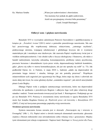 „Wiara jest uzdrowieniem i zbawieniem. Ks. Mariusz Sztaba Nie możemy być jednak do głębi uzdrowieni, Jeżeli nie przyjmujemy również bólu przemiany” ( kard. Joseph Ratzinger) Odkryć sens i piękno nawrócenia Benedykt XVI w wywiadzie udzielonym Peterowi Seewaldowi i opublikowanemu w książce pt. „Światłość świata”(2011) mówi o potrzebie prawdziwego nawrócenia. Ma ono być przeciwwagą dla współczesnej doktryny relatywizmu, „zatrutego myślenia”, praktycznego ateizmu, wojującej sekularyzacji i globalnego kryzysu tak w wymiarze materialnym jak i moralnym oraz duchowym. Jak zauważa Papież współczesny świat jest w wielkim niebezpieczeństwie. I nie chodzi tylko o kryzys ekologiczny i finansowy, ale także o handel narkotykami, turystykę seksualną, konsumpcjonizm, problemy natury psychicznej, poczucie bezsensu i absurdalności życia przez wielu, depersonalizację ludzkich kontaktów, gdyż „pływa się tylko w morzu komunikacyjnym, ale już nie spotyka się osób” (s. 73). Jak podkreślał Ojciec św. w Fatimie, w maju 2010 r., ludziom „udało się doprowadzić do powstania kręgu śmierci i strachu, którego już nie potrafią przerwać”. Wspólnym mianownikiem tych zagrożeń jest egzystencja bez Boga, która staje się chora i człowiek nie może dalej tak trwać, bo coraz głośniej słychać „szatańskie requiem”, jak mówił amerykański pisarz Louis Begley. Dlatego Papież woła o podjęcie autentycznego nawrócenia, które ma doprowadzić człowieka do spotkania z prawdziwym Bogiem i odkrycia Jego woli jako właściwej drogi ratunku i nadziei. Temat nawrócenia towarzyszył już kard. J. Ratzingerowi. Podejmuje go raz po raz Benedykt XVI. Pomocą w zrozumieniu istoty nawrócenia w ujęciu Benedykta XVI może być książka Bogdana Giemzy pt. Wędrówki przez rok kościelny z Benedyktem XVI (2007). Z niej też korzystam prezentując papieską wizję nawrócenia. Struktura procesu nawrócenia Synteza nauczania Jezusa zawarta jest w słowach: „Nawracajcie się i wierzcie w Ewangelię” (Mk 1, 15). Papież mówi o dwóch istotnych elementach nawrócenia: głoszenie orędzia o Bożym miłosierdzi oraz uświadomienie sobie własnej winy i grzeszności. Między tymi elementami jest relacja wzajemności. Napisze kard. Ratzinger w Nowej pieśni dla Pana, 1 że „bez spojrzenia Zbawiciela, który zmywa winę nie słowami, lecz własnym cierpieniem, nie może człowiek znieść prawdę własnej winy, z której wynikają wszystkie dalsze nieprawdy, a w końcu generalna niezdolność do dostrzegania prawdy. I odwrotnie: nie mając odwagi spojrzenia w prawdzie na siebie, nie można poznać Zbawiciela i uwierzyć Mu” (s. 231). Proces nawrócenia ma więc ścisły związek ze Słowem Bożym i sakramentem pokuty. Polega on na szukaniu nowego stylu mylenia i działania, a więc nowego stylu życia w oparciu o Boże światło. Istota procesu nawracania się W przemówieniu do katechetów i nauczycieli z racji Wielkiego Jubileuszu Roku 2000, kard. Ratzinger wyjaśniał sens nawrócenia ucząc: „Greckie słowo odpowiadającemu naszemu «nawróć się» znaczy przemyśleć, poddać rewizji życie indywidualne i społeczne; pozwolić Bogu wniknąć w zasady rządzące życiem; w osadach nie kierować się już rozpowszechnionymi opiniami. Nawrócić się znaczy zatem: nie żyć tak jak wszyscy, nie postępować tak jak wszyscy, nie usprawiedliwiać własnych dwuznacznych albo niegodziwych działań tym, że inni postępują tak samo; zacząć patrzeć na własne życia oczyma Boga; a zatem szukać dobra, nawet jeśli jest to niewygodne; nie opierać się na osadzie wielu, na osadzie ludzkim, ale na osadzie Bożym. Innymi słowy: szukać nowego stylu życia nowego życia (...) uwolnić się od samowystarczalności, dostrzec i pogodzić się z tym, że potrzebujemy innych i Innego, Jego przebaczenia i przyjaźni. Życie nienawrócone to samousprawiedliwienie się (nie jestem gorszy niż inni); nawrócenie to pokorne zawierzenie się miłości Innego, która staje się miara i kryterium mojego własnego życia” (s. 69-70). Autentyczne nawrócenie wiąże się wiec z otwarciem na Boże miłosierdzie, uznaniem własnej winy oraz swoich ludzkich ograniczeń, wbrew podszeptom i pokusom współczesnego świata i ojca kłamstwa – diabła. W związku z tym stwierdzeniem kard. Ratzinger napisze w Soli ziemi, że „wychowanie rodu ludzkiego, które potrafi oprzeć się pokusie drzewa zakazanego, bez wątpienia jest tu fundamentalna sprawa” (s. 197). Nawrócenie jest aktem posłuszeństwa wobec Boga i pójściem za Nim z całą prostotą i ufnością. Nawrócenie jak podkreśla Papież jest bolesnym procesem przemiany. Indywidualny i społeczny wymiar nawrócenia Nawrócenie ma osobisty oraz społeczny i eklezjalny wymiar. Doświadczenie uczy, że wiele dobrych i szlachetnych zrywów i nawróceń pojedynczych osób zostało zmarnowanych, bo zabrakło właściwego klimatu społecznego dla ich pielęgnacji. We wspomnianym już przemówieniu do katechetów i nauczycieli, kard. Ratzinger uczył: „to prawda, że nawrócenie jest przede wszystkim aktem w najwyższej mierze osobowym, jest personalizacja. Oto 2 wyrzekam się formuły «żyć jak inni» (nie czuję się już usprawiedliwiony tym, ze wszyscy postępują tak samo jak ja), ale znajduje przed obliczem Boga moje własne «ja», moja osobista odpowiedzialność. Jednakże prawdziwa personalizacja jest też zawsze nowa i głębsza socjalizacja. «Ja znów otwiera się na całą głębie «TY» i w ten sposób powstaje nowe «MY». Jeśli styl życia rozpowszechniony dzisiaj w świecie rodzi niebezpieczeństwo depersonalizacji, czyli życia nie własnym życiem, ale życiem innych, nawrócenie powinno prowadzić do powstania nowego «MY», to znaczy do wejścia na wspólną drogę z Bogiem. Wzywając do nawrócenia, musimy także umożliwić nawróconym wejście do wspólnoty życia, do wspólnej przest