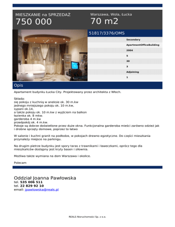 MIESZKANIE na SPRZEDAŻ 750 000 Warszawa, Wola, Łucka 70 m2 51817/3376/OMS Secondary ApartmentOfficeBuilding 2004 5 30 3 Adjoining 1 Opis Apartament budynku Łucka City. Projektowany przez architekta z Włoch. Składa: się pokoju z kuchnią w aneksie ok. 30 m.kw jednego mniejszego pokoju ok. 10 m.kw, sypani ok.14, a także pokoju ok. 10 m.kw z wyjściem na balkon łazienka ok. 8 mkw. garderoba 4 m.kw przedpokój ok. 4 m.kw. Pokoje są dobrze doświetlone przez duże okna. Funkcjonalna garderoba mieści zarówno odzież jak i drobne sprzęty domowe, poprzez to łatwo W salonie i kuchni granit na podłodze, w pokojach drewno egzotyczne. Do części mieszkania przynależy miejsce na parkingu. Na drugim pietrze budynku jest spory taras z trawnikami i ławeczkami, oprócz tego dla mieszkańców dostępny jest kryty basen i siłownia. Możliwa także wymiana na dom Warszawa i okolice. Polecam Oddział Joanna Pawłowska tel. 535 006 511 tel. 22 829 92 10 email: [email protected] REALS Nieruchomości Sp. z o.o. Powered by TCPDF (www.tcpdf.org)
