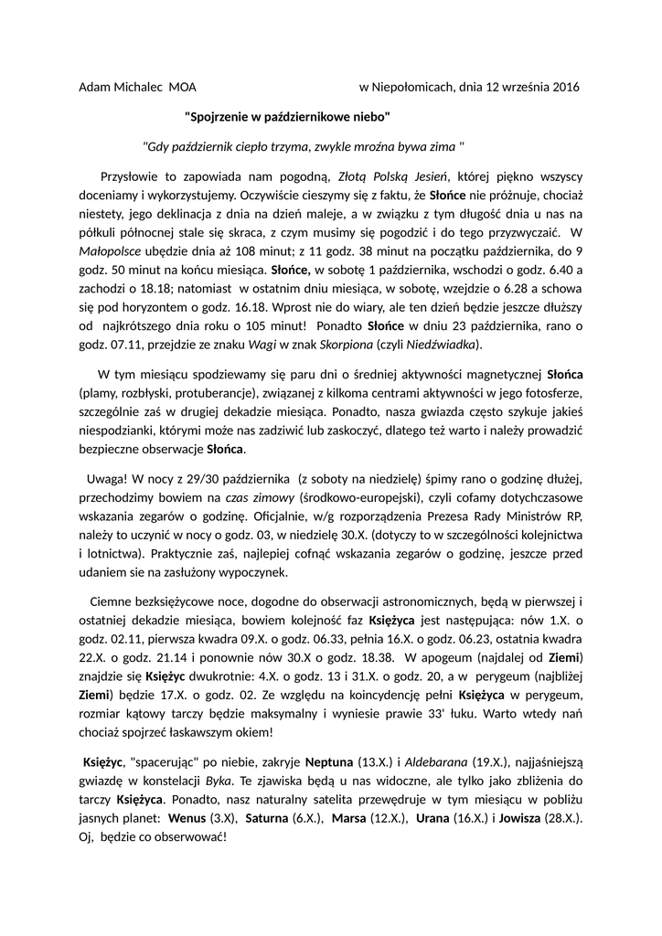 Adam Michalec MOA w Niepołomicach, dnia 12 września 2016 "Spojrzenie w październikowe niebo" "Gdy październik ciepło trzyma, zwykle mroźna bywa zima " Przysłowie to zapowiada nam pogodną, Złotą Polską Jesień, której piękno wszyscy doceniamy i wykorzystujemy. Oczywiście cieszymy się z faktu, że Słońce nie próżnuje, chociaż niestety, jego deklinacja z dnia na dzień maleje, a w związku z tym długość dnia u nas na półkuli północnej stale się skraca, z czym musimy się pogodzić i do tego przyzwyczaić. W Małopolsce ubędzie dnia aż 108 minut; z 11 godz. 38 minut na początku października, do 9 godz. 50 minut na końcu miesiąca. Słońce, w sobotę 1 października, wschodzi o godz. 6.40 a zachodzi o 18.18; natomiast w ostatnim dniu miesiąca, w sobotę, wzejdzie o 6.28 a schowa się pod horyzontem o godz. 16.18. Wprost nie do wiary, ale ten dzień będzie jeszcze dłuższy od najkrótszego dnia roku o 105 minut! Ponadto Słońce w dniu 23 października, rano o godz. 07.11, przejdzie ze znaku Wagi w znak Skorpiona (czyli Niedźwiadka). W tym miesiącu spodziewamy się paru dni o średniej aktywności magnetycznej Słońca (plamy, rozbłyski, protuberancje), związanej z kilkoma centrami aktywności w jego fotosferze, szczególnie zaś w drugiej dekadzie miesiąca. Ponadto, nasza gwiazda często szykuje jakieś niespodzianki, którymi może nas zadziwić lub zaskoczyć, dlatego też warto i należy prowadzić bezpieczne obserwacje Słońca. Uwaga! W nocy z 29/30 października (z soboty na niedzielę) śpimy rano o godzinę dłużej, przechodzimy bowiem na czas zimowy (środkowo-europejski), czyli cofamy dotychczasowe wskazania zegarów o godzinę. Oficjalnie, w/g rozporządzenia Prezesa Rady Ministrów RP, należy to uczynić w nocy o godz. 03, w niedzielę 30.X. (dotyczy to w szczególności kolejnictwa i lotnictwa). Praktycznie zaś, najlepiej cofnąć wskazania zegarów o godzinę, jeszcze przed udaniem sie na zasłużony wypoczynek. Ciemne bezksiężycowe noce, dogodne do obserwacji astronomicznych, będą w pierwszej i ostatniej dekadzie miesiąca, bowiem kolejność faz Księżyca jest następująca: nów 1.X. o godz. 02.11, pierwsza kwadra 09.X. o godz. 06.33, pełnia 16.X. o godz. 06.23, ostatnia kwadra 22.X. o godz. 21.14 i ponownie nów 30.X o godz. 18.38. W apogeum (najdalej od Ziemi) znajdzie się Księżyc dwukrotnie: 4.X. o godz. 13 i 31.X. o godz. 20, a w perygeum (najbliżej Ziemi) będzie 17.X. o godz. 02. Ze względu na koincydencję pełni Księżyca w perygeum, rozmiar kątowy tarczy będzie maksymalny i wyniesie prawie 33' łuku. Warto wtedy nań chociaż spojrzeć łaskawszym okiem! Księżyc, "spacerując" po niebie, zakryje Neptuna (13.X.) i Aldebarana (19.X.), najjaśniejszą gwiazdę w konstelacji Byka. Te zjawiska będą u nas widoczne, ale tylko jako zbliżenia do tarczy Księżyca. Ponadto, nasz naturalny satelita przewędruje w tym miesiącu w pobliżu jasnych planet: Wenus (3.X), Saturna (6.X.), Marsa (12.X.), Urana (16.X.) i Jowisza (28.X.). Oj, będzie co obserwować! Na naszym jesiennym niebie, z wieczora, dostrzeżemy w kolejności gwiazdozbiory: Pegaza, Andromedy, Perseusza, Byka, a po północy pojawią sie nam konstelacje Bliźniąt i Oriona. Jeśli zaś chodzi o planety, to Merkurego i Jowisza można i należy ich szukać przed świtem na wschodnim niebie z tym, że Merkurego zobaczymy tam tylko w pierwszym tygodniu miesiąca, a Jowisza dopiero w drugiej połowie października. Natomiast na wieczornym niebie znajdziemy w kolejności coraz to niżej: Marsa, Saturna i Wenus. Szczególnie polecam niezwykle widowiskowe obserwacje zbliżeń jasnych planet Wenus i Saturna (30.X.). Uran przebywa w gwiazdozbiorze Ryb, a ponieważ 15.X. będzie w opozycji do Słońca, zatem możemy go obserwować przez całą noc. Natomiast Neptun przebywa w gwiazdozbiorze Wodnika i widoczny jest przez teleskop na wieczornym niebie. Aby móc wieczorem zaobserwować nie tylko Marsa, Saturna z pierścieniami, czy Wenus, ale również nasz poczciwy Księżyc, najlepiej będzie złożyć wizytę w Młodzieżowym Obserwatorium Astronomicznym w Niepołomicach, przy ul. Mikołaja Kopernika 2 (tel. 12281-15-61). W razie pochmurnego nieba, polecam tamże planetarium, zgodnie z wywieszonym harmonogramem. W dniach 21-23.X. MOA organizuje IX Międzynarodową Konferencję "Nauczanie astronomii w XXI wieku". Obrady i dyskusje będą się toczyć w Zamku Królewskim. Serdecznie zapraszamy zainteresowane osoby - wstęp wolny. Już od 2 października do 7 listopada promieniują szybkie meteory z roju Orionidów, które wchodzą w górne warstwy atmosfery ziemskiej z prędkościami nieco ponad 60 km/sek. Maksimum roju przypada na 21.X., możemy wtedy oczekiwać 25-30 "spadających gwiazd" na godzinę. Radiant meteorów leży na granicy gwiazdozbiorów Oriona i Bliźniąt (południowowschodnia część nieba). Warunki ich obserwacji będą w tym roku łatwe, ponieważ Księżyc w ostatniej kwadrze nie będzie, z wieczora, przeszkadzał w obserwacjach. Natomiast od 6 do 10 października (maksimum 8.X.), promieniują powolne meteory z roju Drakonid, czyli ich radiant leży w gwiazdozbiorze Smoka. Warunki do ich wieczornych obserwacji nie będą łatwe, bo Księżyc będzie w pierwszej kwadrze. Dla wzbudzenia nie tylko obserwacyjnych refleksji, odwołam się do sprawdzonego po wielokroć w praktyce przysłowia: " Gdy Jesień zamglona, zima zaśnieżona"