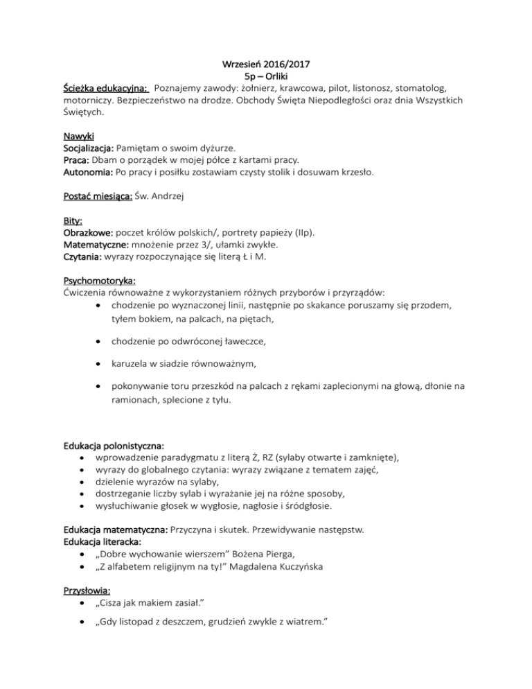 Wrzesień 2016/2017 5p – Orliki Ścieżka edukacyjna: Poznajemy zawody: żołnierz, krawcowa, pilot, listonosz, stomatolog, motorniczy. Bezpieczeństwo na drodze. Obchody Święta Niepodległości oraz dnia Wszystkich Świętych. Nawyki Socjalizacja: Pamiętam o swoim dyżurze. Praca: Dbam o porządek w mojej półce z kartami pracy. Autonomia: Po pracy i posiłku zostawiam czysty stolik i dosuwam krzesło. Postać miesiąca: Św. Andrzej Bity: Obrazkowe: poczet królów polskich/, portrety papieży (IIp). Matematyczne: mnożenie przez 3/, ułamki zwykłe. Czytania: wyrazy rozpoczynające się literą Ł i M. Psychomotoryka: Ćwiczenia równoważne z wykorzystaniem różnych przyborów i przyrządów: chodzenie po wyznaczonej linii, następnie po skakance poruszamy się przodem, tyłem bokiem, na palcach, na piętach, chodzenie po odwróconej ławeczce, karuzela w siadzie równoważnym, pokonywanie toru przeszkód na palcach z rękami zaplecionymi na głową, dłonie na ramionach, splecione z tyłu. Edukacja polonistyczna: wprowadzenie paradygmatu z literą Ż, RZ (sylaby otwarte i zamknięte), wyrazy do globalnego czytania: wyrazy związane z tematem zajęć, dzielenie wyrazów na sylaby, dostrzeganie liczby sylab i wyrażanie jej na różne sposoby, wysłuchiwanie głosek w wygłosie, nagłosie i śródgłosie. Edukacja matematyczna: Przyczyna i skutek. Przewidywanie następstw. Edukacja literacka: „Dobre wychowanie wierszem” Bożena Pierga, „Z alfabetem religijnym na ty!” Magdalena Kuczyńska Przysłowia: „Cisza jak makiem zasiał.” „Gdy listopad z deszczem, grudzień zwykle z wiatrem.” Zagadki: Przynoszę deszcze, szarugi, dzień krótki, a wieczór długi. Perkoza wysyłam za morza i jeża usypiam w borze. Jakim jestem miesiącem? (listopad) Nie jest kotem, a bez strachu po spadzistym chodzi dachu. Czarne ręce ma i twarz i ty go na pewno znasz.(kominiarz) Dosiada – nie konia, kieruje – nie lejcami. Na maszynie ciężkiej lata nad chmurami. (pilot) Za ladą sklepową waży to i owo: 5 dag cukierków dla Oli, dla mamy pół kilo soli. Czy klient mały czy duży, każdego uprzejmie obsłuży. (sprzedawczyni) Przywiózł z lasu drzewo, teraz pięknie piłą rżnie. A z gładziutkiej tej deseczki będzie stolik i półeczki. (stolarz) Kto pracuje w hełmie, pnie się po drabinie, kiedy syczy ogień i gdy woda płynie? (strażak) Z wielką torbą chodzi co dzień - przy pogodzie, niepogodzie. Czekaj go, gdy listu chcesz. Kto to jest - czy wiesz? (listonosz) Jaki zawód ma ten pan, co naprawia każdy kran? (hydraulik) Mam dwie dzielne pomocnice: cienką igłę i nożyce. One kroją, ona zszywa. Powiedz, jak ja się nazywam? (krawcowa) Gdy na skrzyżowaniu światła się zepsują w białych rękawiczkach ruchem aut kierują. (policjanci) Rób codziennie zębom mycie bo je masz na całe życie. Gdy się jakiś ząbek psuje on go ślicznie zaplombuje. Odwiedzaj go bez asysty, nigdy nie bój się… (dentysty). W kostiumiku czarno-białym w ZOO ją zobaczyć możesz. Przejść przez jezdnię krokiem śmiałym także ci pomoże. (przejście dla pieszych) Żółtym okiem daje znak „ uwaga”, gdy czerwone świeci „ stop - nie idź naprzeciw!” Zapali zielone „ Idź na drugą stronę”. (sygnalizator) Jest przy każdej jezdni po to, by chodzić po nim piechotą. (chodnik) Stoją przy drodze na jednej nodze wszystkim kierowcom ku przestrodze, obrazki na nich rozmaite kierowca czyta zamiast liter. (znaki drogowe) O jej niepodległość walczyły liczne wojska, to miejsce w którym mieszkamy, to nasza ojczyzna. (Polska) Zwie się Mazurek Dąbrowskiego, choć Wybicki jest autorem. Pieśnią jest państwa polskiego Polski trzecim jest symbolem. (hymn) Zadania logopedyczne: 1. Wyraźne powtarzanie tekstu: Drgawki kawki wśród trawki Kurkiem kranu kręci kruk, Kroplą tranu brudząc bruk. A przy kranie, robiąc pranie, Królik gra na fortepianie. 2. Ćwiczenia logopedyczne Naśladowanie balonika – wypuszczanie powietrza z jednoczesnym odgłosem „ sssss”. Chuchanie na zmarznięte ręce. Wiersze: Antoni Słonimski „Polska” I cóż powiedzą tomy słowników, Lekcje historii i geografii, Gdy tylko o niej mówić potrafi Krzak bzu kwitnący i śpiew słowików. Pytasz się, synu, gdzie jest i jaka? W niewymierzonej krainie leży. Jest w każdym wiernym sercu Polaka, Co o nią walczył, cierpiał i wierzył. Choć jej granice znajdziesz na mapach, Ale o treści, co je wypełnia, Powie ci tylko księżyca pełnia I mgła nad łąką, i liści zapach. W szumie gołębi na starym rynku, W książce poety i na budowie, W codziennej pracy, w życzliwym słowie, Znajdziesz ją w każdym dobrym uczynku. Jan Brzechwa „Katar” Spotkał katar Katarzynę - A - psik! A już rejent w michę kicha - A - psik! Katarzyna pod pierzynę - A - psik! Od rejenta poszło dalej - A - psik! Sprowadzono wnet doktora - A - psik! Bo się goście pokichali - A - psik! "Pani jest na katar chora" - A - psik! Od tych gości ich znów goście - A - psik! Terpentyną grzbiet jej natarł - A - psik! Że dudniło jak na moście - A - psik! A po chwili sam miał katar - A - psik! Przed godziną jedenastą - A - psik! Poszedł doktor do rejenta - A - psik! Już kichało całe miasto - A - psik! A to właśnie były święta - A - psik! Aż zabrakło terpentyny - A - psik! Stoi flaków pełna micha - A - psik! Z winy jednej Katarzyny - A - psik! Piosenka: „Wiatr psotnik”sł. A. Woy – Wojciechowska, muz. K. Kwiatkowska Wiatr zapukał w okno do dzieci: „Halo, hej! Starszaki, jak leci? Nie chce mi się biegać po polach, przyjdę do waszego przedszkola”. Nie! Nie! Nie! Ref.: „Wietrzyku psotniku, masz chmurki przegonić, utulić sarenki w lesie, kałuże osuszyć i liście posprzątać, bez ciebie cóż zrobi jesień!” Wiatr zapukał w okno leciutko: „Bez was, dzieci, trochę mi smutno. Nie chce mi się gwizdać i biegać, wolę z wami trochę pośpiewać…” „A ja chce rozkręcić zab