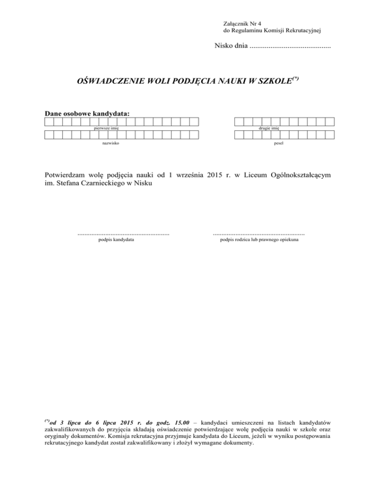 Załącznik Nr 4 do Regulaminu Komisji Rekrutacyjnej Nisko dnia ........................................... OŚWIADCZENIE WOLI PODJĘCIA NAUKI W SZKOLE(*) Dane osobowe kandydata: pierwsze imię nazwisko drugie imię pesel Potwierdzam wolę podjęcia nauki od 1 września 2015 r. w Liceum Ogólnokształcącym im. Stefana Czarnieckiego w Nisku ..................................................... podpis kandydata (*) ..................................................... podpis rodzica lub prawnego opiekuna od 3 lipca do 6 lipca 2015 r. do godz. 15.00 – kandydaci umieszczeni na listach kandydatów zakwalifikowanych do przyjęcia składają oświadczenie potwierdzające wolę podjęcia nauki w szkole oraz oryginały dokumentów. Komisja rekrutacyjna przyjmuje kandydata do Liceum, jeżeli w wyniku postępowania rekrutacyjnego kandydat został zakwalifikowany i złożył wymagane dokumenty.