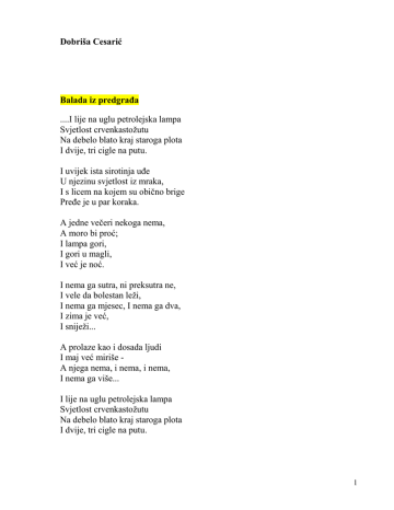 Dobriša Cesarić Balada iz predgraña ....I lije na uglu petrolejska lampa Svjetlost crvenkastožutu Na debelo blato kraj staroga plota I dvije, tri cigle na putu. I uvijek ista sirotinja uñe U njezinu svjetlost iz mraka, I s licem na kojem su obično brige Preñe je u par koraka. A jedne večeri nekoga nema, A moro bi proć; I lampa gori, I gori u magli, I već je noć. I nema ga sutra, ni preksutra ne, I vele da bolestan leži, I nema ga mjesec, I nema ga dva, I zima je već, I sniježi... A prolaze kao i dosada ljudi I maj već miriše A njega nema, i nema, i nema, I nema ga više... I lije na uglu petrolejska lampa Svjetlost crvenkastožutu Na debelo blato kraj staroga plota I dvije, tri cigle na putu. 1 Balada o Lazaru Onomu koji se digne iz groba Dugo je hljeb u ustima gorak. On tiho hoda izmeñu ljudi, I nesiguran sad mu je korak. Nerado njega sretaju ljudi. A koji ga — ruke mu stišćući — bodre Potajno traže na njegovom licu Pečate smrti sablasno modre. Skidoše s njega mrtvačko platno. Ali ne i s lica blijedoga sjenu. Bezdanu tugu on ù sebi nosi I svoju smrt nedòvršenu. Bez oproštaja Ne, ja se nisam oprostio s njom kad nestade na svoju stranu. Sam slušah svojih nada lom U jednom zabačenom restoranu. Kako je bilo? Nije teško reći! U žamoru oglasila se trublja, I vlak je krenuo obično i lijeno, Sa svime što još ljubljah. Da l' mišljaše da u tom gradu Ostavlja dušu njome bonu? Da l' iskahu me njene oči Pogledom čežnje po peronu? Daleko negdje juri sada vlak, Al što to moje srce kuca jače? Nije l' to možda nada, tajni znak, Da neko u daljini plače? Ah kakav plač! Uobraženje, san! 2 Te njene čežnje davno sve su Već ugašene. Ti si malko pjan, A stvari jesu - kakve jesu. Moguće zape koji svijetli tren Na svome letu u njezinoj duši, A i taj spomen past će kao list Minulog ljeta, što se suši. Breze na ulici Kraj bijelih breza svakog dana Ja proñem srca razdragana. (Oduvijek ima tajnih veza Izmeñu pjesnika i breza.) Od čega dršćete, vi breze? Od slatkih slutnja ili jeze? Zašto vam krošnja podrhtava I onda kada vjetar spava? Na ulicu, med svijet što viče, Ko da ste izašle iz priče. Nježne, treperave i čiste Baš kao prva ljubav vi ste! Bubica Večeras, kad sam čitao Homera, Bubica jedna na knjigu mi sleti. I tako se, Bezazlena i mala, Najednom našla meñu bogovima. Stvorenjce malo, što ćeš tu? — Pomislih, dok se ona šetaše Heksametrima — Ti nisi bog, ni titan, a ni heroj. 3 Samo si nježni osmijeh majke Prirode, Što pojavi se i već nestane. Al tad se sjetih da je ona trun Života pravoga, I da je življa Nego cijeli Olimp, I bubica odjednom posta velika, A bozi mali. I hodajući tako meñu bozima Polako ušla je u moju pjesmu. Stvorenjce malo, nek te ona sačuva, Kao što jantar čuva druge bubice, Što slučajno se u njem nañoše Dok bješe smola još... Buñenje šume Grane se mirisno njišu, I dišu Njene zelene grudi. Na nju se lijeva pun zlata Sunčani katarakt, I pjeva puno ptica Ko puno srebrnih žica, A žuna udara takt. U travi se cvjetovi smiješe, A vjeverica sluša Jutarnje glasne pjevače I veselo, veselo pleše I skače. 4 Cirkuska skica Po predstavi, svi po redu, Ulaze u svoju bijedu. Mišićavi akrobati Skidaju kostime znojne, Zadovoljno ko vojnici Uniforme poslije vojne. Žene, otirući šminku, Pred zrcalom naglo ružne, I vide li novu boru Postanu im oči tužne. Crnci na mletačkom Torre Dell' Orologio Već stoljećima stoje na tom tornju Držeći bat sa obadvije ruke. Nepòmični, dok svijet ispod njih vrvi I brodovi se ozivlju iz luke. Kadikad samo probudi ih Vrijeme. Tad pokrenu se, udare o zvono, Bešćutno, hladno. Tek vremenu služeć Ravnodušni su, kakvo je i ono. Od sunca vrúći il od kiše mokri, Jednako revno svoje sate biju, A kad u tami sve oko njih spava, Na svojoj kuli oni sami bdiju. Već stoljećima stoje na tom tornju Držeći bat sa obadvije ruke. I stoput više mrtvih nego živih Čulo je njinih udarace zvuke. 5 Djetinjstvo Sad potoci pod ledom teku U svoju rijeku, I čudno je da led na površini Sakriva jedan život u dubini. Tišina. Kroz snijeg što pada, Kao kroz začarani veo, Ja gledam nekud u davninu. I u modrini prvog polumraka Nazirem oči jednoga dječaka, Jednoga malog, mrtvog dječaka. I ovo dijete plavih očiju U meni opet počinje da živi. To sada gleda on, To sada misli on, To sada sanja on. I slušam srcem kako negdje zvone - Ah, u daljini, Daleko u daljini Djetinjstva moga radosne saone. -------Sad potoci pod ledom teku U svoju rijeku, I čudno je da led na površini Sakriva jedan život u dubini. Djevojka noći Pred ogledalom je zastala. Kao na licu ugljenarovom ogleda se i na njenom licu zanat njen. Još jedanput povuče kažiprstom preko nacrnjenih obrva, namjesti dlanovima kosu i opipa torbicu. Ključ je u njoj. 6 Odilazeći, misli ko će je noćas pohoditi. Da li kakav čovjek siguran i surov, ili dražesno nespretan dječak, koji povlači ruku pred svakim oštrijim pogledom i moli očima dopuštenje za svaku smjeliju kretnju. Hoće li ostaviti u njenoj postelji miris parfema, zadah vina, ili ništa do zgnječenih jastuka i tople ponjave, koja će ohladnjeti isto tako brzo kao i on. Dorica Dorica — to je lutka Koju mi jednom od šale Donijela žena moja. Seljanka to je mala U nošnji šestinskog dola. Ona o svjetiljci visi, U kutu mog pisaćeg stola. I ja je pogledam katkad. Ona je utjeha moja Usred bola. Ivan govori Na livadi onoj, u travi, Mnogi sam proležo sat Bezbrižno, potrbuške, Držeć u zubima vlat. Ili bih nauznak lego I oblaka pratio let, Da zatim, zatvorivši oči, Uñem u vlastiti svijet. 7 Vjetar je njihao travke, Bumbara čuo se glas, Skakavci skakahu živo: Bilo je mnogo nas. Nad nama sjalo se nebo Pod nama sunčo se grad. Na livadi onoj, u travi, Tamo sam bio mlad. Jedne noći Te noći pisah sjedeć posve mirno, Da ne bih majci u susjednoj sobi Škripanjem stolca u san dirno. A kad mi koja ustrebala knjiga, Sasvim sam tiho išao po sagu
