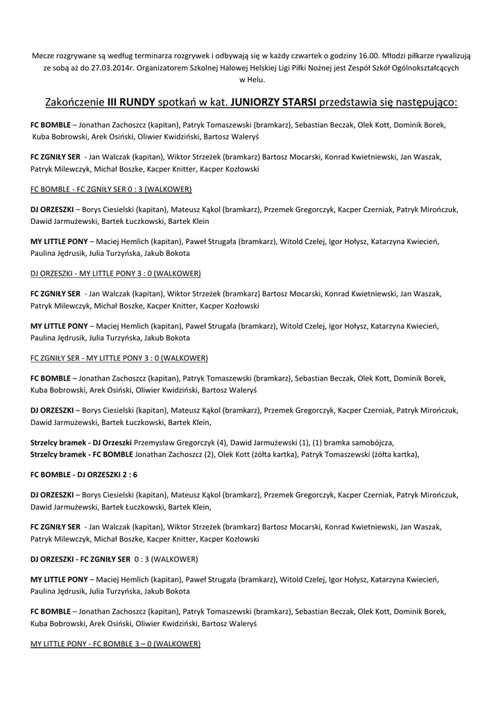 Mecze rozgrywane są według terminarza rozgrywek i odbywają się w każdy czwartek o godziny 16.00. Młodzi piłkarze rywalizują ze sobą aż do 27.03.2014r. Organizatorem Szkolnej Halowej Helskiej Ligi Piłki Nożnej jest Zespół Szkół Ogólnokształcących w Helu. Zakończenie III RUNDY spotkań w kat. JUNIORZY STARSI przedstawia się następująco: FC BOMBLE – Jonathan Zachoszcz (kapitan), Patryk Tomaszewski (bramkarz), Sebastian Beczak, Olek Kott, Dominik Borek, Kuba Bobrowski, Arek Osiński, Oliwier Kwidziński, Bartosz Waleryś FC ZGNIŁY SER - Jan Walczak (kapitan), Wiktor Strzeżek (bramkarz) Bartosz Mocarski, Konrad Kwietniewski, Jan Waszak, Patryk Milewczyk, Michał Boszke, Kacper Knitter, Kacper Kozłowski FC BOMBLE - FC ZGNIŁY SER 0 : 3 (WALKOWER) DJ ORZESZKI – Borys Ciesielski (kapitan), Mateusz Kąkol (bramkarz), Przemek Gregorczyk, Kacper Czerniak, Patryk Mirończuk, Dawid Jarmużewski, Bartek Łuczkowski, Bartek Klein MY LITTLE PONY – Maciej Hemlich (kapitan), Paweł Strugała (bramkarz), Witold Czelej, Igor Hołysz, Katarzyna Kwiecień, Paulina Jędrusik, Julia Turzyńska, Jakub Bokota DJ ORZESZKI - MY LITTLE PONY 3 : 0 (WALKOWER) FC ZGNIŁY SER - Jan Walczak (kapitan), Wiktor Strzeżek (bramkarz) Bartosz Mocarski, Konrad Kwietniewski, Jan Waszak, Patryk Milewczyk, Michał Boszke, Kacper Knitter, Kacper Kozłowski MY LITTLE PONY – Maciej Hemlich (kapitan), Paweł Strugała (bramkarz), Witold Czelej, Igor Hołysz, Katarzyna Kwiecień, Paulina Jędrusik, Julia Turzyńska, Jakub Bokota FC ZGNIŁY SER - MY LITTLE PONY 3 : 0 (WALKOWER) FC BOMBLE – Jonathan Zachoszcz (kapitan), Patryk Tomaszewski (bramkarz), Sebastian Beczak, Olek Kott, Dominik Borek, Kuba Bobrowski, Arek Osiński, Oliwier Kwidziński, Bartosz Waleryś DJ ORZESZKI – Borys Ciesielski (kapitan), Mateusz Kąkol (bramkarz), Przemek Gregorczyk, Kacper Czerniak, Patryk Mirończuk, Dawid Jarmużewski, Bartek Łuczkowski, Bartek Klein, Strzelcy bramek - DJ Orzeszki Przemysław Gregorczyk (4), Dawid Jarmużewski (1), (1) bramka samobójcza, Strzelcy bramek - FC BOMBLE Jonathan Zachoszcz (2), Olek Kott (żółta kartka), Patryk Tomaszewski (żółta kartka), FC BOMBLE - DJ ORZESZKI 2 : 6 DJ ORZESZKI – Borys Ciesielski (kapitan), Mateusz Kąkol (bramkarz), Przemek Gregorczyk, Kacper Czerniak, Patryk Mirończuk, Dawid Jarmużewski, Bartek Łuczkowski, Bartek Klein, FC ZGNIŁY SER - Jan Walczak (kapitan), Wiktor Strzeżek (bramkarz) Bartosz Mocarski, Konrad Kwietniewski, Jan Waszak, Patryk Milewczyk, Michał Boszke, Kacper Knitter, Kacper Kozłowski DJ ORZESZKI - FC ZGNIŁY SER 0 : 3 (WALKOWER) MY LITTLE PONY – Maciej Hemlich (kapitan), Paweł Strugała (bramkarz), Witold Czelej, Igor Hołysz, Katarzyna Kwiecień, Paulina Jędrusik, Julia Turzyńska, Jakub Bokota FC BOMBLE – Jonathan Zachoszcz (kapitan), Patryk Tomaszewski (bramkarz), Sebastian Beczak, Olek Kott, Dominik Borek, Kuba Bobrowski, Arek Osiński, Oliwier Kwidziński, Bartosz Waleryś MY LITTLE PONY - FC BOMBLE 3 – 0 (WALKOWER) TABELA WYNIKÓW Nazwa drużyny Liczba spotkań pkt Bramki Z R P 1. FC ZGNIŁY SER 9 27 28 - 1 9 0 0 2. DJ ORZESZKI 9 12 9 – 17 4 0 5 3. FC BOMBLE 9 9 8 - 14 3 0 6 4. MY LITTLE PONY 9 6 0 - 12 2 0 7