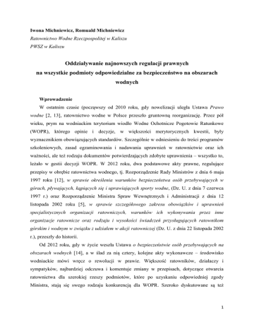Iwona Michniewicz, Romuald Michniewicz Ratownictwo Wodne Rzeczpospolitej w Kaliszu PWSZ w Kaliszu Oddziaływanie najnowszych regulacji prawnych na wszystkie podmioty odpowiedzialne za bezpieczeństwo na obszarach wodnych Wprowadzenie W ostatnim czasie (począwszy od 2010 roku, gdy nowelizacji uległa Ustawa Prawo wodne [2, 13], ratownictwo wodne w Polsce przeszło gruntowną reorganizację. Przez pół wieku, prym na wodniackim terytorium wiodło Wodne Ochotnicze Pogotowie Ratunkowe (WOPR), którego opinie i decyzje, w większości merytorycznych kwestii, były wyznacznikiem obowiązujących standardów. Szczególnie w odniesieniu do treści programów szkoleniowych, zasad egzaminowania i nadawania uprawnień w ratownictwie oraz ich ważności, ale też rodzaju dokumentów potwierdzających zdobyte uprawnienia – wszystko to, leżało w gestii decyzji WOPR. W 2012 roku, dwa podstawowe akty prawne, regulujące przepisy w obrębie ratownictwa wodnego, tj. Rozporządzenie Rady Ministrów z dnia 6 maja 1997 roku [12], w sprawie określenia warunków bezpieczeństwa osób przebywających w górach, pływających, kąpiących się i uprawiających sporty wodne, (Dz. U. z dnia 7 czerwca 1997 r.) oraz Rozporządzenie Ministra Spraw Wewnętrznych i Administracji z dnia 12 listopada 2002 roku [5], w sprawie szczegółowego zakresu obowiązków i uprawnień specjalistycznych organizacji ratowniczych, warunków ich wykonywania przez inne organizacje ratownicze oraz rodzaju i wysokości świadczeń przysługujących ratownikom górskim i wodnym w związku z udziałem w akcji ratowniczej (Dz. U. z dnia 22 listopada 2002 r.), przeszły do historii. Od 2012 roku, gdy w życie weszła Ustawa o bezpieczeństwie osób przebywających na obszarach wodnych [14], a w ślad za nią cztery, kolejne akty wykonawcze – środowisko wodniackie mówi wręcz o rewolucji w prawie. Większość ratowników, działaczy i sympatyków, najbardziej odczuwa i komentuje zmiany w przepisach, dotyczące otwarcia ratownictwa dla szerokiej rzeszy podmiotów, które po uzyskaniu odpowiedniej zgody Ministra, stają się swego rodzaju konkurencją dla WOPR. Szeroko dyskutowane są też 1 kwestie związane z nowościami wprowadzonymi do szkolenia i certyfikowania ratowników wodnych i instruktorów. Jednak niezwykle istotne zmiany, dotyczą także pozostałych ogniw, np. samorządów czy przeciętnych obywateli (osób korzystających z kąpieli). Cel pracy Niniejsza wypowiedź służy temu, by wskazać istotne kwestie, dotychczas inaczej określone prawnie – z uwzględnieniem praw, przywilejów i obowiązków właścicieli, organizatorów i dysponentów różnych akwenów wodnych; ratowników i organizacji wykonujących ratownictwo wodne oraz osób przebywających na obszarach wodnych. Materiał i metody badań Materiał stanowią wcześniej i obecnie obowiązujące akty prawne, regulujące całą dziedzinę (życia i nauki), dotyczącą bezpieczeństwa na obszarach wodnych, a także artykuły naukowe i korespondencja prowadzona pomiędzy Ratownictwem Wodnym Rzeczpospolitej i Ministerstwem Spraw Wewnętrznych [4]. Zastosowana metoda, to analiza porównawcza, dzięki której można lepiej zrozumieć wprowadzone zmiany, a także interpretować zawiłe przepisy. Zmiany w prawie, dotyczącym ratownictwa wodnego Po raz pierwszy, dookreślenia niektórych definicji w obrębie ratownictwa wodnego, dokonano w znowelizowanej (w 2010 roku) Ustawie Prawo wodne [13], która stała się podwaliną do dalszego uszczegółowienia zagadnień, dotyczących bezpieczeństwa osób przebywający na obszarach wodnych. I tak, w art. 9 dodano ust. 5a, wyjaśniający znaczenie kąpieliska; uznając, że rozumie się przez to wyznaczony uchwałą rady gminy, wydzielony i oznakowany fragment wód powierzchniowych, wykorzystywany przez dużą liczbę osób kąpiących się, określoną w uchwale rady gminy w sprawie wykazu kąpielisk, pod warunkiem że w stosunku do tego kąpieliska nie wydano stałego zakazu kąpieli; kąpieliskiem nie jest: basen pływacki, basen uzdrowiskowy, zamknięty zbiornik wodny podlegający oczyszczaniu lub wykorzystywaniu w celach terapeutycznych, sztuczny, zamknięty zbiornik wodny, oddzielony od wód powierzchniowych i wód podziemnych. Pojawia się zatem obowiązek organu samorządowego – rady gminy, która musi podjąć odpowiednie uchwały w tej materii. 2 W ust. 5c, wyjaśnia się znaczenie miejsca wykorzystywanego do kąpieli; uznając, że rozumie się przez to wydzielony i oznakowany fragment wód powierzchniowych, niebędący kąpieliskiem i wykorzystywany do kąpieli. Można mniemać, że ten zapis miał wypełnić lukę po wcześniejszym [12] akcie prawnym, gdzie poza kąpieliskiem zorganizowanym, było także kąpielisko prowizoryczne. Jednakże dzisiaj, porównując dalsze wymagania stawiane przed tymi dwoma rodzajami miejsc do kąpieli, trudno uznać wyższość któregokolwiek z nich nad drugim. Obecnie, kąpielisko musi być wyposażone w [8]: 1) ratowniczą łódź motorową – jedna na każde 400 m linii brzegowej; 2) ratowniczą łódź wiosłową – jedna na każde 100 m linii brzegowej; 3) koło ratunkowe z nietonącą linką o długości 25 m lub pasy ratownicze – jedna sztuka na każde 50 m linii brzegowej, umieszczone w pobliżu lustra wody; 4) żerdzie ratunkowe na kąpieliskach posiadających pomosty stałe lub pływające – dwie sztuki; 5) liny asekuracyjne o długości minimum 80 m na kołowrotku lub w zasobniku linowym – jedna na każde 100 m linii brzegowej; 6) tubę głosową elektroakustyczną na każdym stanowisku ratowniczym; 7) tablicę do zamieszczania informacji o temperaturze wody i powietrza, szybkości wiatru oraz wysokości fali; 8) akustyczny sygnał alarmowy typu gwizdek, gong, dzwon lub syrena – po jednej sztuce na każdym stanowisku ratowniczym; 9) środki łączności między stanowiskami ratowniczymi; 10) rzutki ratunkowe – po jednej sztuce dla każdego ratownika wodn